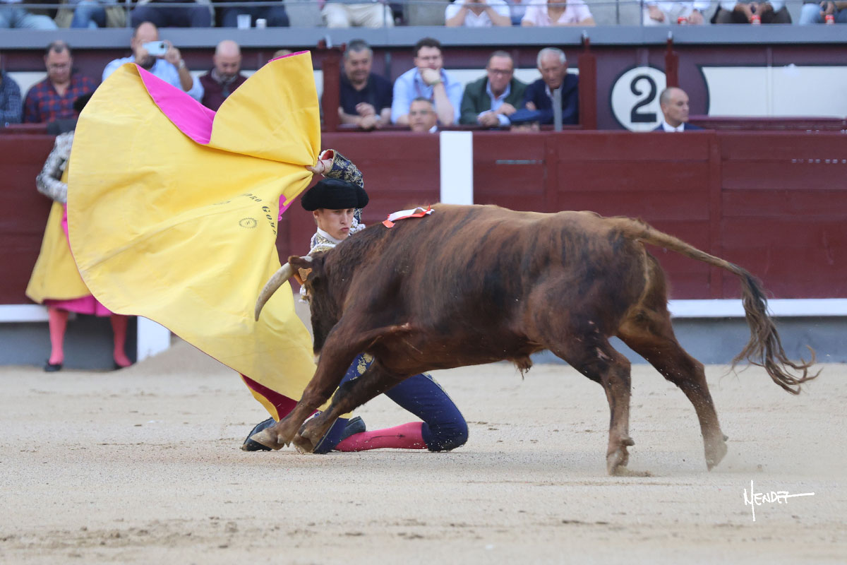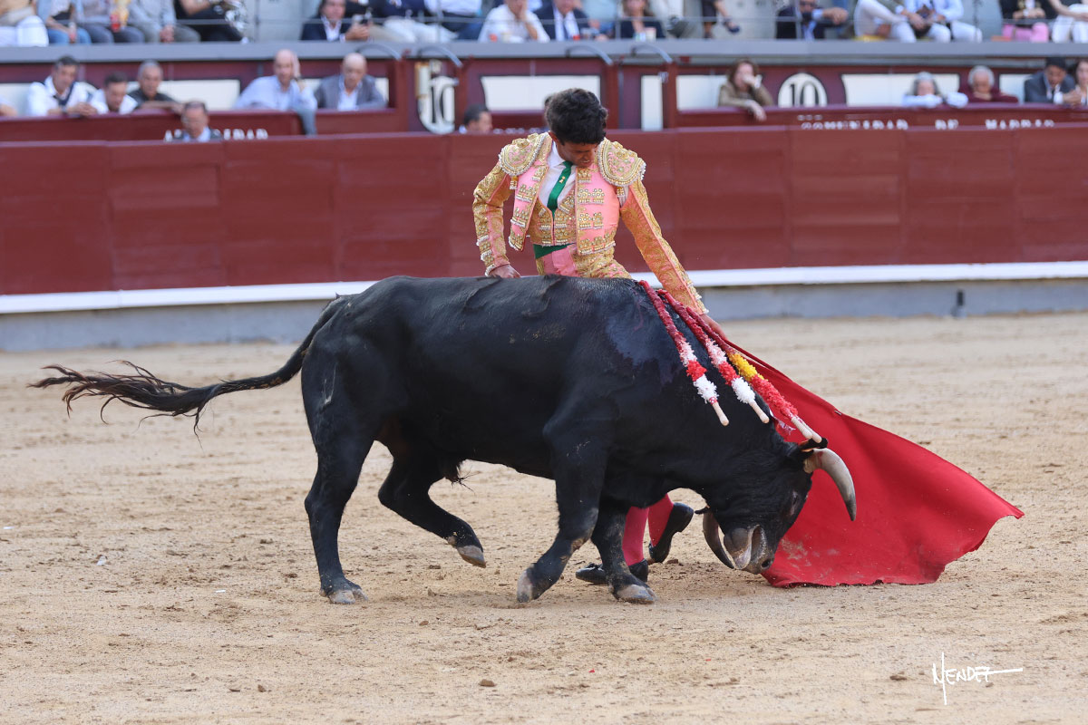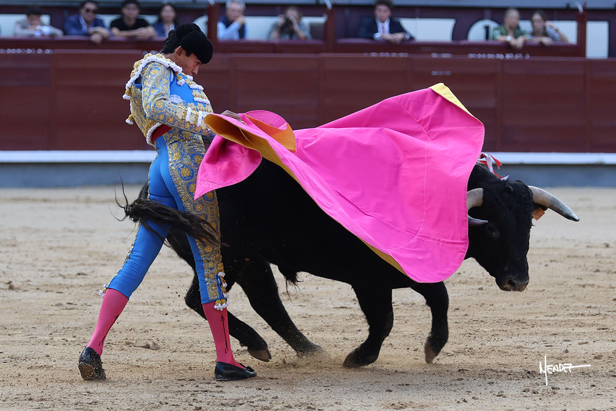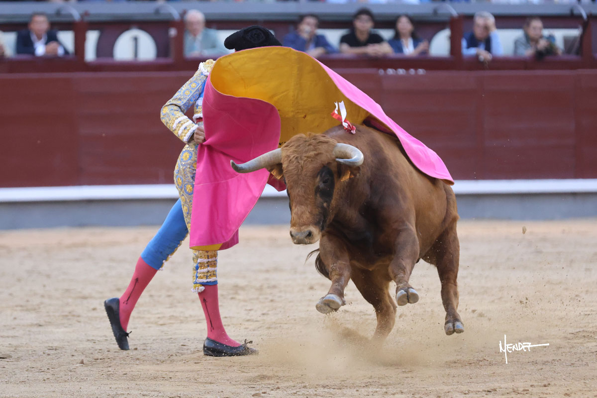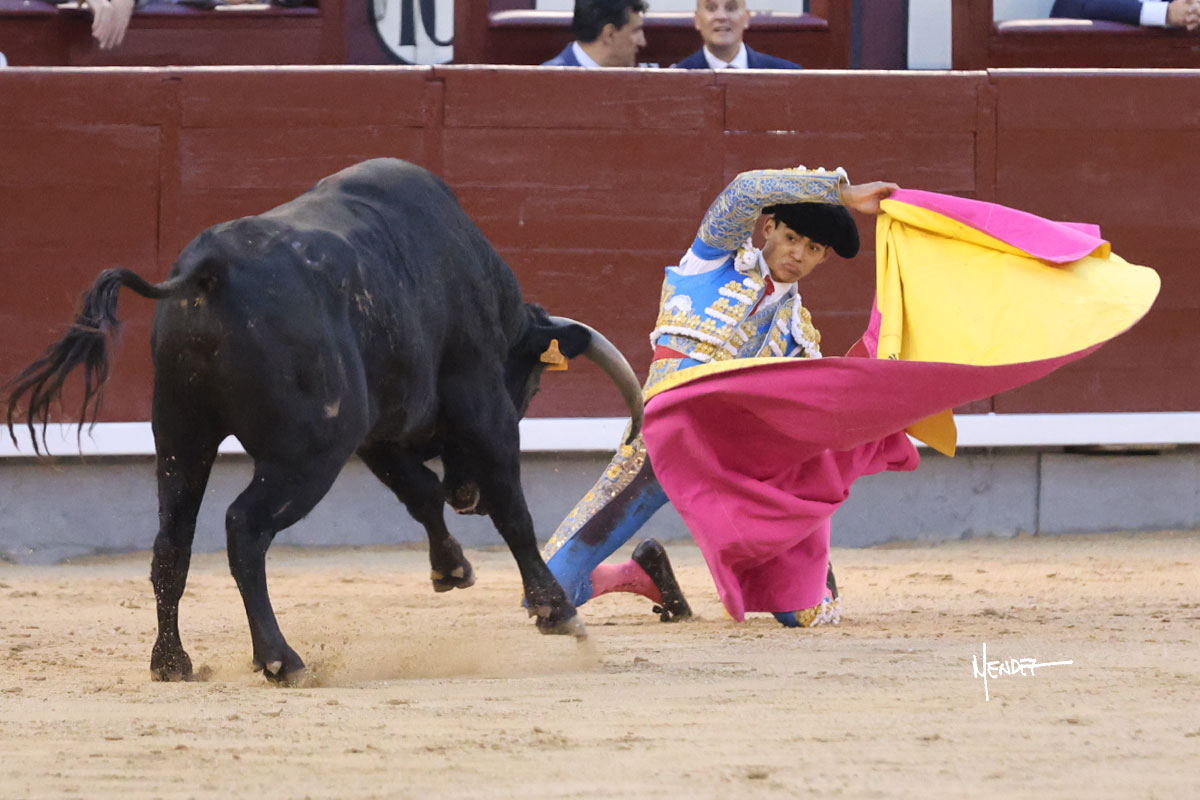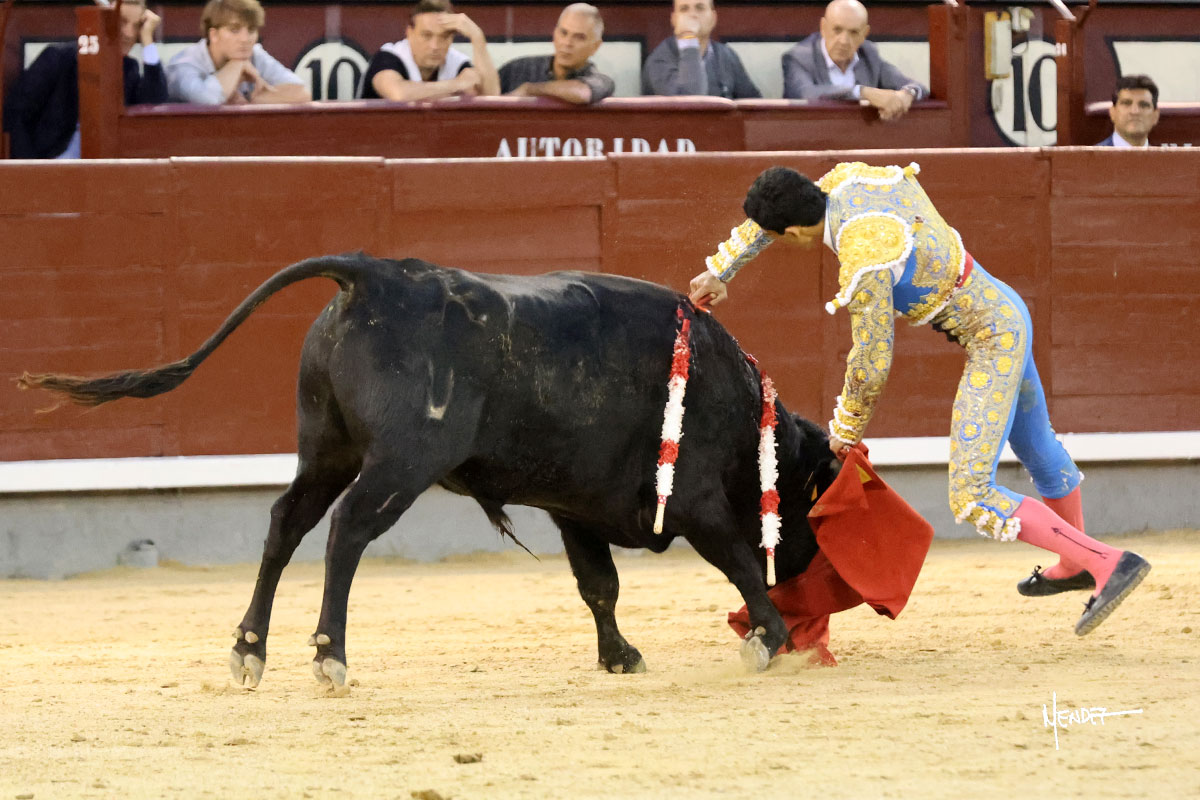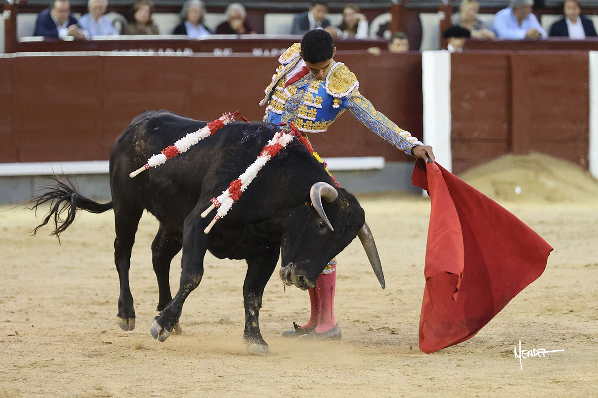 Ignacio Garibay saludó al primero de su lote y tercero de la tarde genuflexo. El animal salió suelto, pero sin deslucir, logró encelarlo en su capote y llevarlo con variedad, pudiendo estirarse con gusto y elegancia. Después de brindar al respetable, lo recibió desde los medios, a pies juntos, citándolo en la larga distancia. Lo pasó sin rectificar ni un solo centímetro, desarrollando un inicio explosivo. Continuó en aquellos terrenos, midiendo las embestidas, buscando el acople sobre el pitón derecho, corriéndole la mano con gusto y mucha suavidad. Sin embargo, el animal cabeceaba, mostrando una embestida incómoda y con la que además lo desarmó. Garibay continuó con firmeza y seguridad, encajándose para envolvérselo al natural, pasándoselo muy cerca. Volvió a armar la muleta, teniendo que tocar con poder y mando a un novillo que cada vez miraba más y se quedaba más parado. No fue el mejor novillo, pero el mexicano se puso como si fuera bueno, pisando terrenos comprometidos.
