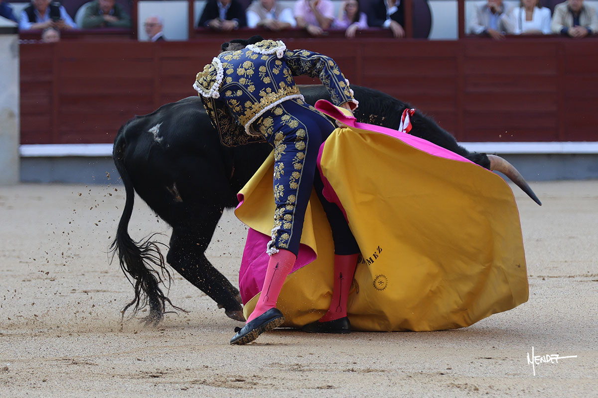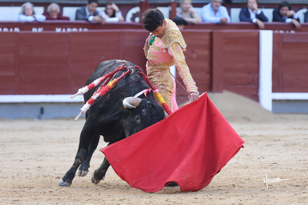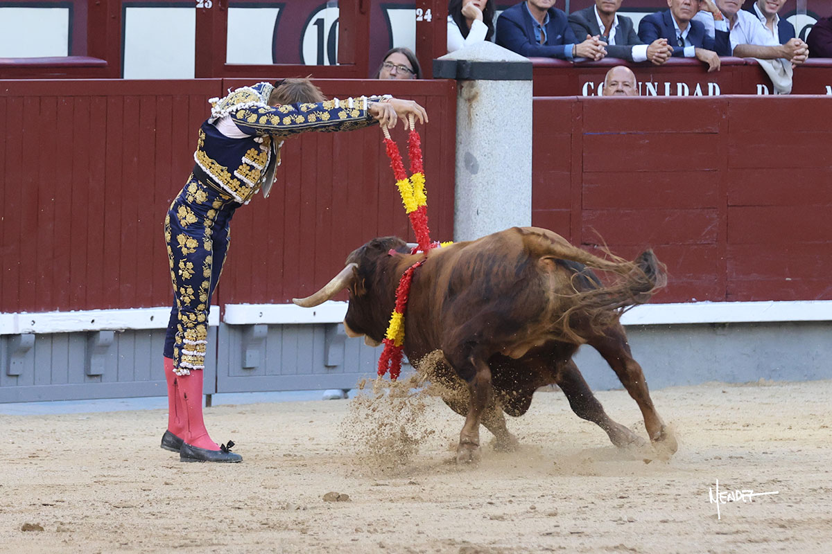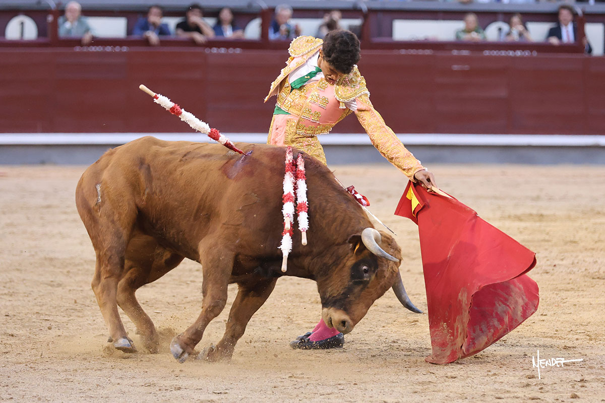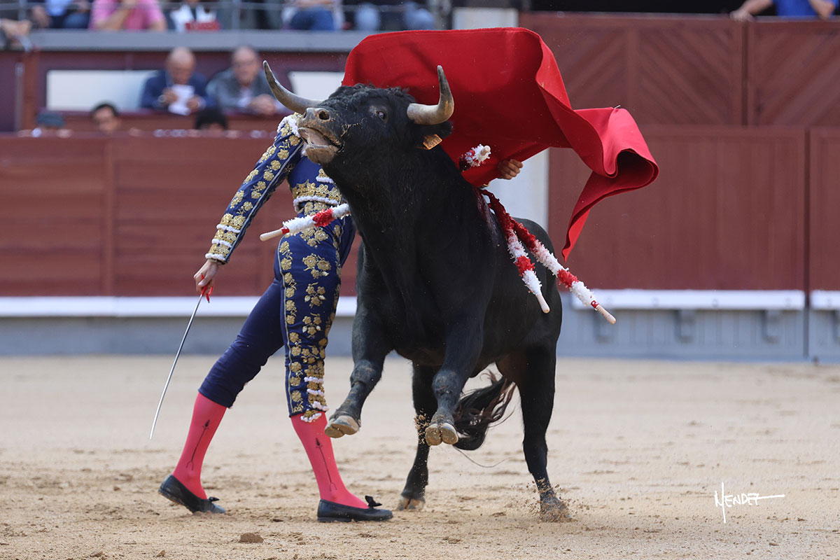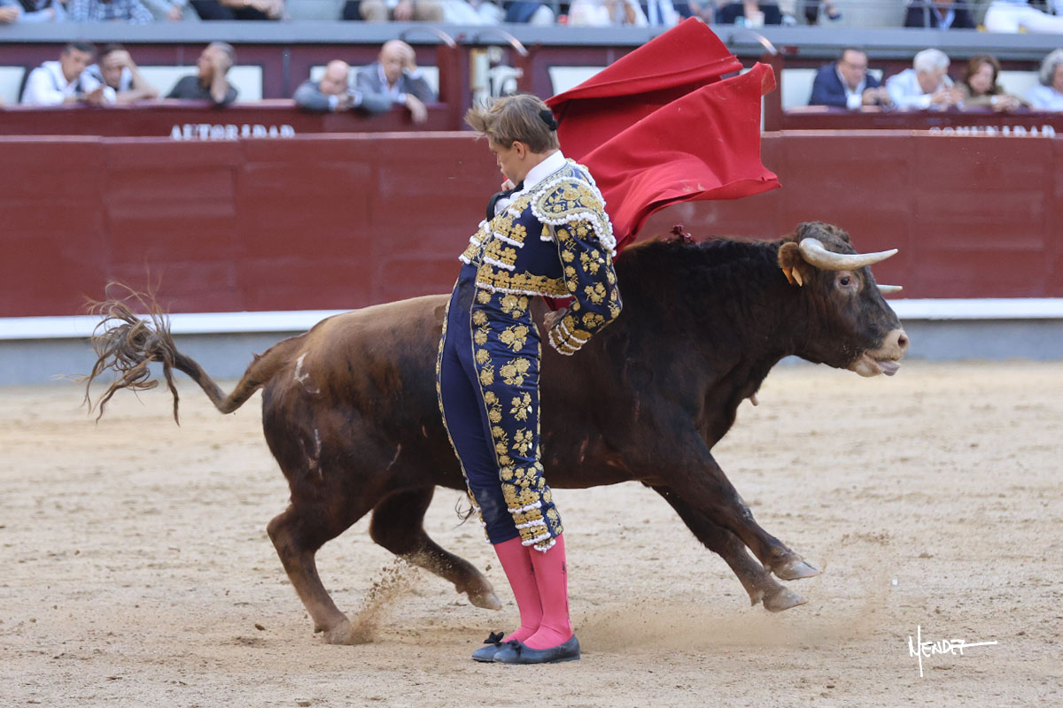 Ignacio Garibay saludó al primero de su lote y tercero de la tarde genuflexo. El animal salió suelto, pero sin deslucir, logró encelarlo en su capote y llevarlo con variedad, pudiendo estirarse con gusto y elegancia. Después de brindar al respetable, lo recibió desde los medios, a pies juntos, citándolo en la larga distancia. Lo pasó sin rectificar ni un solo centímetro, desarrollando un inicio explosivo. Continuó en aquellos terrenos, midiendo las embestidas, buscando el acople sobre el pitón derecho, corriéndole la mano con gusto y mucha suavidad. Sin embargo, el animal cabeceaba, mostrando una embestida incómoda y con la que además lo desarmó. Garibay continuó con firmeza y seguridad, encajándose para envolvérselo al natural, pasándoselo muy cerca. Volvió a armar la muleta, teniendo que tocar con poder y mando a un novillo que cada vez miraba más y se quedaba más parado. No fue el mejor novillo, pero el mexicano se puso como si fuera bueno, pisando terrenos comprometidos.