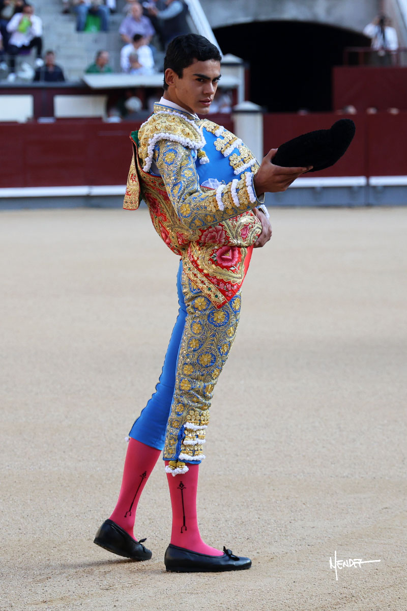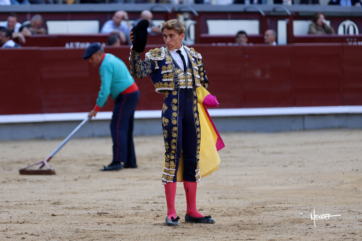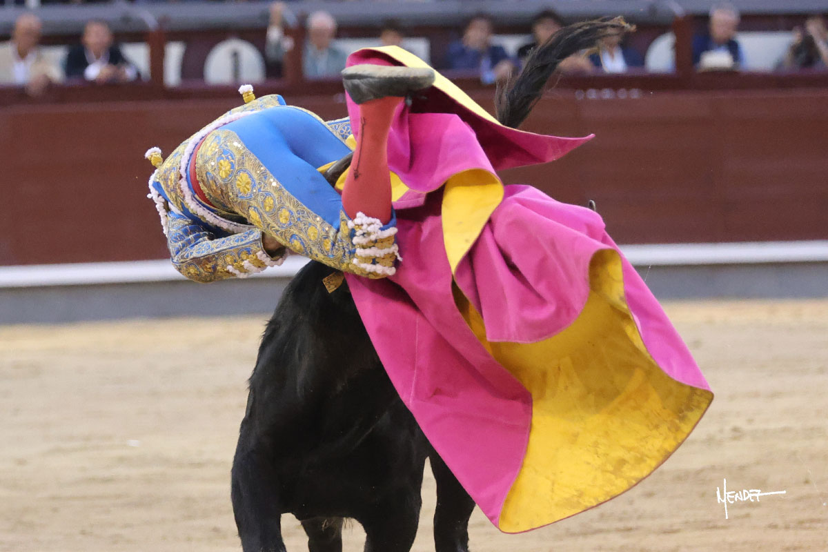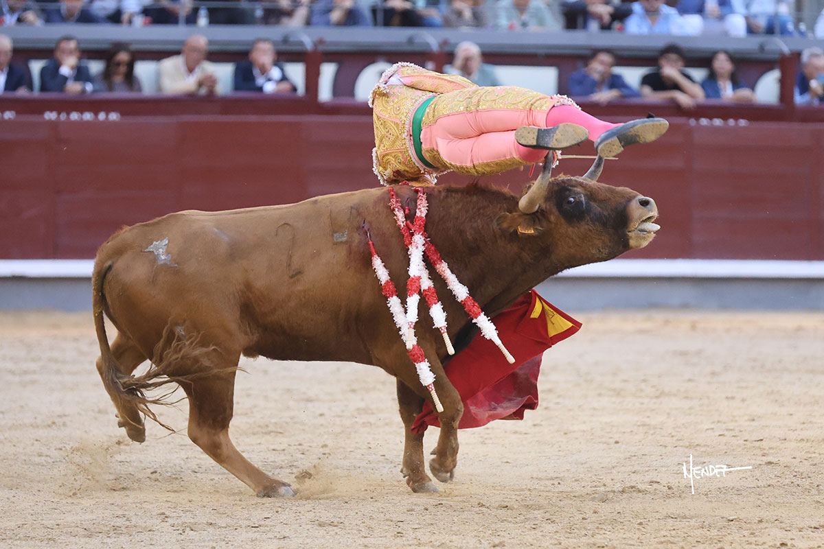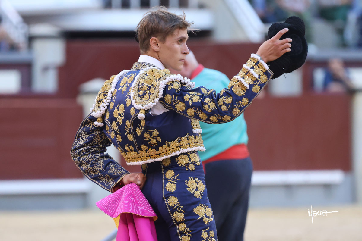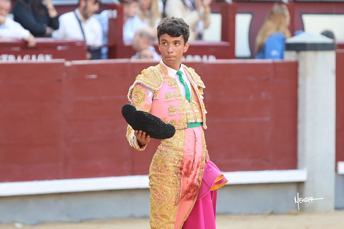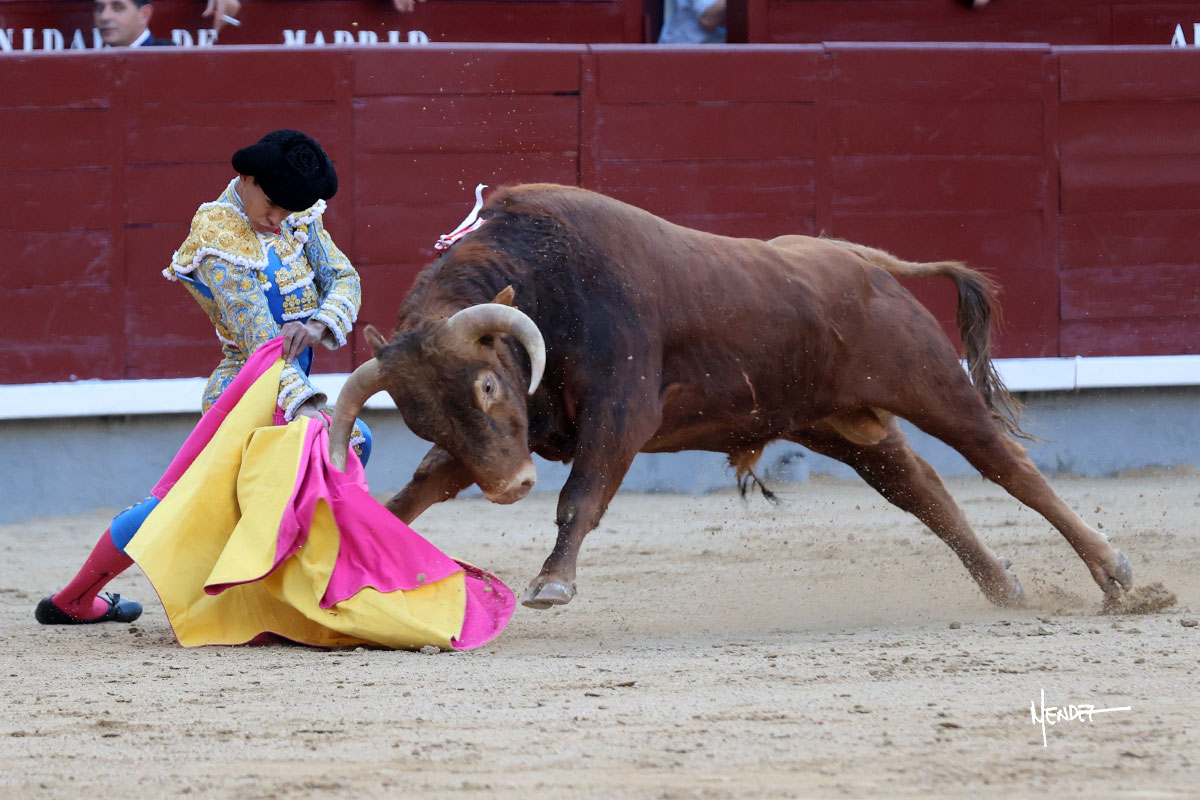 Ignacio Garibay saludó al primero de su lote y tercero de la tarde genuflexo. El animal salió suelto, pero sin deslucir, logró encelarlo en su capote y llevarlo con variedad, pudiendo estirarse con gusto y elegancia. Después de brindar al respetable, lo recibió desde los medios, a pies juntos, citándolo en la larga distancia. Lo pasó sin rectificar ni un solo centímetro, desarrollando un inicio explosivo. Continuó en aquellos terrenos, midiendo las embestidas, buscando el acople sobre el pitón derecho, corriéndole la mano con gusto y mucha suavidad. Sin embargo, el animal cabeceaba, mostrando una embestida incómoda y con la que además lo desarmó. Garibay continuó con firmeza y seguridad, encajándose para envolvérselo al natural, pasándoselo muy cerca. Volvió a armar la muleta, teniendo que tocar con poder y mando a un novillo que cada vez miraba más y se quedaba más parado. No fue el mejor novillo, pero el mexicano se puso como si fuera bueno, pisando terrenos comprometidos.