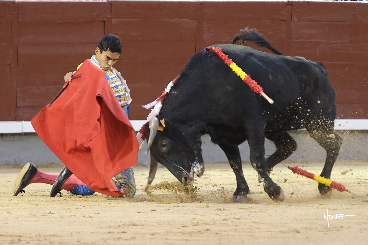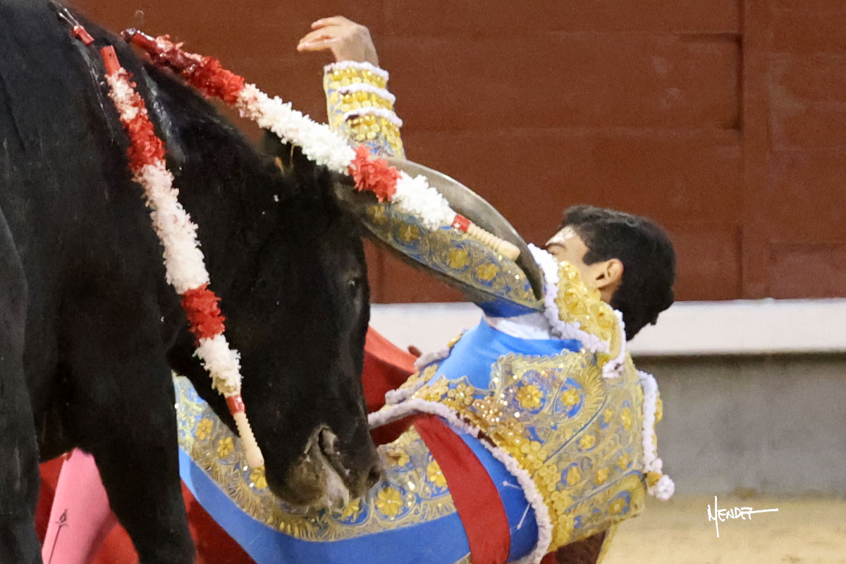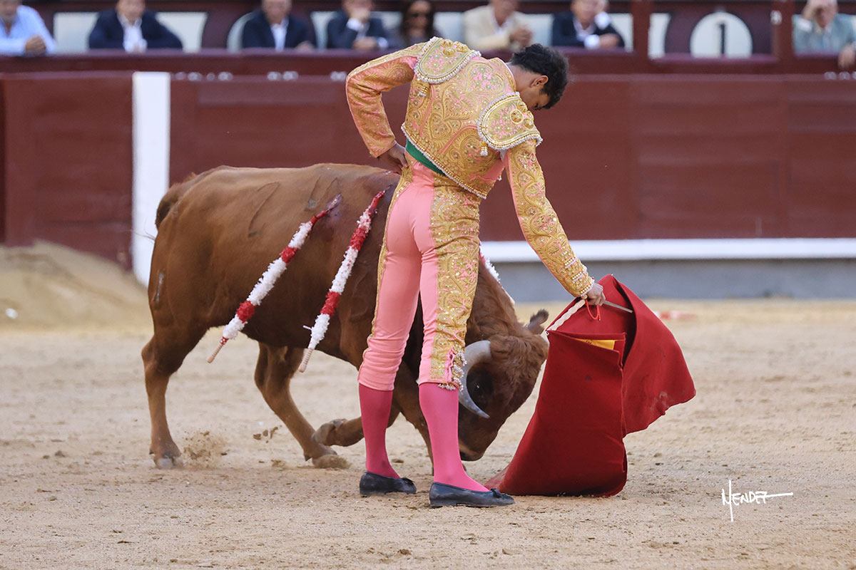 Ignacio Garibay saludó al sexto con tres faroles de rodillas para después levantarse y seguir con variedad, aunque también jugándosela, siendo bruscamente volteado, aunque sin aparentes consecuencias. Se fue a por todas, iniciando la faena de muleta de rodillas ante el novillo más protestado de la tarde. Se le quedó prácticamente encima, pero solventó y siguió rematando aquel inicio. Continuó sobre el derecho bajándole la mano, buscando las distancias ante un eral incierto, corto y sin clase. Tuvo que ordenar y recomponer en cada muletazo y aunque lo mostró al natural, se metía por dentro. Decidió cambiar al pitón derecho, pero aquel ejemplar era el más deslucido de todo el festejo. Garibay le dio tiempo y sitio, lo ayudo y dosificó tratando de volver a meterlo y buscarle las teclas. Sabía que era lo que había, pero se mostró dispuesto, firme y entregado a pesar de las circunstancias, robándole las embestidas, de nuevo por el izquierdo, encajándose y pasándolo con gusto y despaciosidad, al menos todo lo que le permitió el de su lote. Antes de entrar a matar desarrolló una tanda al natural sobre el derecho en la que lo prendió sin aparentes consecuencias. Ignacio Garibay se entregó y dio todo de sí, pero no hubo un oponente. Metió la mano con acierto.