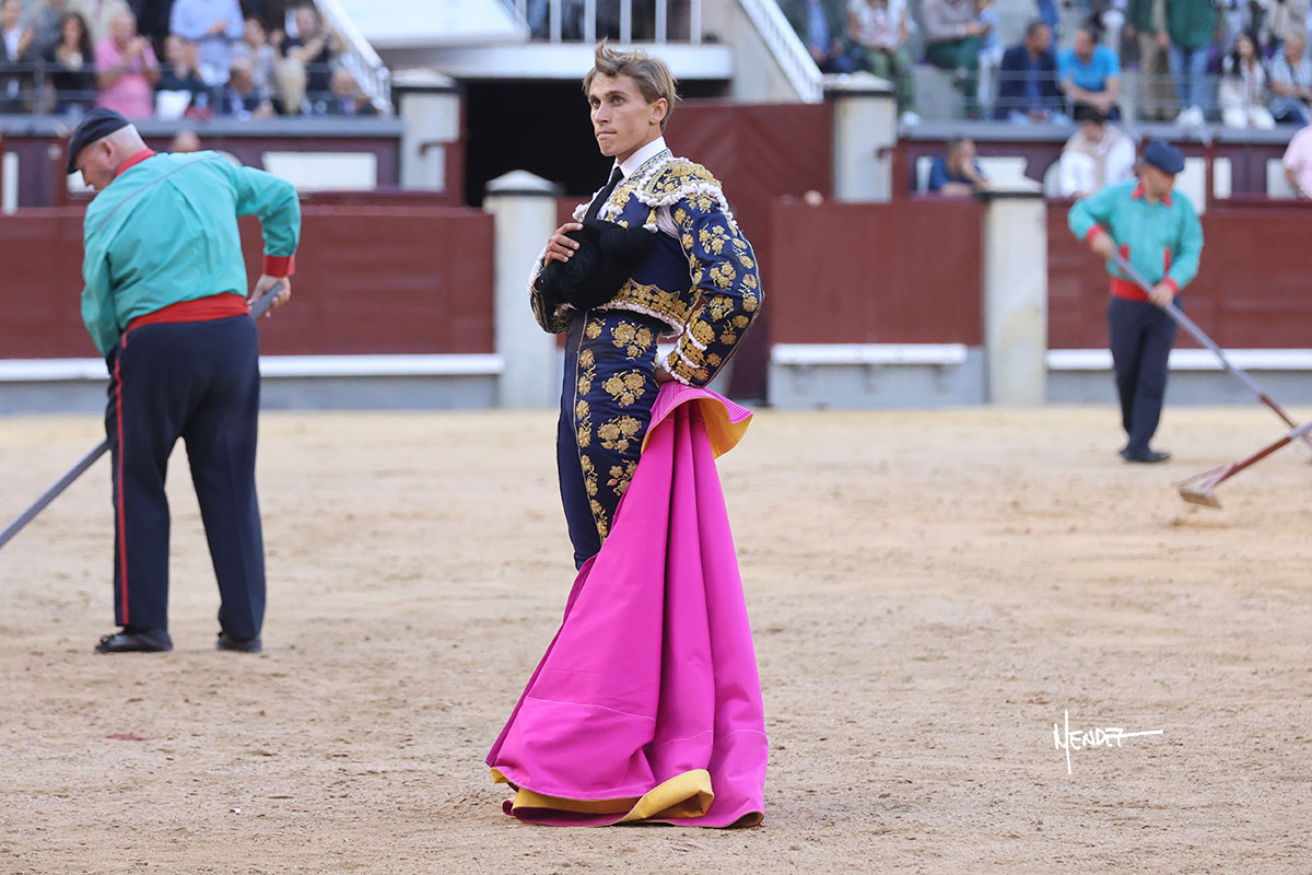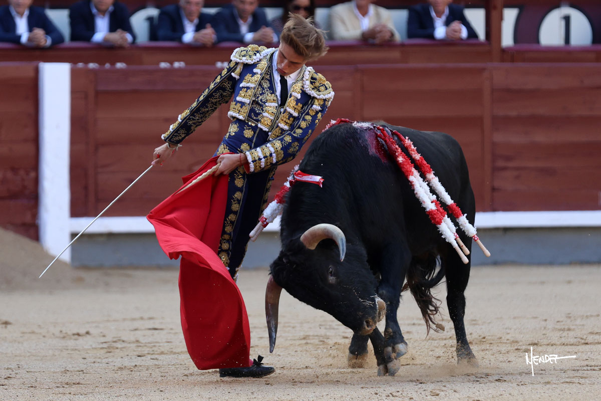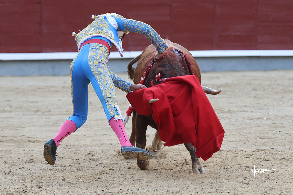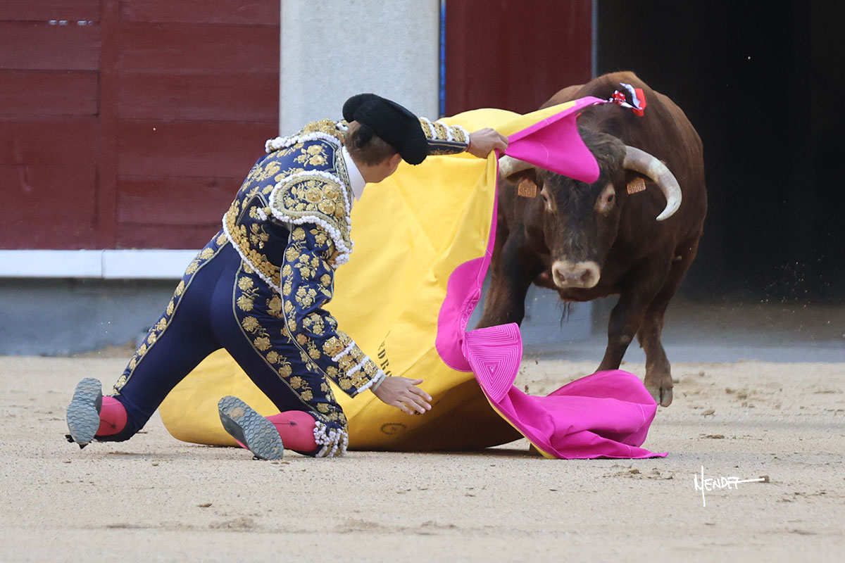 Ignacio Garibay saludó al sexto con tres faroles de rodillas para después levantarse y seguir con variedad, aunque también jugándosela, siendo bruscamente volteado, aunque sin aparentes consecuencias. Se fue a por todas, iniciando la faena de muleta de rodillas ante el novillo más protestado de la tarde. Se le quedó prácticamente encima, pero solventó y siguió rematando aquel inicio. Continuó sobre el derecho bajándole la mano, buscando las distancias ante un eral incierto, corto y sin clase. Tuvo que ordenar y recomponer en cada muletazo y aunque lo mostró al natural, se metía por dentro. Decidió cambiar al pitón derecho, pero aquel ejemplar era el más deslucido de todo el festejo. Garibay le dio tiempo y sitio, lo ayudo y dosificó tratando de volver a meterlo y buscarle las teclas. Sabía que era lo que había, pero se mostró dispuesto, firme y entregado a pesar de las circunstancias, robándole las embestidas, de nuevo por el izquierdo, encajándose y pasándolo con gusto y despaciosidad, al menos todo lo que le permitió el de su lote. Antes de entrar a matar desarrolló una tanda al natural sobre el derecho en la que lo prendió sin aparentes consecuencias. Ignacio Garibay se entregó y dio todo de sí, pero no hubo un oponente. Metió la mano con acierto.