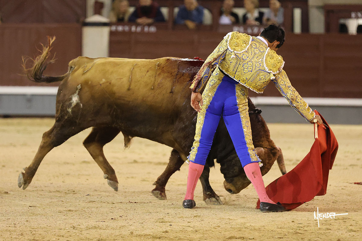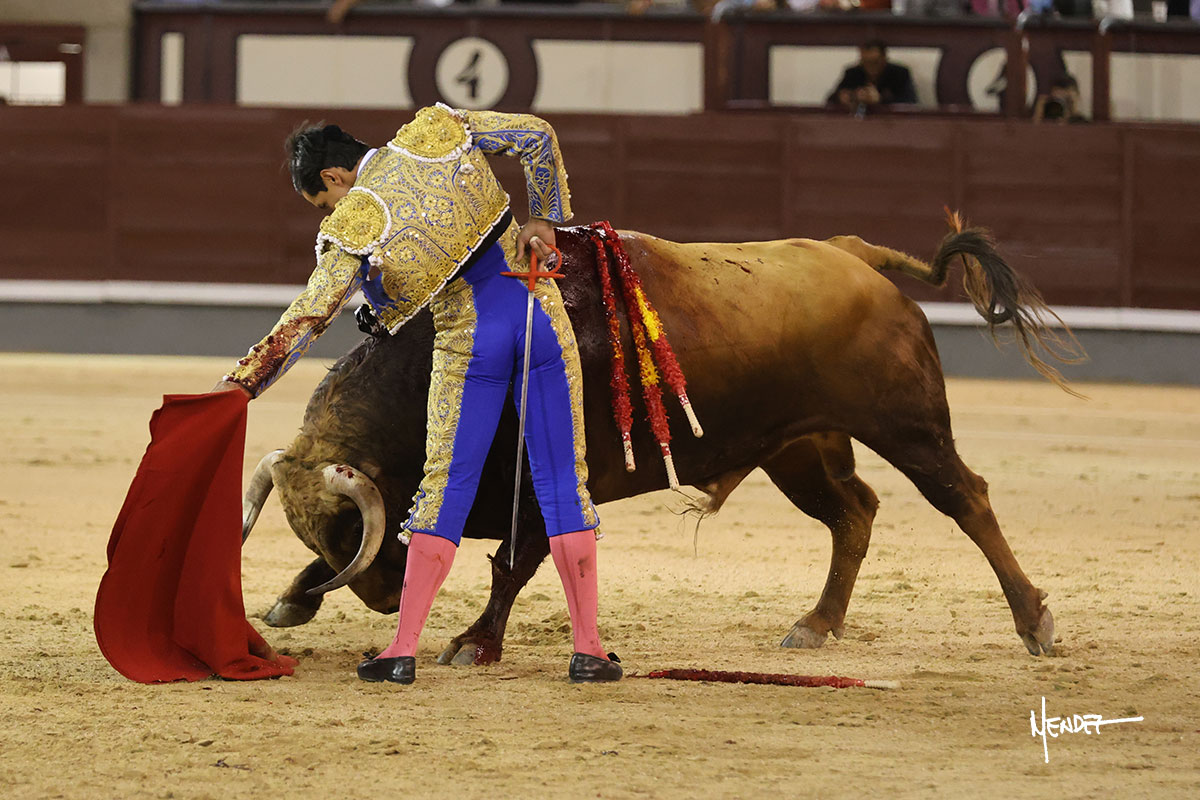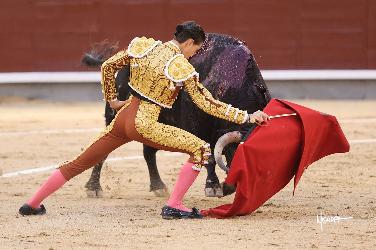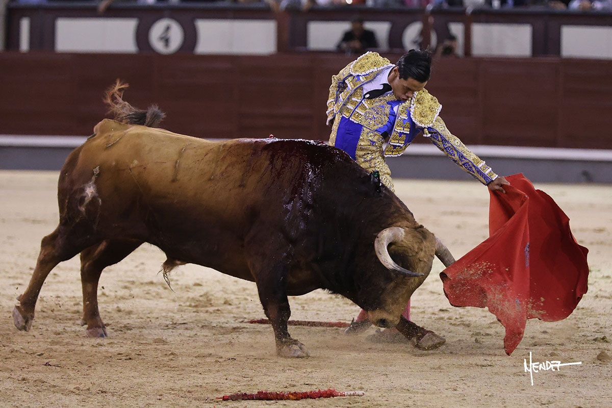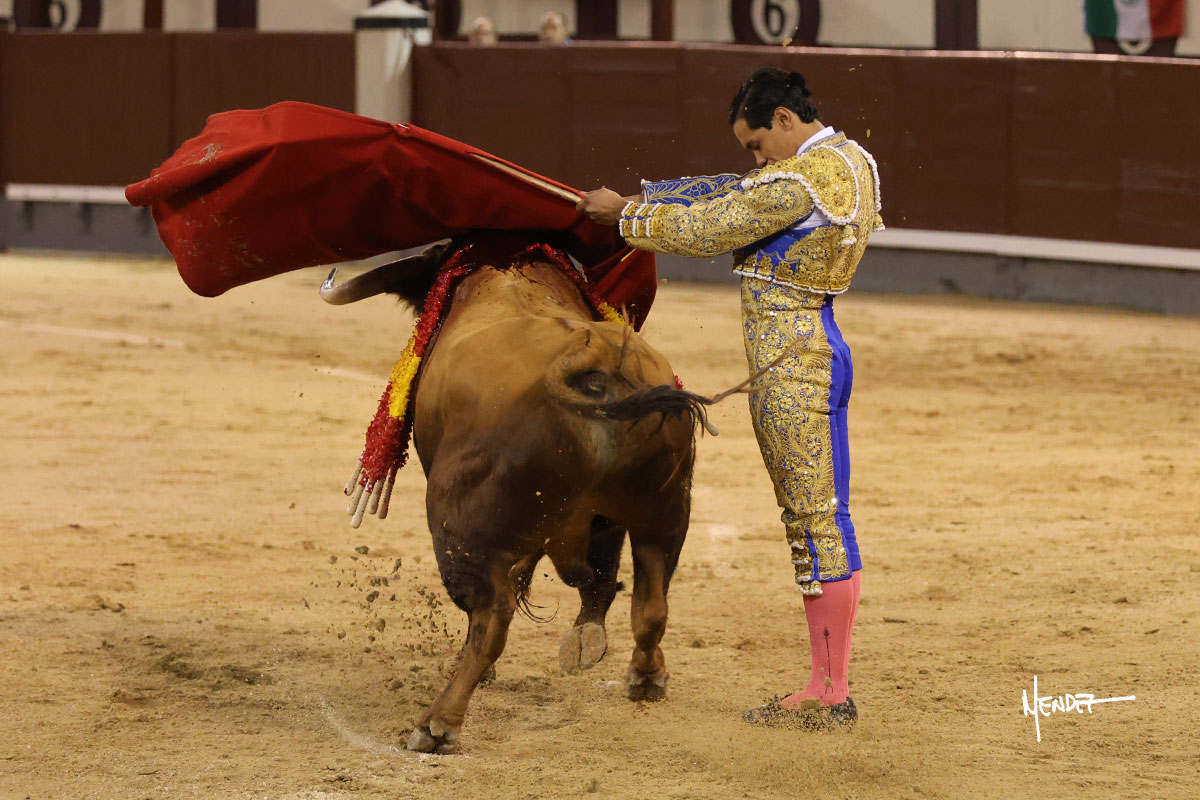 Saludó Bruno al cuarto, lanceándolo, bregando con el para pasarlo con suavidad, cuidando la embestida. Se alcanzó la faena de muleta, pero antes, brindó Bruno desde los medios. Comenzó su labor doblándose con el, sacándolo del tercio, ganándole terreno mientras seguía mostrándolo por abajo. Bruno pedía paciencia tras aquel inicio de teclas. Le dio tiempo y sitio para continuar sobre el derecho de un novillo que ya salía suelto buscando las tablas. El mexicano se puso delante con disposición y firmeza, citándolo en la media distancia para después aprovechar la inercia y tratar de envolvérselo. Sin embargo, llevaba consigo un peligro sordo en las salidas, soltando la cara con brusquedad y buscando el cuerpo. Decidió mostrarlo al natural, echándole los vuelos a la cara, teniendo que sujetarlo para que no se le fuera. Insistió, aún sabiendo que no podía dar más de sí porque no había opciones en su oponente. Se jugó la voltereta, pisó terrenos comprometidos y, finalmente, se la llevó. Aún así, siguió delante estoicamente. Mató con acierto y determinación.