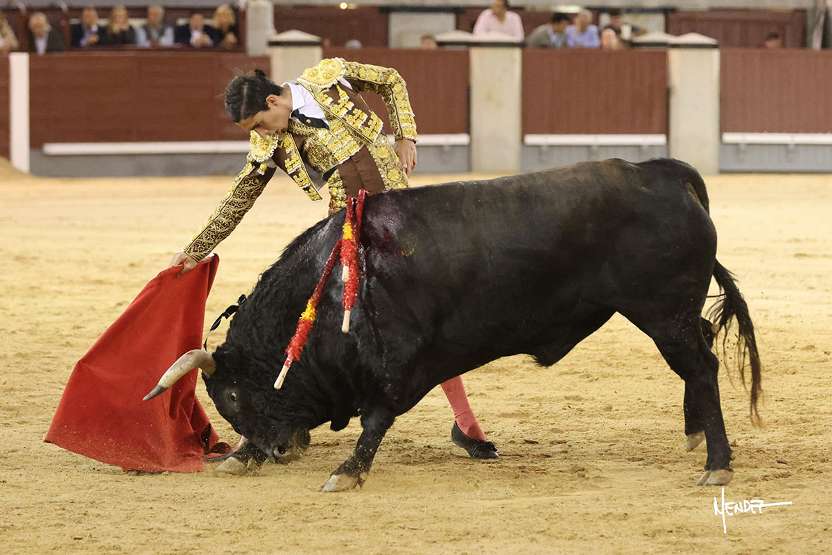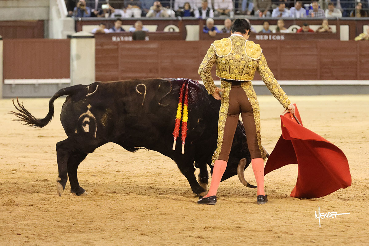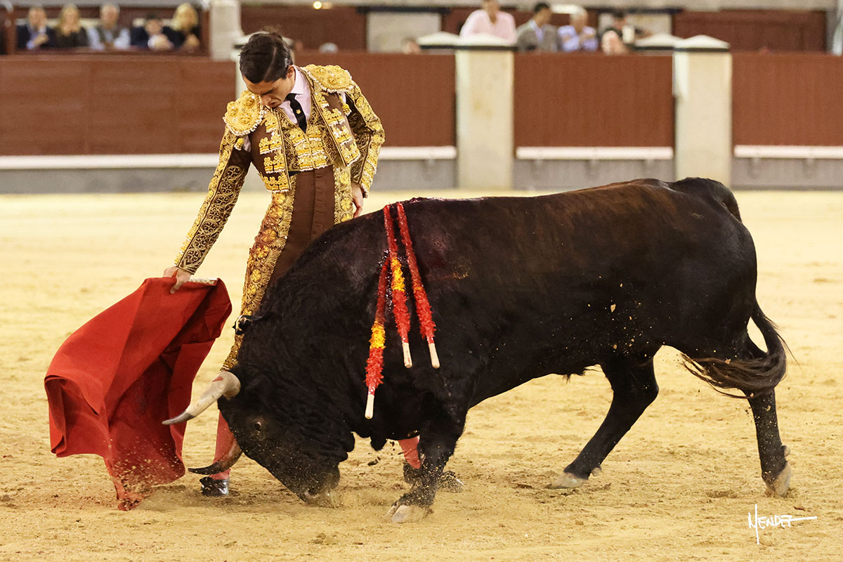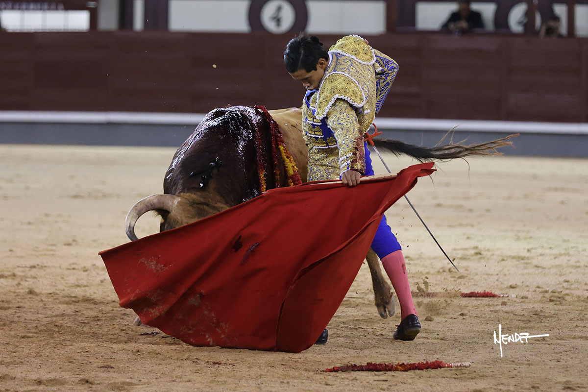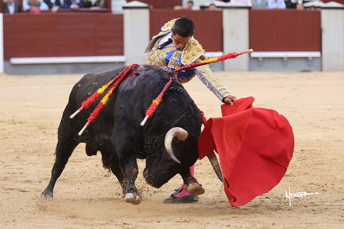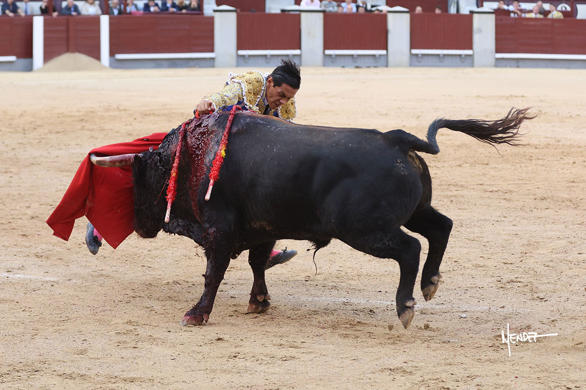 Saludó Bruno al cuarto, lanceándolo, bregando con el para pasarlo con suavidad, cuidando la embestida. Se alcanzó la faena de muleta, pero antes, brindó Bruno desde los medios. Comenzó su labor doblándose con el, sacándolo del tercio, ganándole terreno mientras seguía mostrándolo por abajo. Bruno pedía paciencia tras aquel inicio de teclas. Le dio tiempo y sitio para continuar sobre el derecho de un novillo que ya salía suelto buscando las tablas. El mexicano se puso delante con disposición y firmeza, citándolo en la media distancia para después aprovechar la inercia y tratar de envolvérselo. Sin embargo, llevaba consigo un peligro sordo en las salidas, soltando la cara con brusquedad y buscando el cuerpo. Decidió mostrarlo al natural, echándole los vuelos a la cara, teniendo que sujetarlo para que no se le fuera. Insistió, aún sabiendo que no podía dar más de sí porque no había opciones en su oponente. Se jugó la voltereta, pisó terrenos comprometidos y, finalmente, se la llevó. Aún así, siguió delante estoicamente. Mató con acierto y determinación.