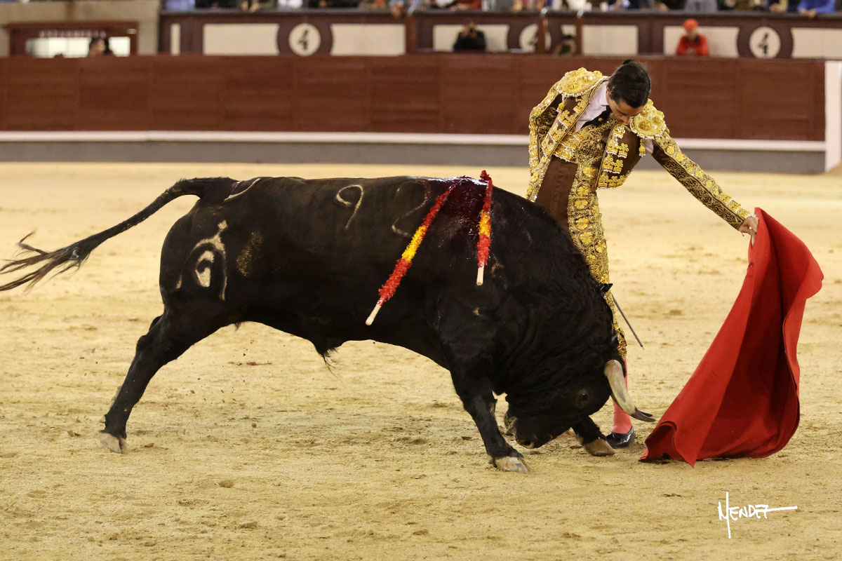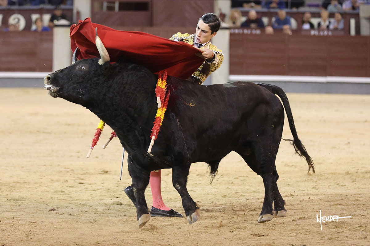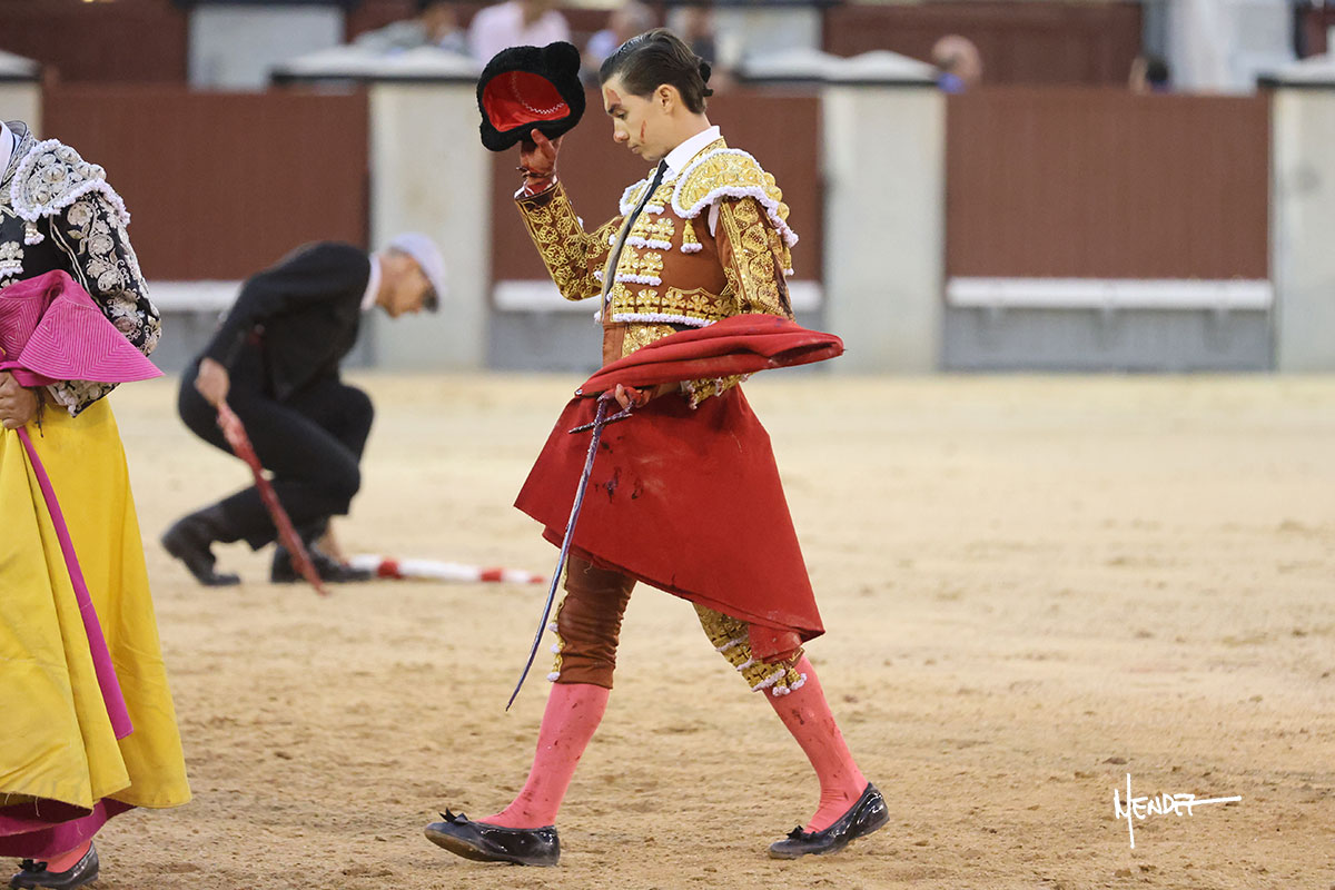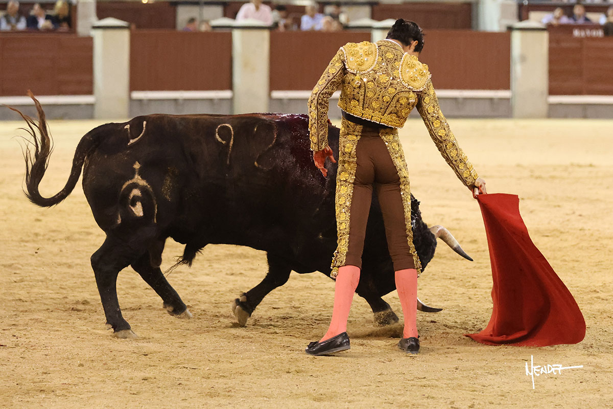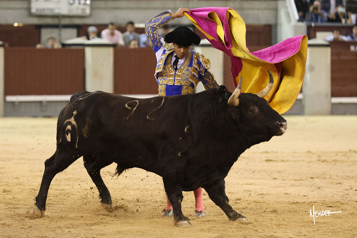 Saludó Bruno al cuarto, lanceándolo, bregando con el para pasarlo con suavidad, cuidando la embestida. Se alcanzó la faena de muleta, pero antes, brindó Bruno desde los medios. Comenzó su labor doblándose con el, sacándolo del tercio, ganándole terreno mientras seguía mostrándolo por abajo. Bruno pedía paciencia tras aquel inicio de teclas. Le dio tiempo y sitio para continuar sobre el derecho de un novillo que ya salía suelto buscando las tablas. El mexicano se puso delante con disposición y firmeza, citándolo en la media distancia para después aprovechar la inercia y tratar de envolvérselo. Sin embargo, llevaba consigo un peligro sordo en las salidas, soltando la cara con brusquedad y buscando el cuerpo. Decidió mostrarlo al natural, echándole los vuelos a la cara, teniendo que sujetarlo para que no se le fuera. Insistió, aún sabiendo que no podía dar más de sí porque no había opciones en su oponente. Se jugó la voltereta, pisó terrenos comprometidos y, finalmente, se la llevó. Aún así, siguió delante estoicamente. Mató con acierto y determinación.