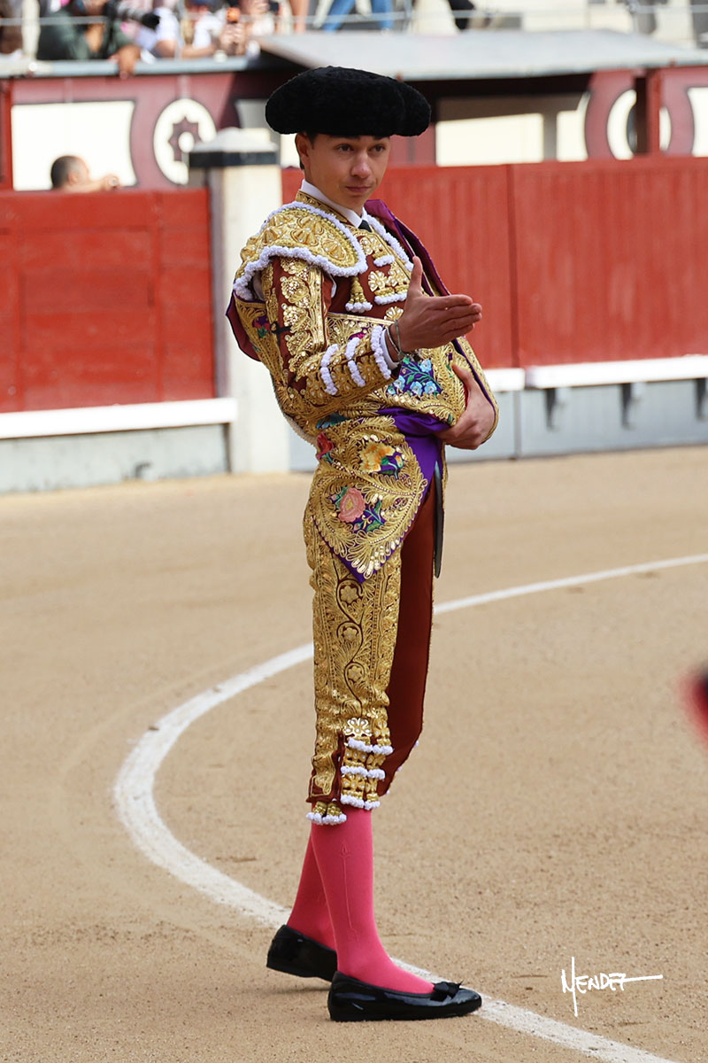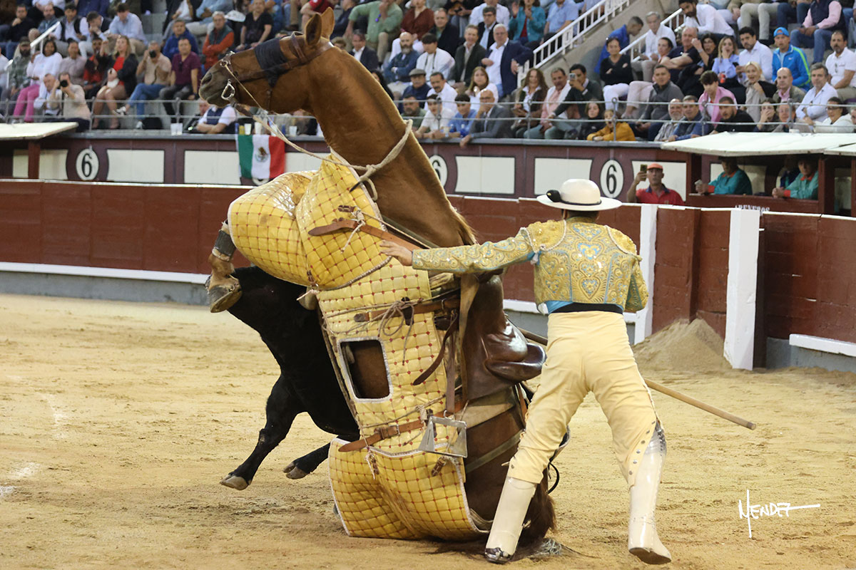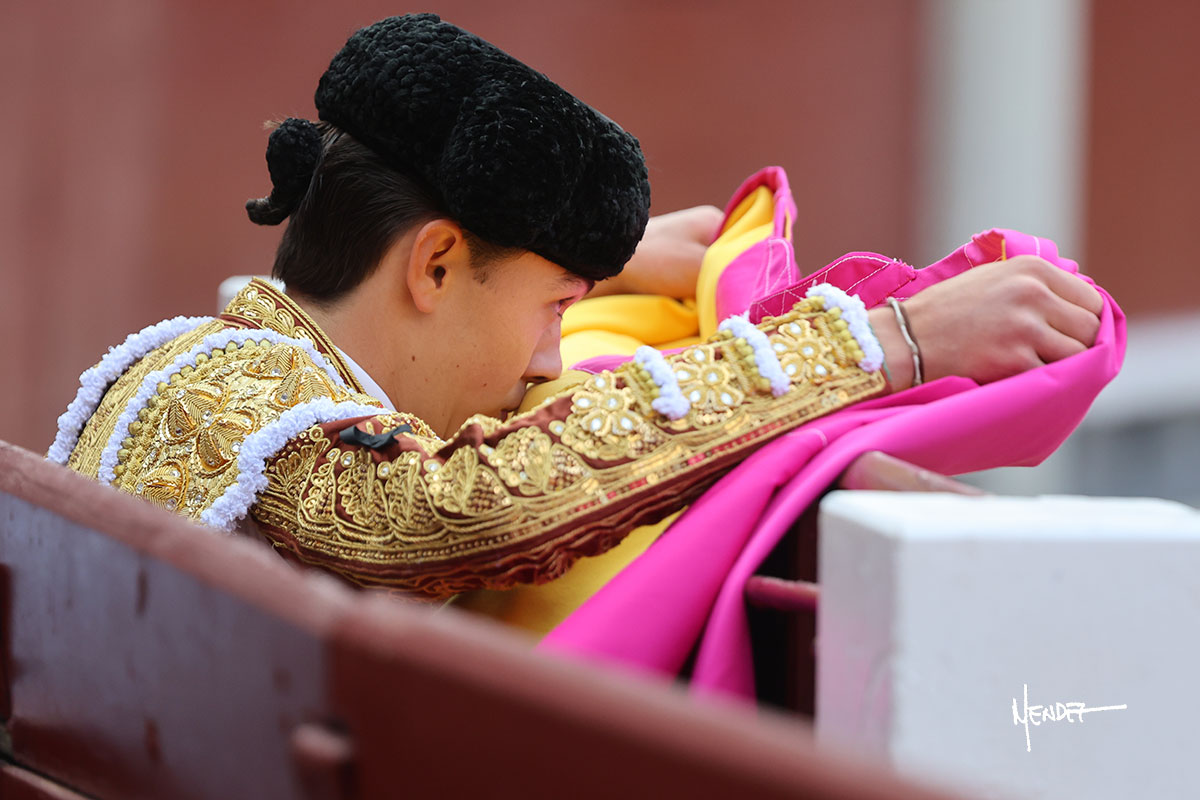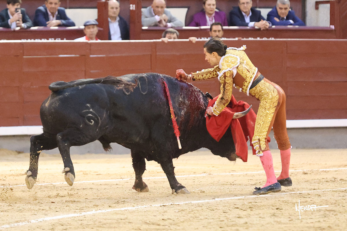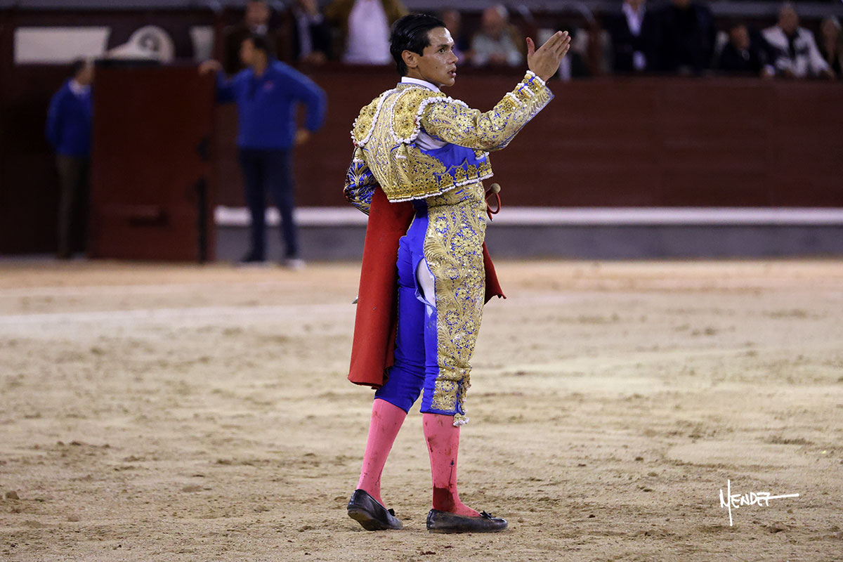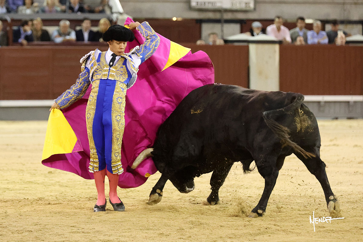 Saludó Bruno al cuarto, lanceándolo, bregando con el para pasarlo con suavidad, cuidando la embestida. Se alcanzó la faena de muleta, pero antes, brindó Bruno desde los medios. Comenzó su labor doblándose con el, sacándolo del tercio, ganándole terreno mientras seguía mostrándolo por abajo. Bruno pedía paciencia tras aquel inicio de teclas. Le dio tiempo y sitio para continuar sobre el derecho de un novillo que ya salía suelto buscando las tablas. El mexicano se puso delante con disposición y firmeza, citándolo en la media distancia para después aprovechar la inercia y tratar de envolvérselo. Sin embargo, llevaba consigo un peligro sordo en las salidas, soltando la cara con brusquedad y buscando el cuerpo. Decidió mostrarlo al natural, echándole los vuelos a la cara, teniendo que sujetarlo para que no se le fuera. Insistió, aún sabiendo que no podía dar más de sí porque no había opciones en su oponente. Se jugó la voltereta, pisó terrenos comprometidos y, finalmente, se la llevó. Aún así, siguió delante estoicamente. Mató con acierto y determinación.