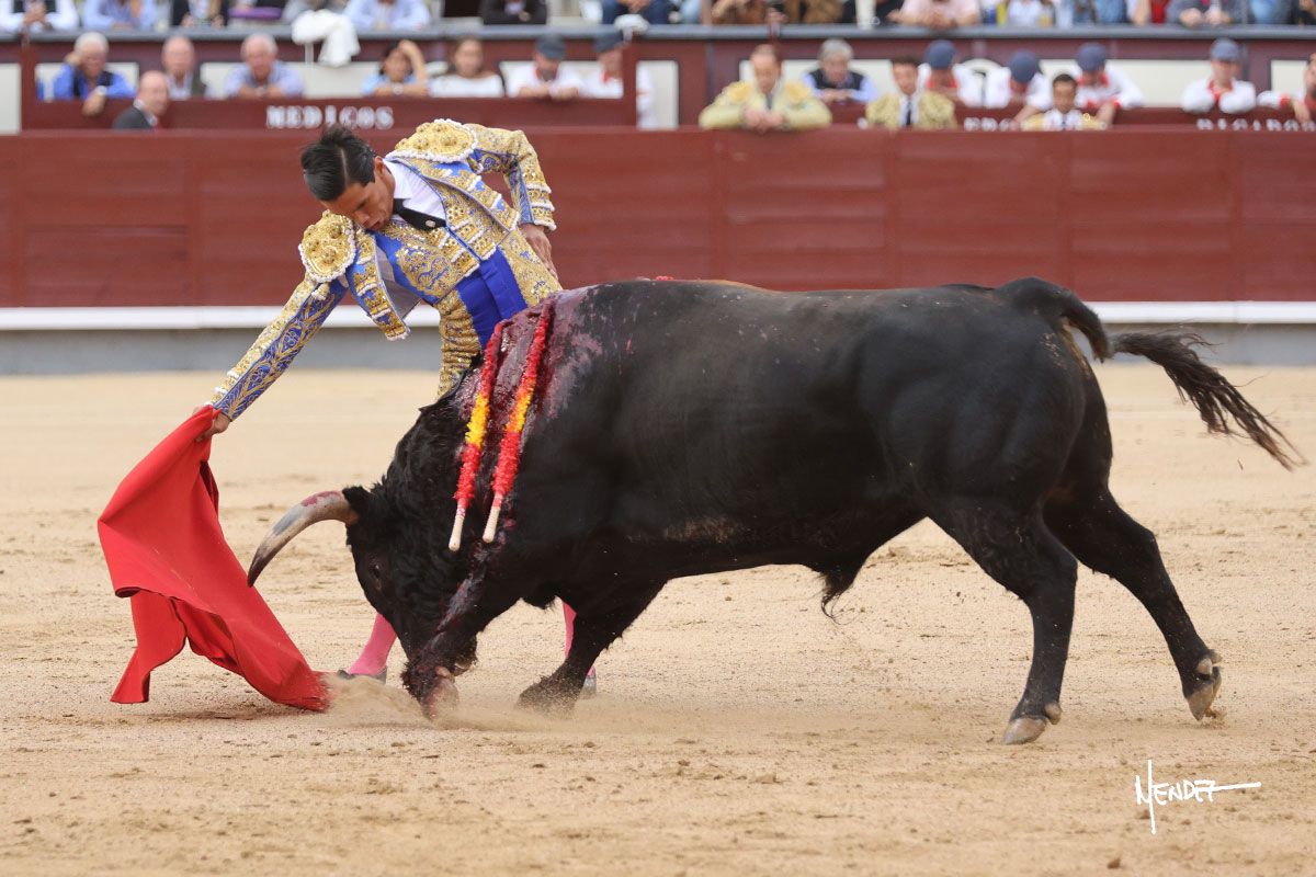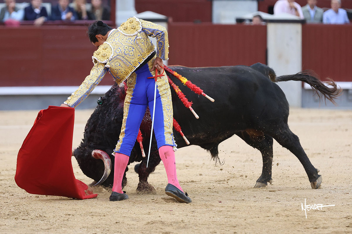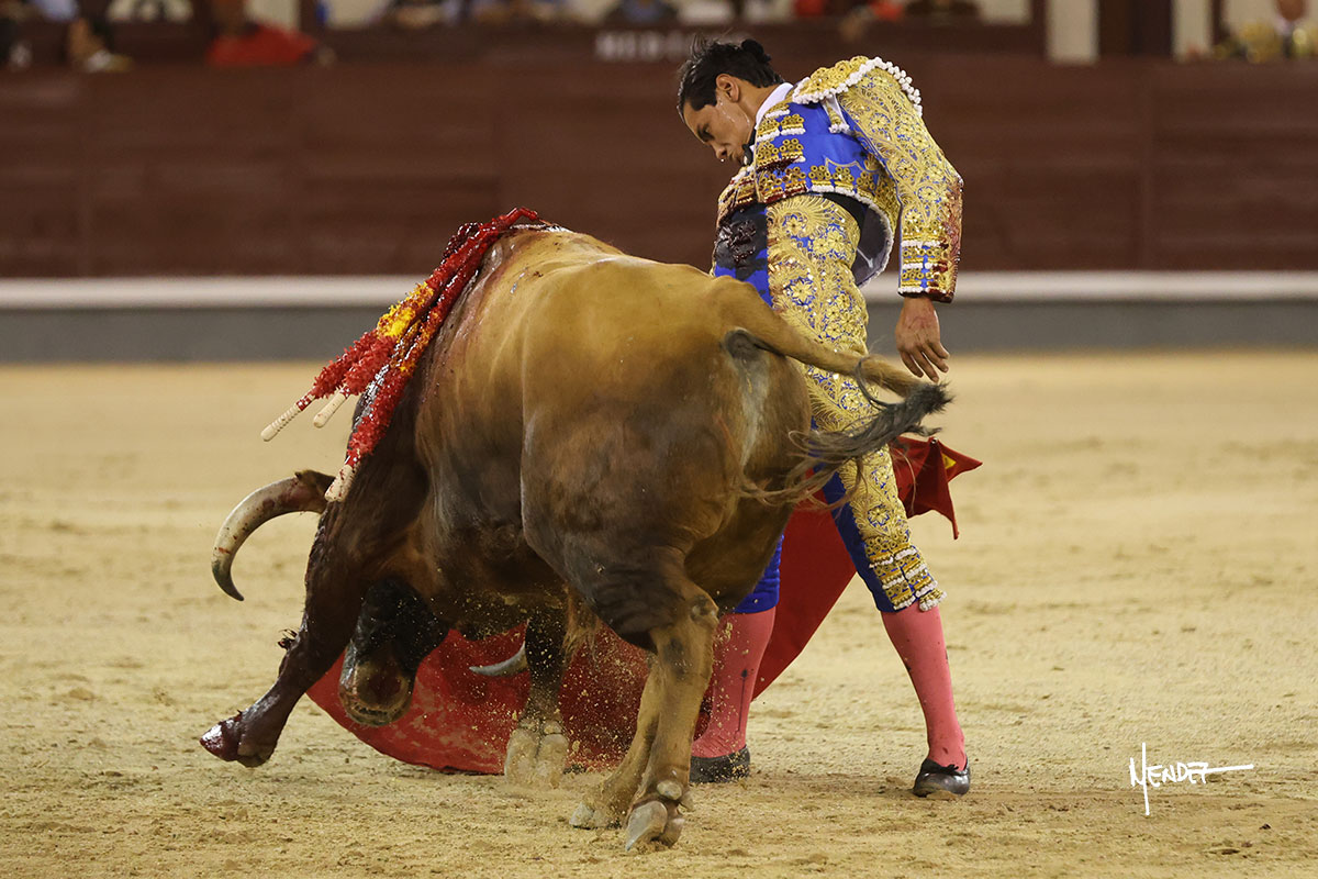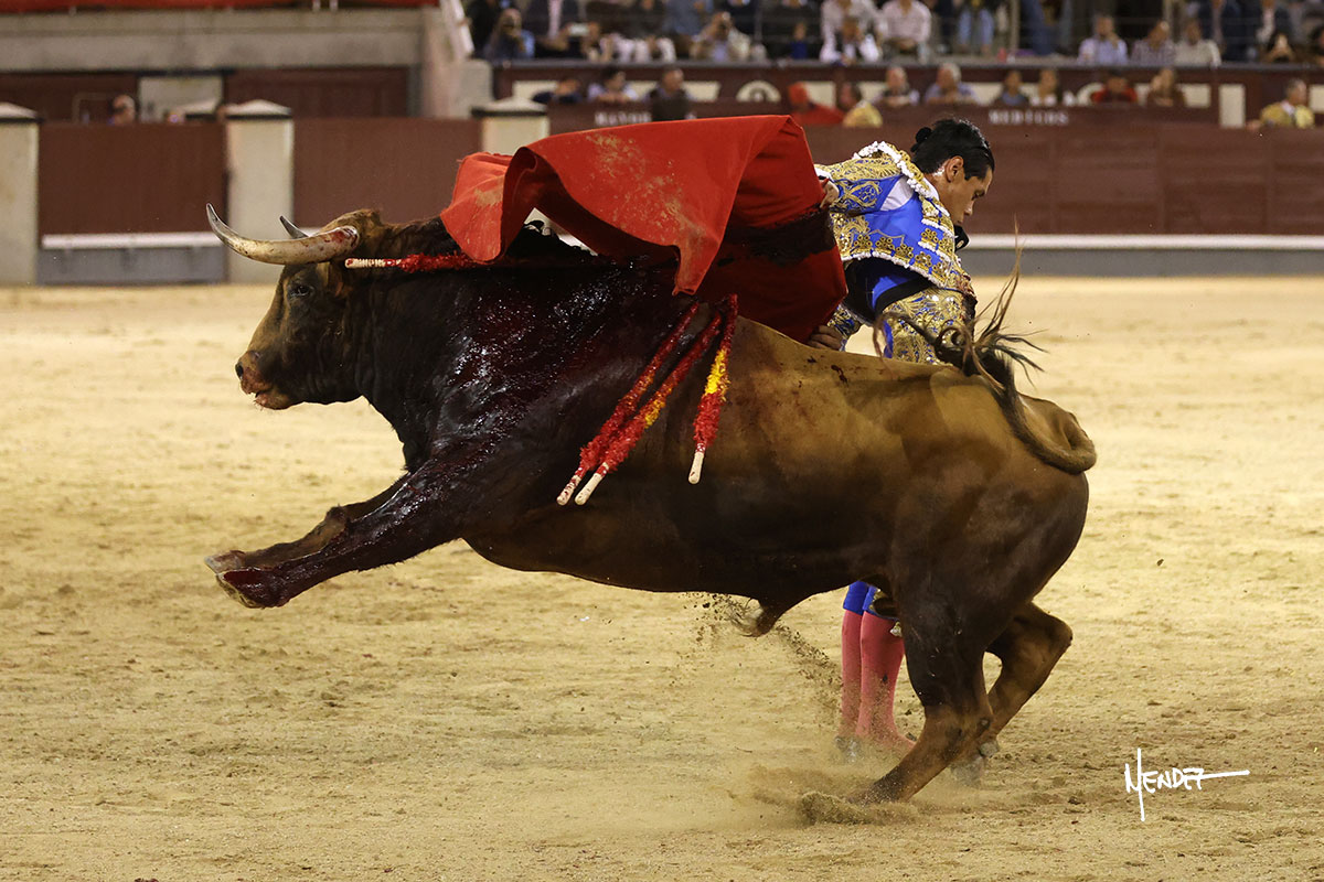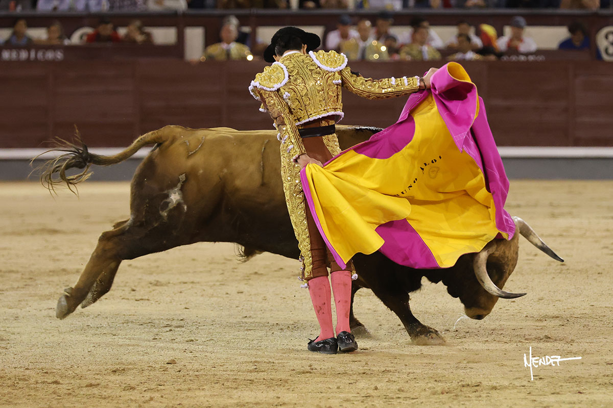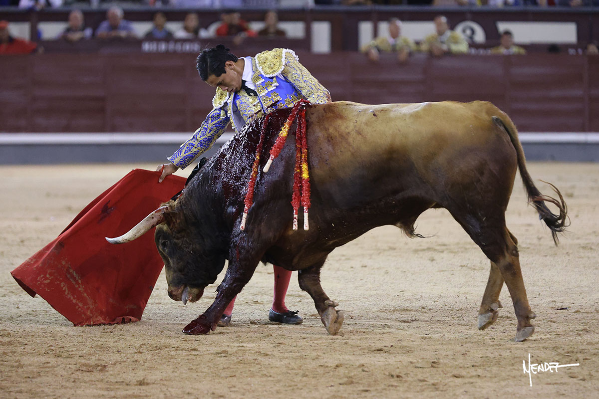 Salió el quinto, con el que El Mene se estiró con gusto y lucimiento mientras le ganaba terreno y lo remataba con torería en los medios. Comenzó su labor por ayudados, con unos estatuarios por alto para después rematarlo por abajo en un inicio ovacionado en los tendidos. Siguió con suavidad, pasándolo con cierto gusto y quietud. Dosificó y midió muy bien los tiempos, dándole sitio antes de comenzar una nueva serie, ahora al natural, cruzándose para pasarlo en largo sin terminar de bajarle la mano. Poco a poco iba recortando el recorrido, quedándose muy encima, soltando incluso la cara en las salidas. Se fue poniendo cuesta arriba su faena ante el quinto, sin poder añadir mucho más. Mató con acierto.