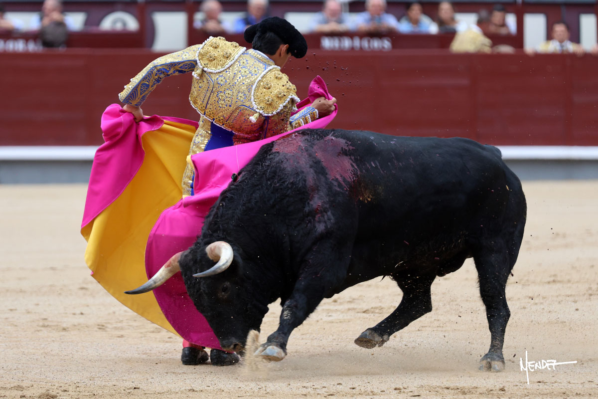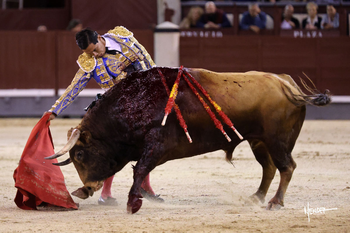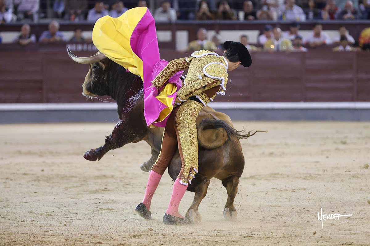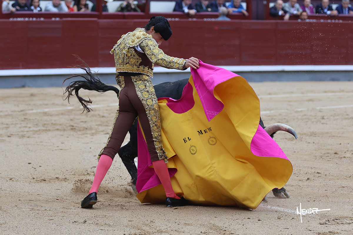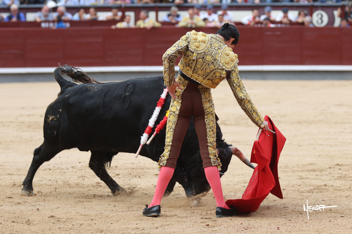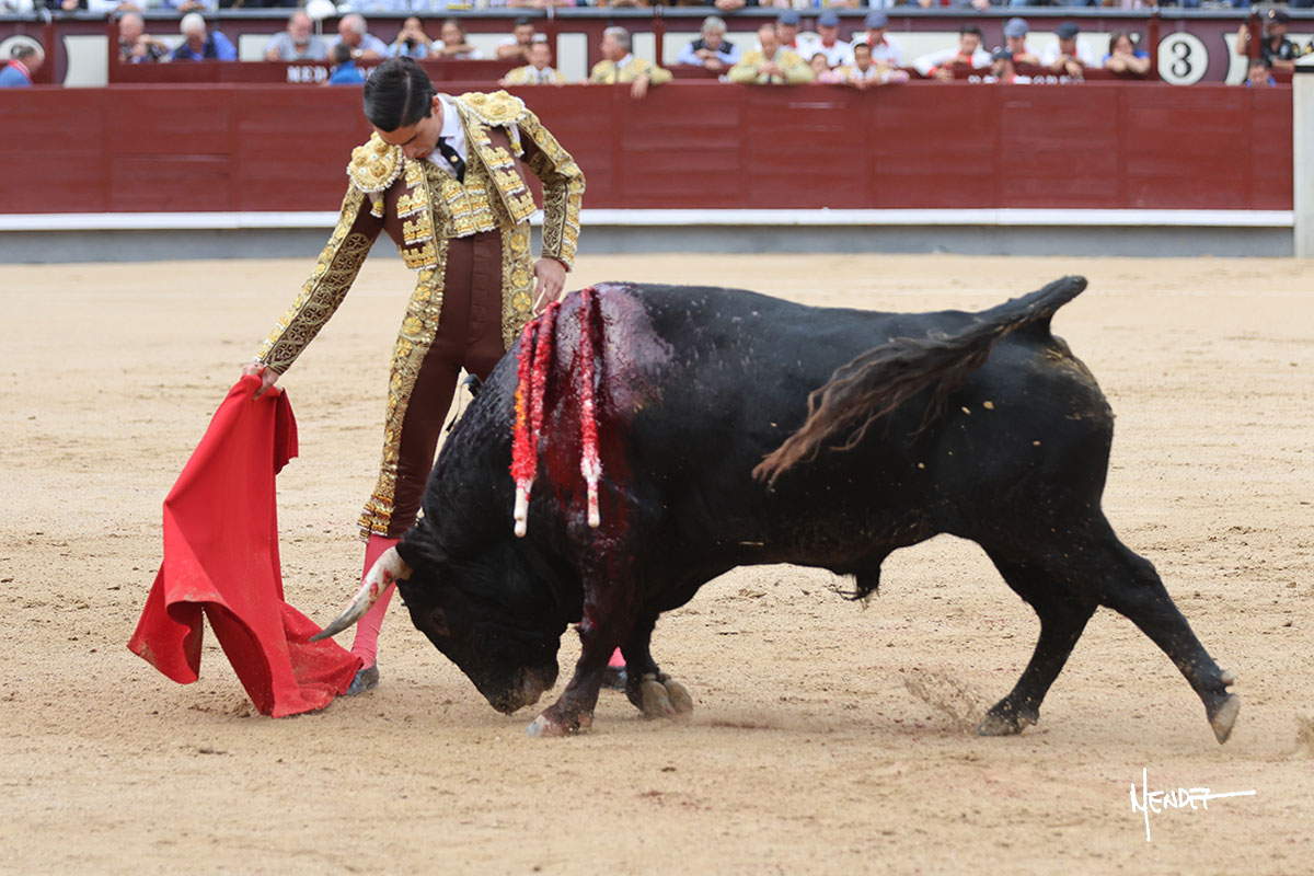 Salió el quinto, con el que El Mene se estiró con gusto y lucimiento mientras le ganaba terreno y lo remataba con torería en los medios. Comenzó su labor por ayudados, con unos estatuarios por alto para después rematarlo por abajo en un inicio ovacionado en los tendidos. Siguió con suavidad, pasándolo con cierto gusto y quietud. Dosificó y midió muy bien los tiempos, dándole sitio antes de comenzar una nueva serie, ahora al natural, cruzándose para pasarlo en largo sin terminar de bajarle la mano. Poco a poco iba recortando el recorrido, quedándose muy encima, soltando incluso la cara en las salidas. Se fue poniendo cuesta arriba su faena ante el quinto, sin poder añadir mucho más. Mató con acierto.