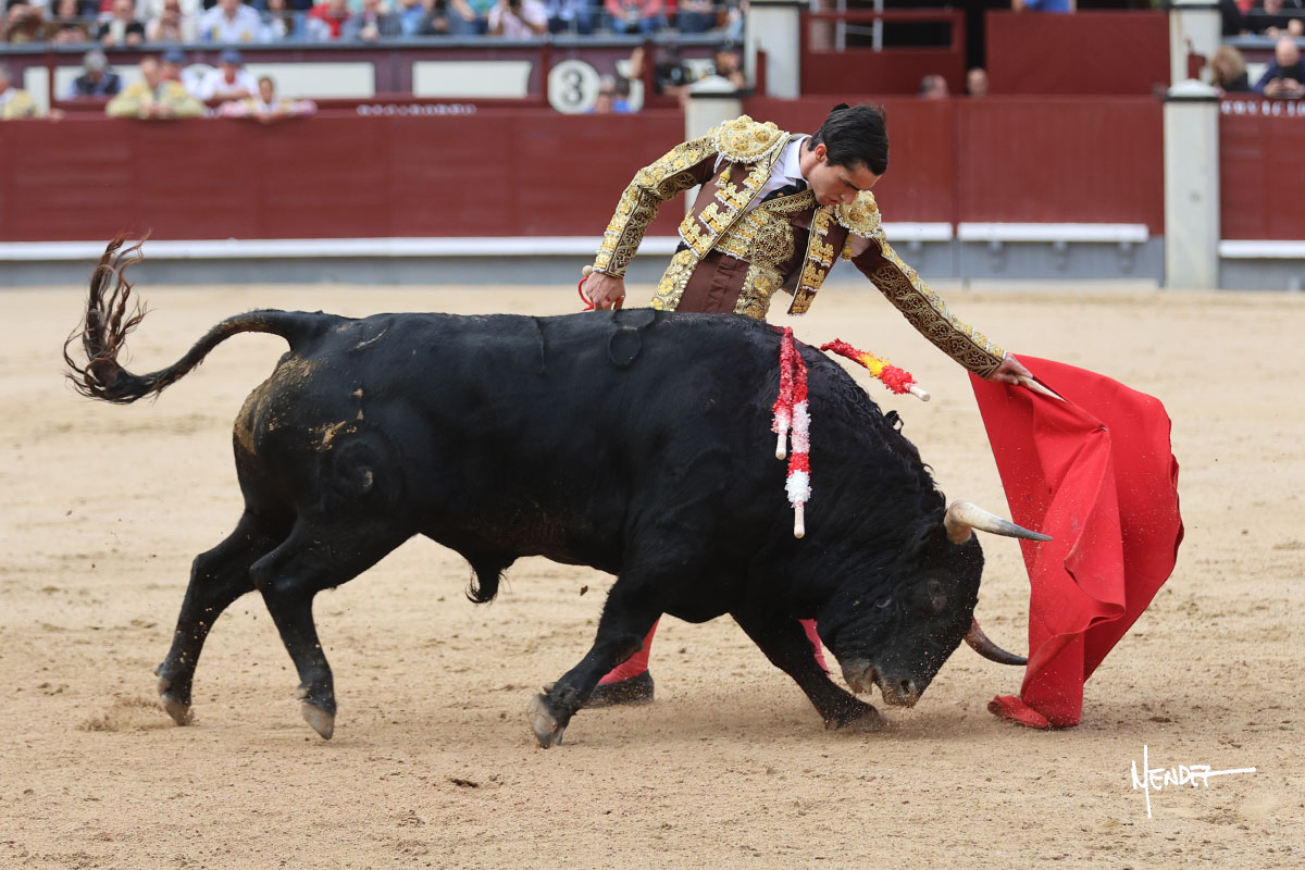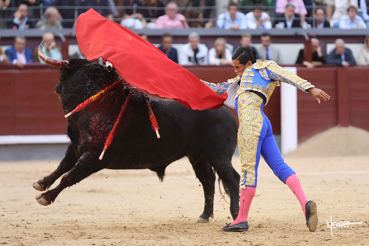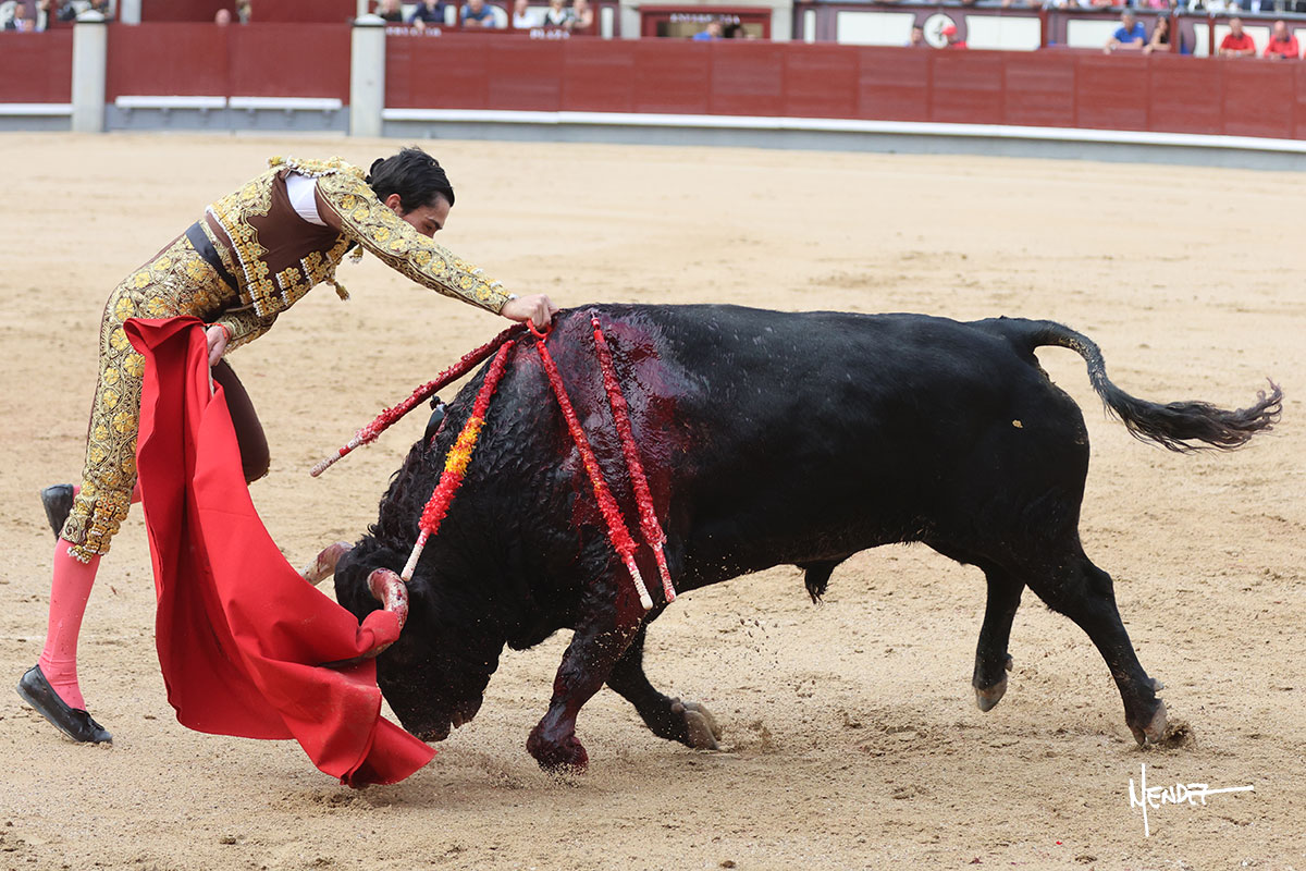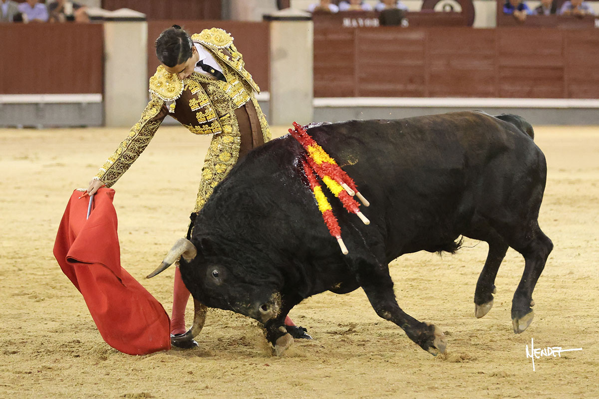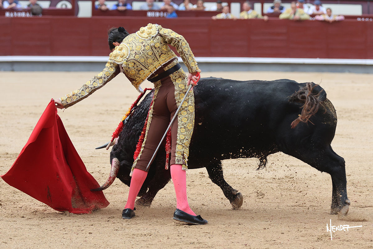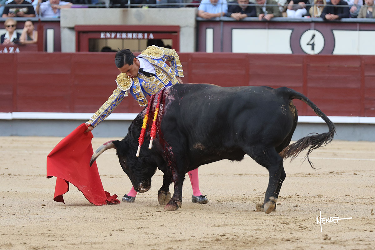 Salió el quinto, con el que El Mene se estiró con gusto y lucimiento mientras le ganaba terreno y lo remataba con torería en los medios. Comenzó su labor por ayudados, con unos estatuarios por alto para después rematarlo por abajo en un inicio ovacionado en los tendidos. Siguió con suavidad, pasándolo con cierto gusto y quietud. Dosificó y midió muy bien los tiempos, dándole sitio antes de comenzar una nueva serie, ahora al natural, cruzándose para pasarlo en largo sin terminar de bajarle la mano. Poco a poco iba recortando el recorrido, quedándose muy encima, soltando incluso la cara en las salidas. Se fue poniendo cuesta arriba su faena ante el quinto, sin poder añadir mucho más. Mató con acierto.