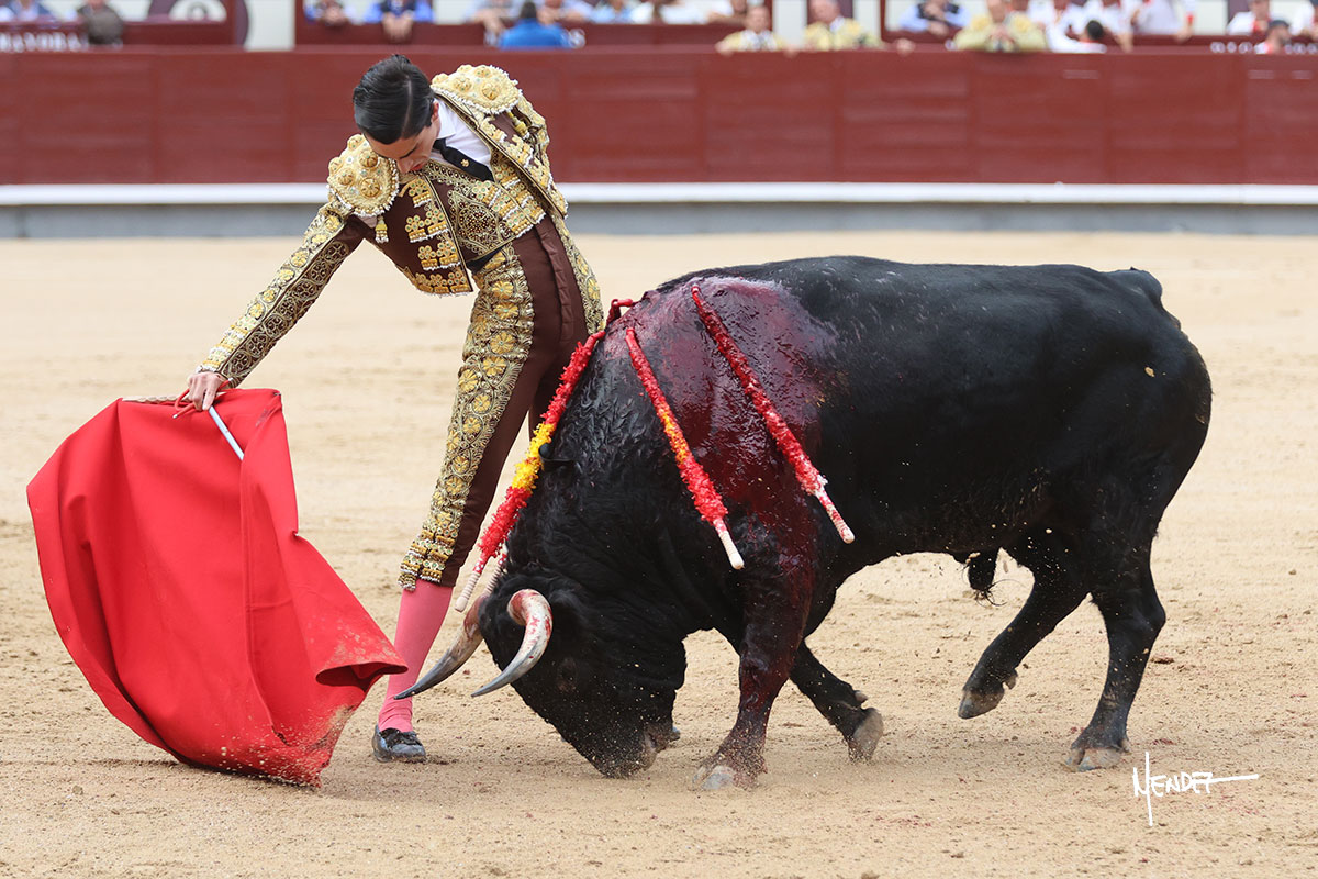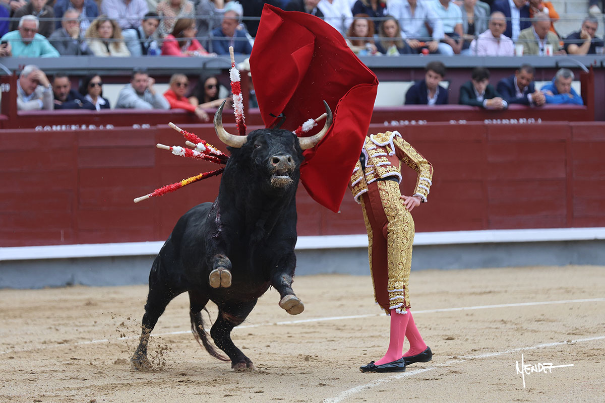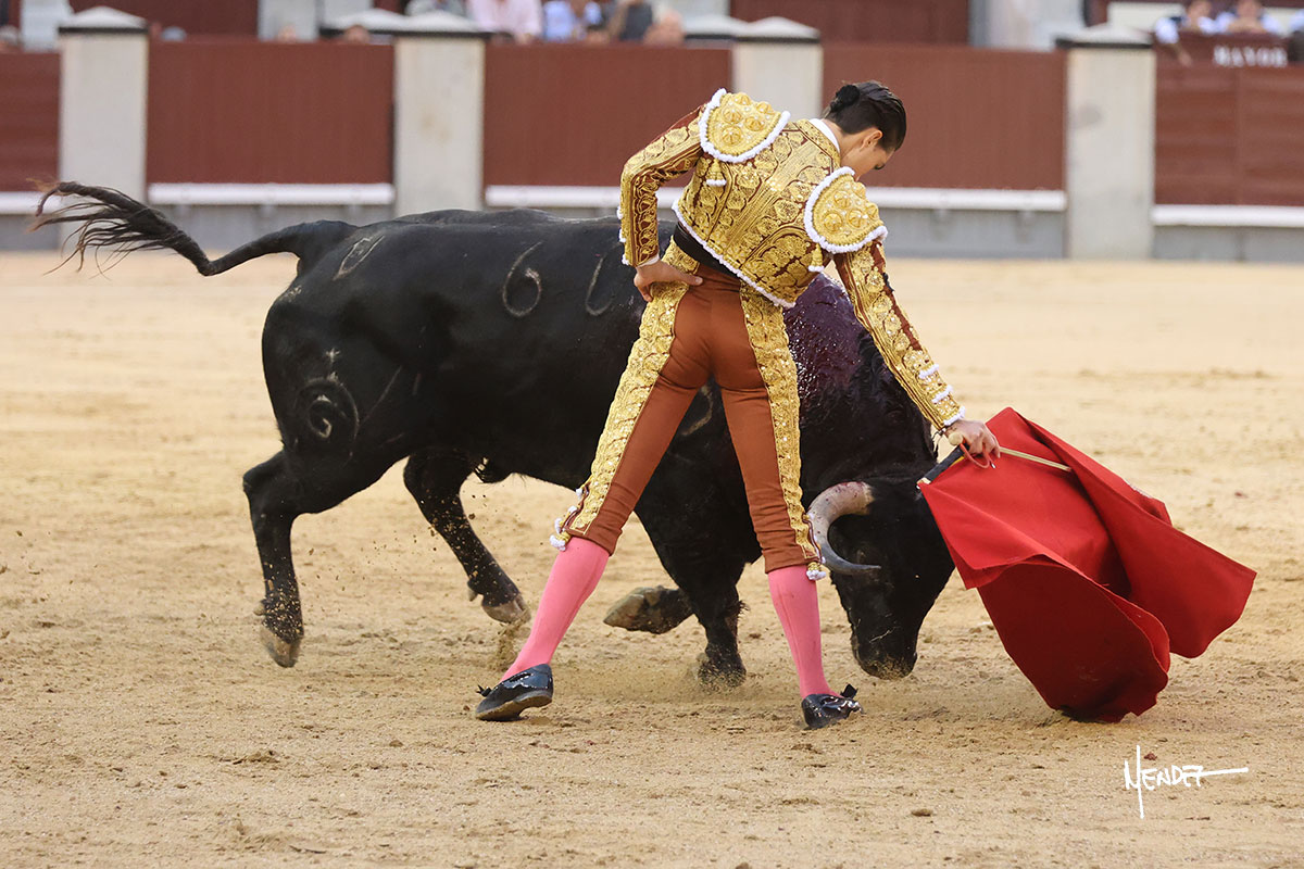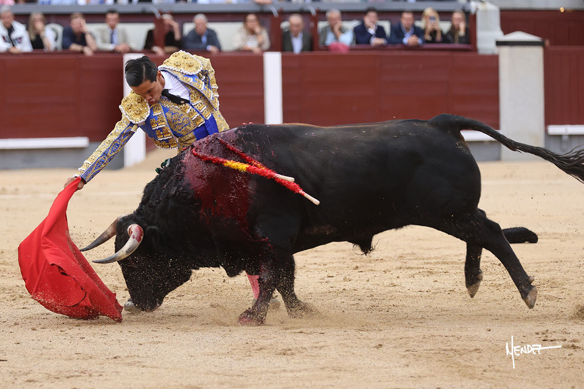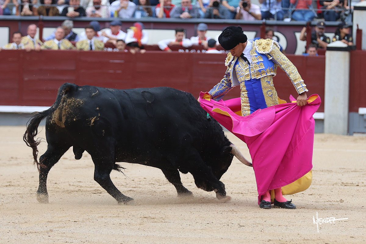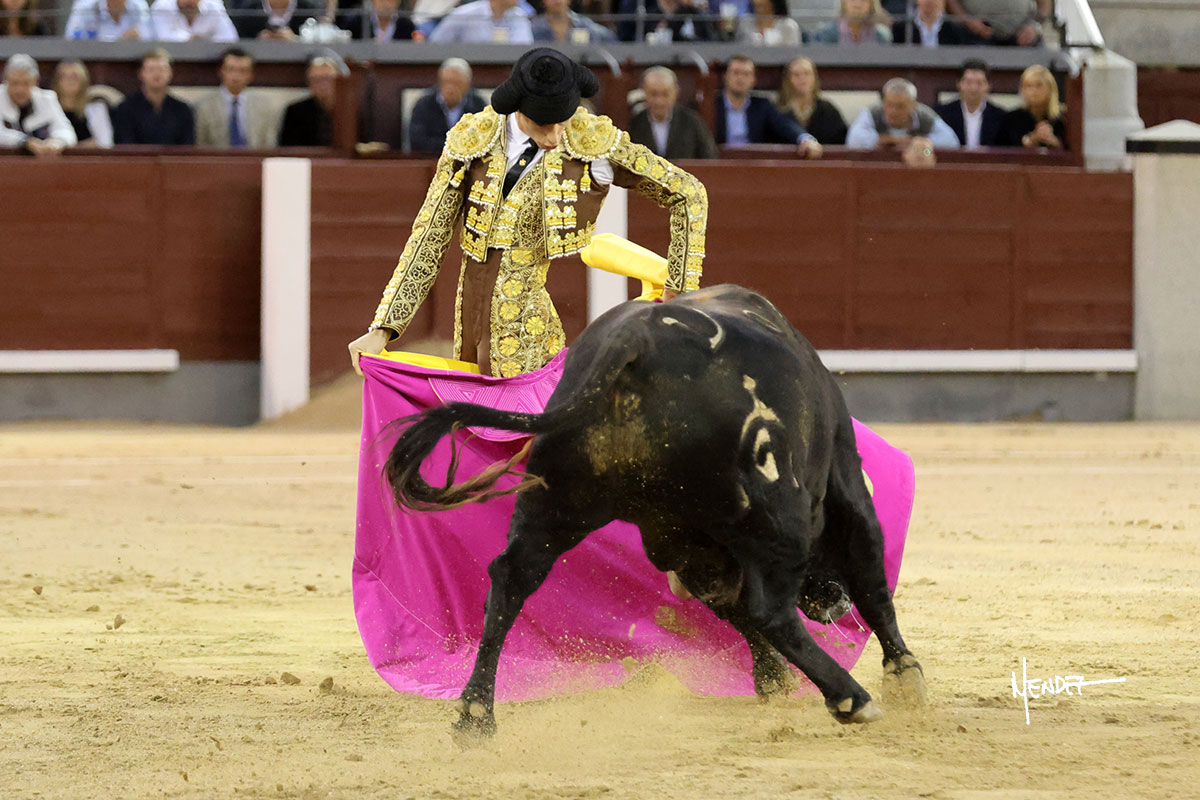 Salió el quinto, con el que El Mene se estiró con gusto y lucimiento mientras le ganaba terreno y lo remataba con torería en los medios. Comenzó su labor por ayudados, con unos estatuarios por alto para después rematarlo por abajo en un inicio ovacionado en los tendidos. Siguió con suavidad, pasándolo con cierto gusto y quietud. Dosificó y midió muy bien los tiempos, dándole sitio antes de comenzar una nueva serie, ahora al natural, cruzándose para pasarlo en largo sin terminar de bajarle la mano. Poco a poco iba recortando el recorrido, quedándose muy encima, soltando incluso la cara en las salidas. Se fue poniendo cuesta arriba su faena ante el quinto, sin poder añadir mucho más. Mató con acierto.