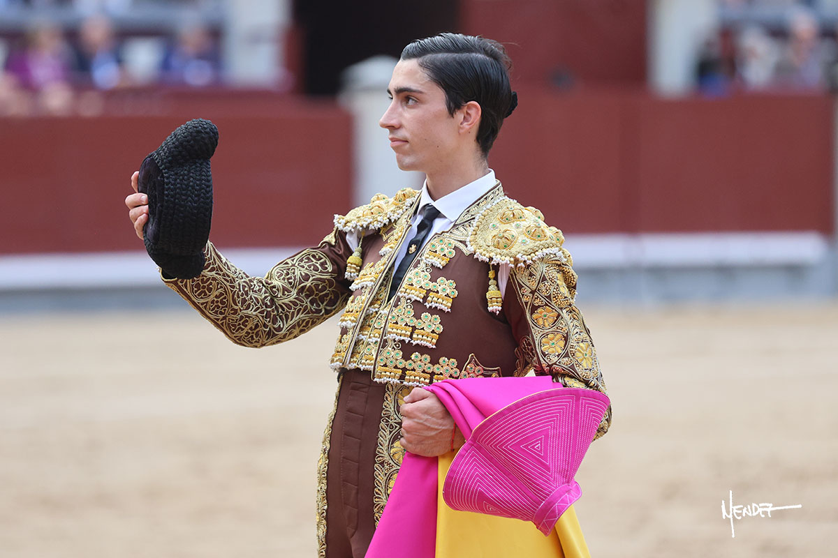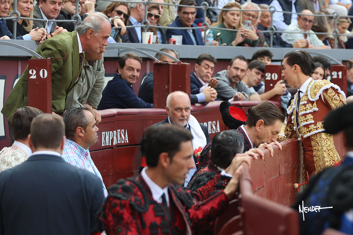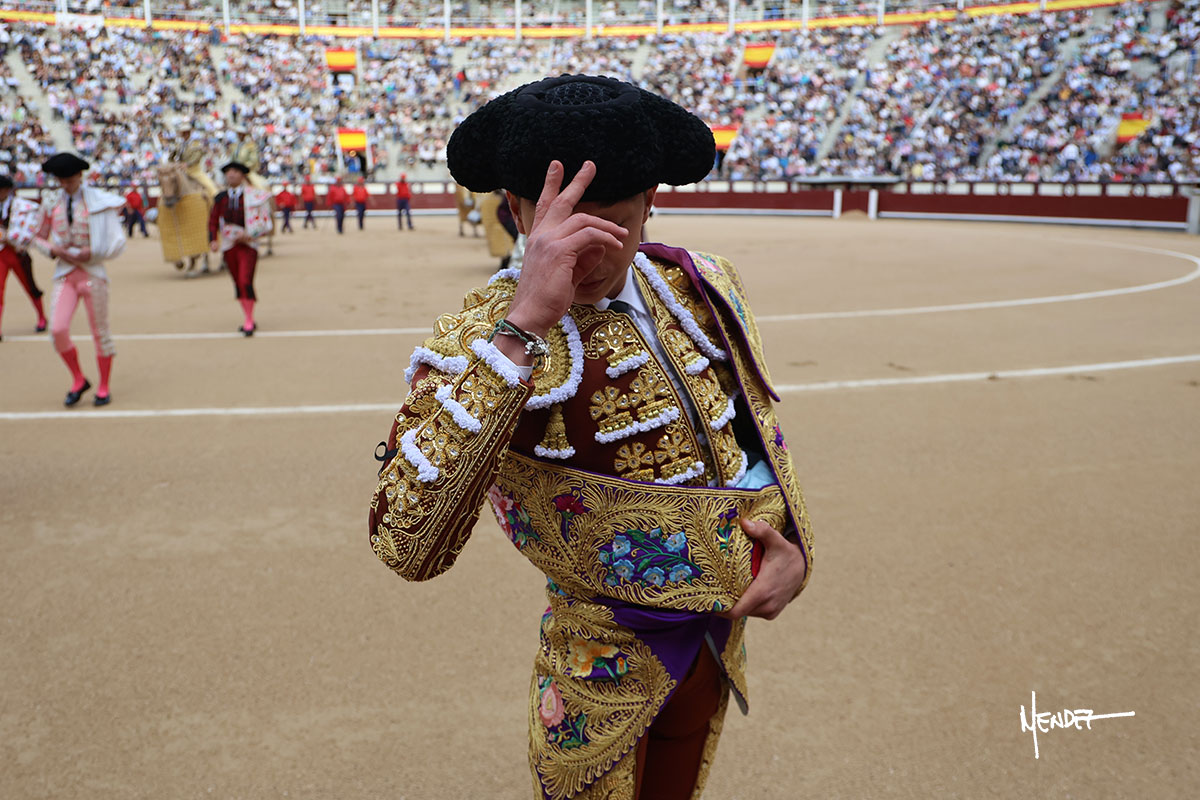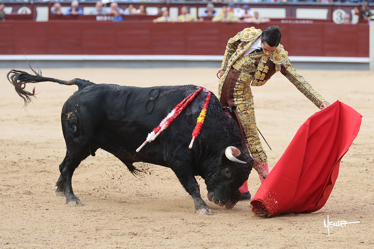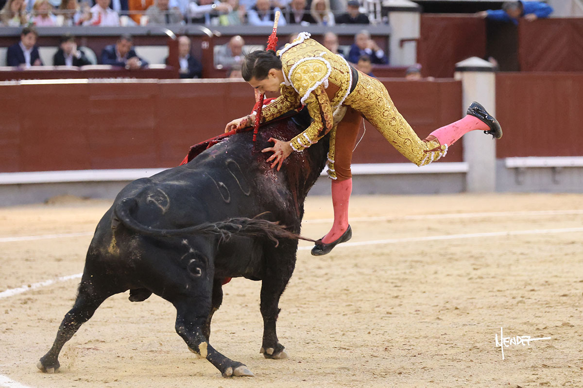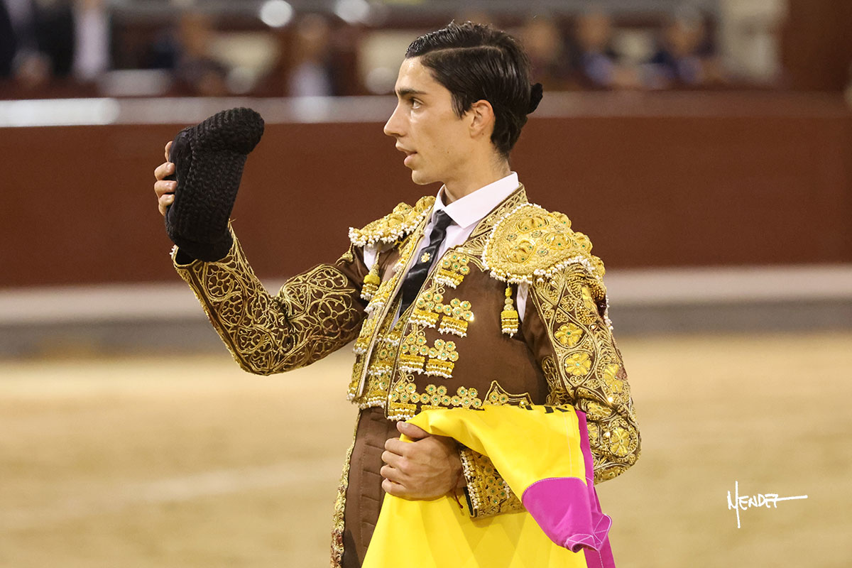 Salió el quinto, con el que El Mene se estiró con gusto y lucimiento mientras le ganaba terreno y lo remataba con torería en los medios. Comenzó su labor por ayudados, con unos estatuarios por alto para después rematarlo por abajo en un inicio ovacionado en los tendidos. Siguió con suavidad, pasándolo con cierto gusto y quietud. Dosificó y midió muy bien los tiempos, dándole sitio antes de comenzar una nueva serie, ahora al natural, cruzándose para pasarlo en largo sin terminar de bajarle la mano. Poco a poco iba recortando el recorrido, quedándose muy encima, soltando incluso la cara en las salidas. Se fue poniendo cuesta arriba su faena ante el quinto, sin poder añadir mucho más. Mató con acierto.