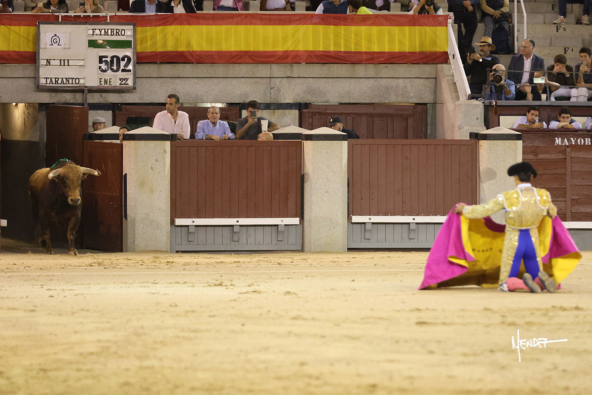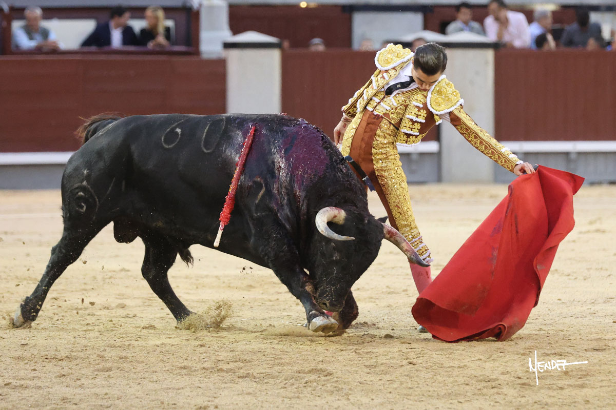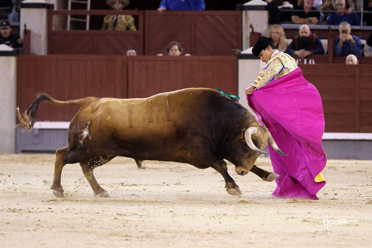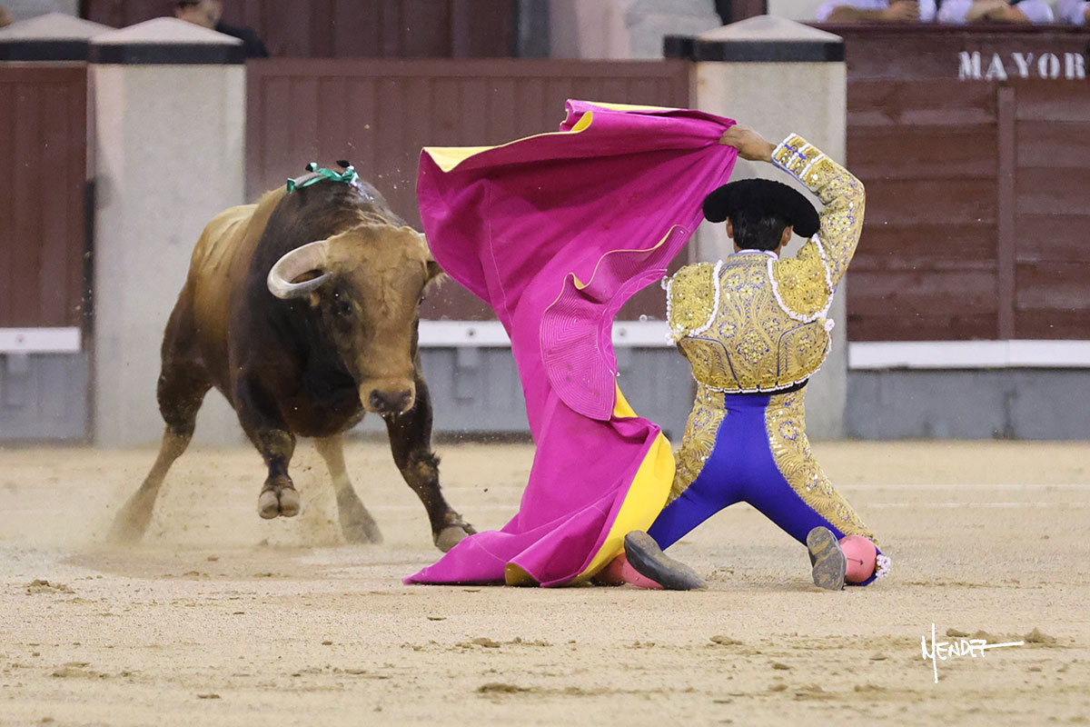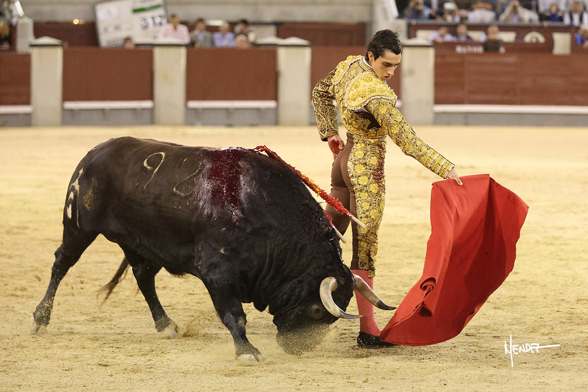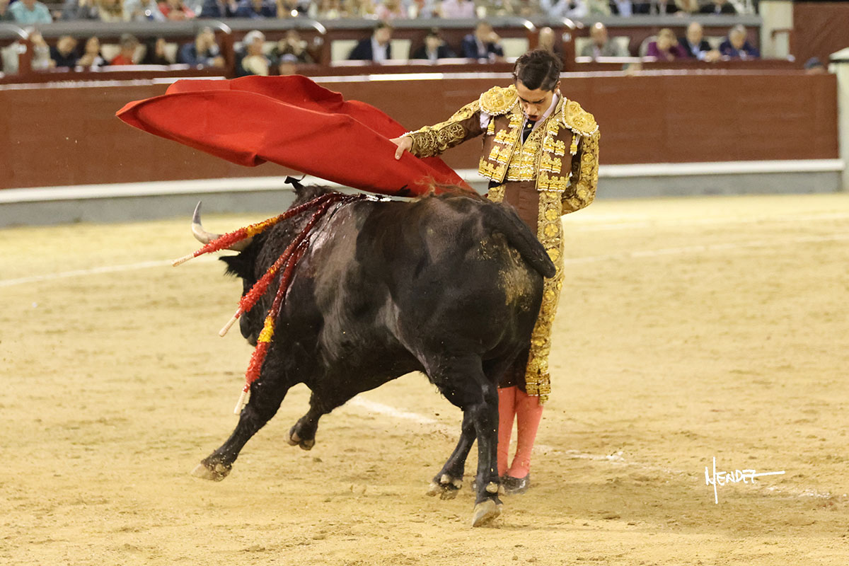 El Mene lo llevó con suavidad, lanceándolo despacio, pasándolo en su capote. Poco a poco fue mostrando, cada vez más, su condición de manso, midiendo, parándose en exceso.  Se alcanzó la faena de muleta y El Mene brindó al público desde los medios para después irse a los terrenos del siete para empezar a pasarlo. Genuflexo lo tanteó por ambos pitones, ganándole terreno poco a poco, encontrando asperezas. El animal iba y venía en aquel inicio de faena, pero sin transmitir. Siguió sibre el derecho, buscándolo en la media distancia, pudiendo encajarse con el y darle ritmo, bajándole incluso la mano. El de Fuente Ymbro no permitió que se confiara, ya que, aunque pasaba, se quedaba a medio viaje. Cambió al toreo al natural, cruzándose y llevándolode uno en uno, tratando de limpiar el muletazo y ayudarlo en las salidas, abriéndolo para evitar que se le quedara encima. Le bajó el engaño y siguió pasándolo, aunque ya no había mucho más que exprimir. Metió el acero con acierto.