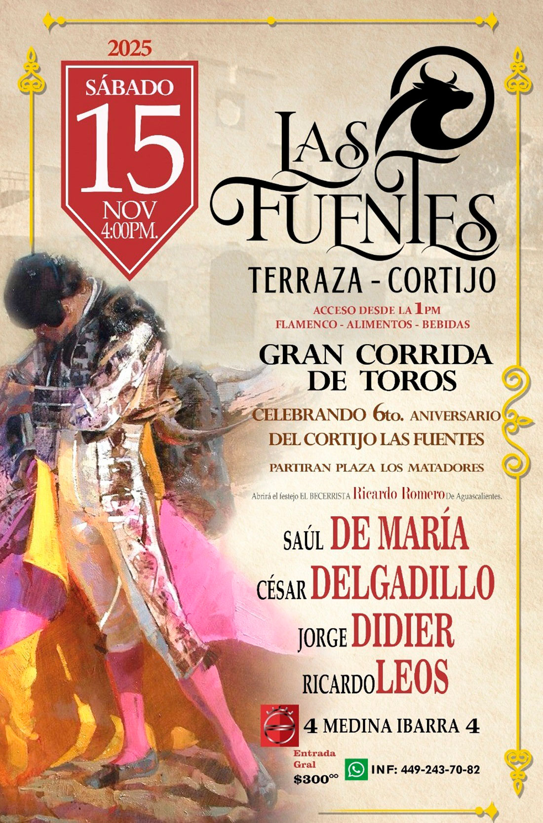 Ellos mismos develaron el cartel para la cita sabatina del 15 de noviembre en el Cortijo “Las Fuentes”, a partir de las 13:00 horas, con servicio de alimentos, bebidas y amenizando música flamenca y, en punto de las 16:00 horas, iniciar la corrida mixta del VI aniversario del coso fontanense, con las actuaciones de los diestros Saúl de María, César Delgadillo, Jorge Didier y Ricardo Leos, además, del becerrista Ricardo Romero, quienes lidiarán ejemplares procedentes del rancho Sierra Brava, lugar donde se halla la ganadería de Medina Ibarra, casa de la divisa en rojo y vino tinto, propiedad de don Jorge Arturo Medina Rodríguez, vecino del municipio de San José de Gracia, Aguascalientes.