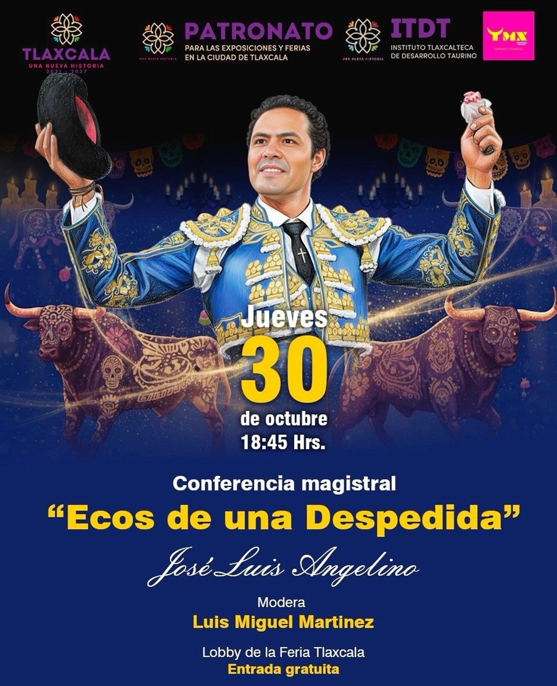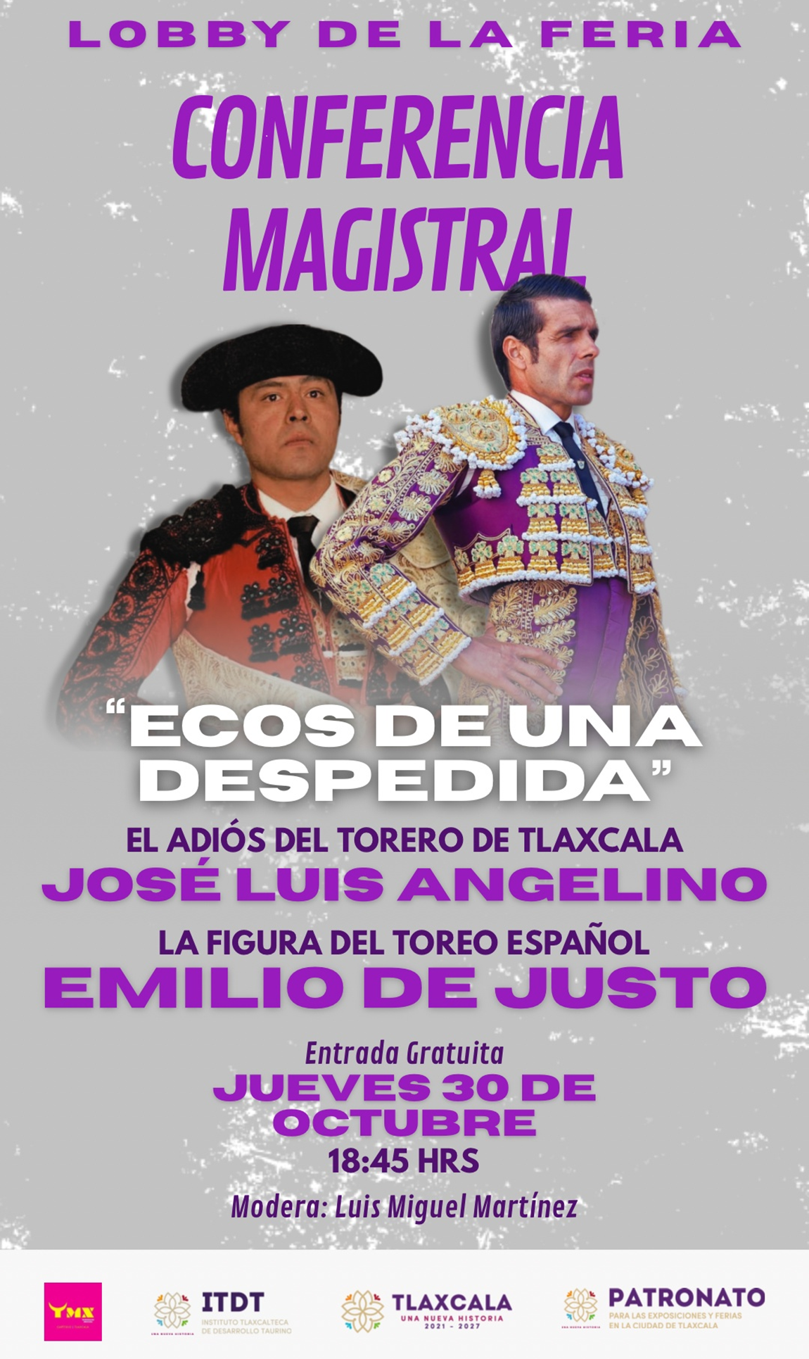 Luego, a las 18:45 horas, en el lobby de la feria se llevará a cabo la I Conferencia Magistral, misma en la que el propio matador José Luis Angelino y el maestro cacereño Emilio de Justo dialogarán sobre el tema “Ecos de una Despedida”, con relación a la corrida del próximo sábado. El evento será conducido por el colega y amigo Luis Miguel Martínez.