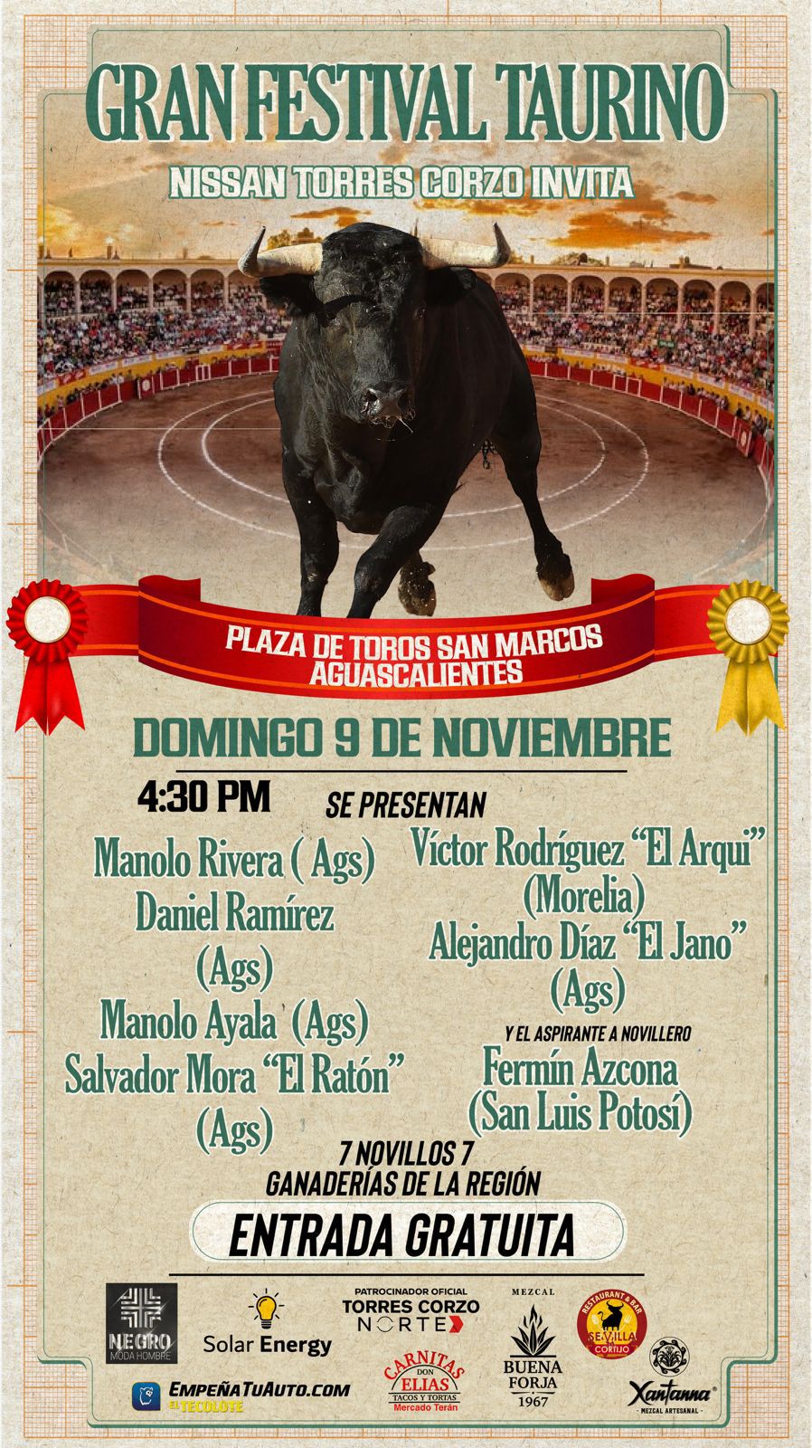 Después de un par de años de espera, según se hace saber, sin lograr montar festivales taurinos de aficionados, el matador de toros acalitense y empresario, Manuel Gutiérrez, anuncia y confirma que, la espera terminó, pues, este año, el próximo domingo 9 de noviembre, se realizará un festejo de esta naturaleza en el legendario coso “San Marcos” de la ciudad de Aguascalientes, con entrada gratuita, a partir de las 16:30 horas.
