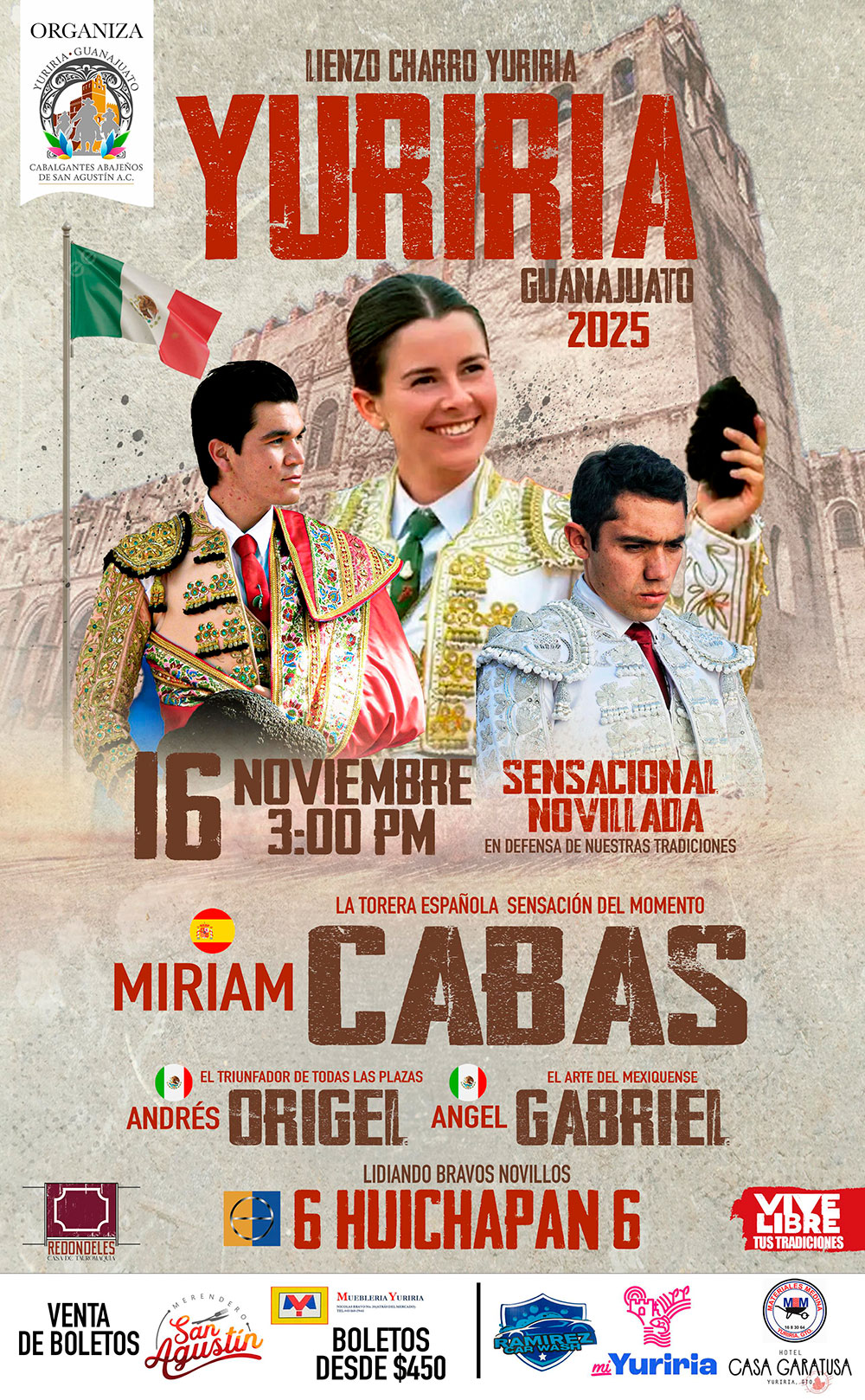 La empresa Redondeles – Casa de Tauromaquia y Cabalgantes Abajeños de San Agustín ha dado a conocer el cartel de la novillada que se llevará a cabo el próximo 16 de noviembre a partir de las 15:00 hrs. en el Lienzo Charro de la localidad guanajuatense de Yuriria en la que harán el paseíllo los novilleros mexicanos Andrés Origel, Ángel Gabriel y la novillera española Miriam Cabas para lidiar un encierro de la ganadería de Huichapan.