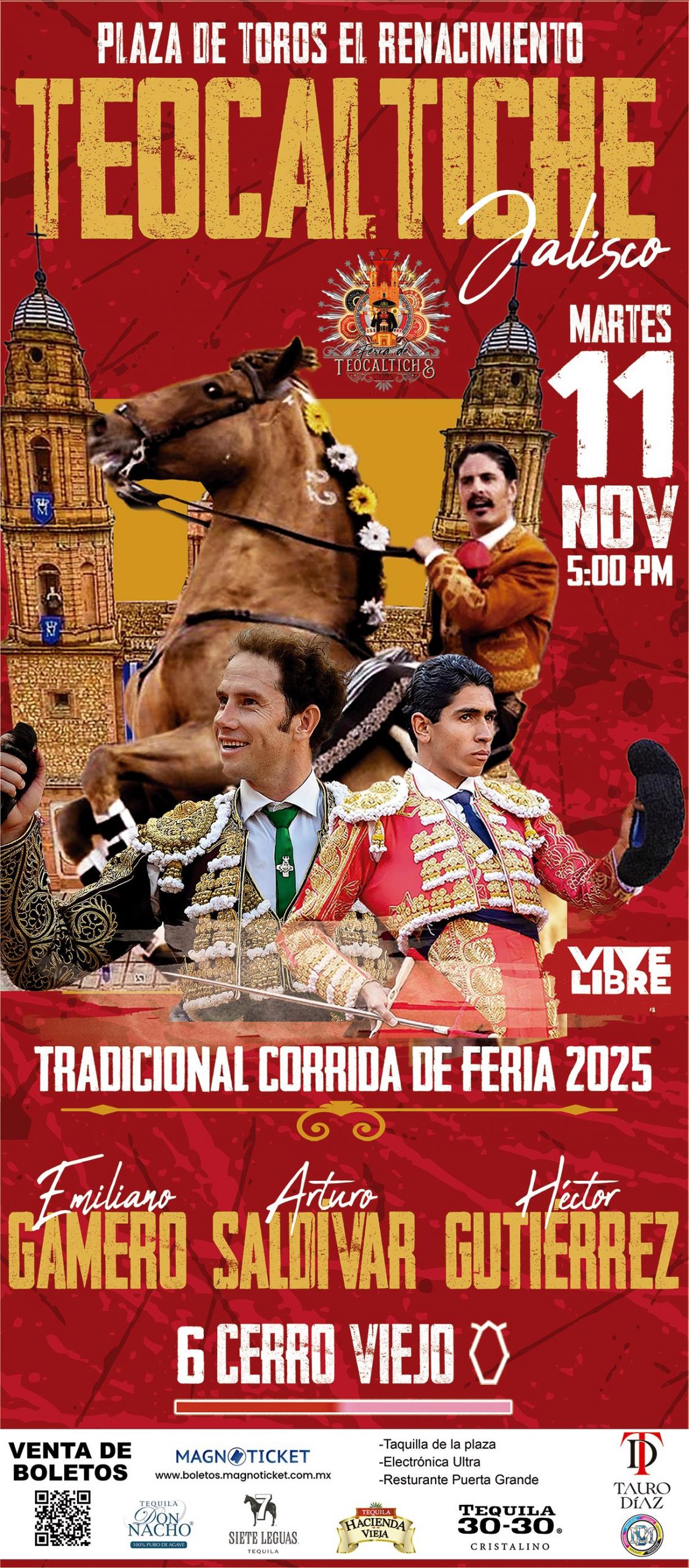 Este martes 11 de noviembre en punto de las 5 de la tarde se llevará a cabo la tradicional corrida de toros en la plaza de toros “El Renacimiento” en honor a la Virgen de los Dolores, patrona de Teocaltiche, Jalisco. Como cada año hay un gran ambiente y se espera de nuevo una gran entrada para poder ver y disfrutar del rejoneador Emiliano Gamero quien con su extraordinaria cuadra y su forma personal de interpretar el toreo a caballo y de los matadores de toros el torero de la tierra Arturo Saldívar y el de Aguascalientes Héctor Gutiérrez, quiénes se enfrentarán a un encierro de la ganadería de Cerro Viejo.