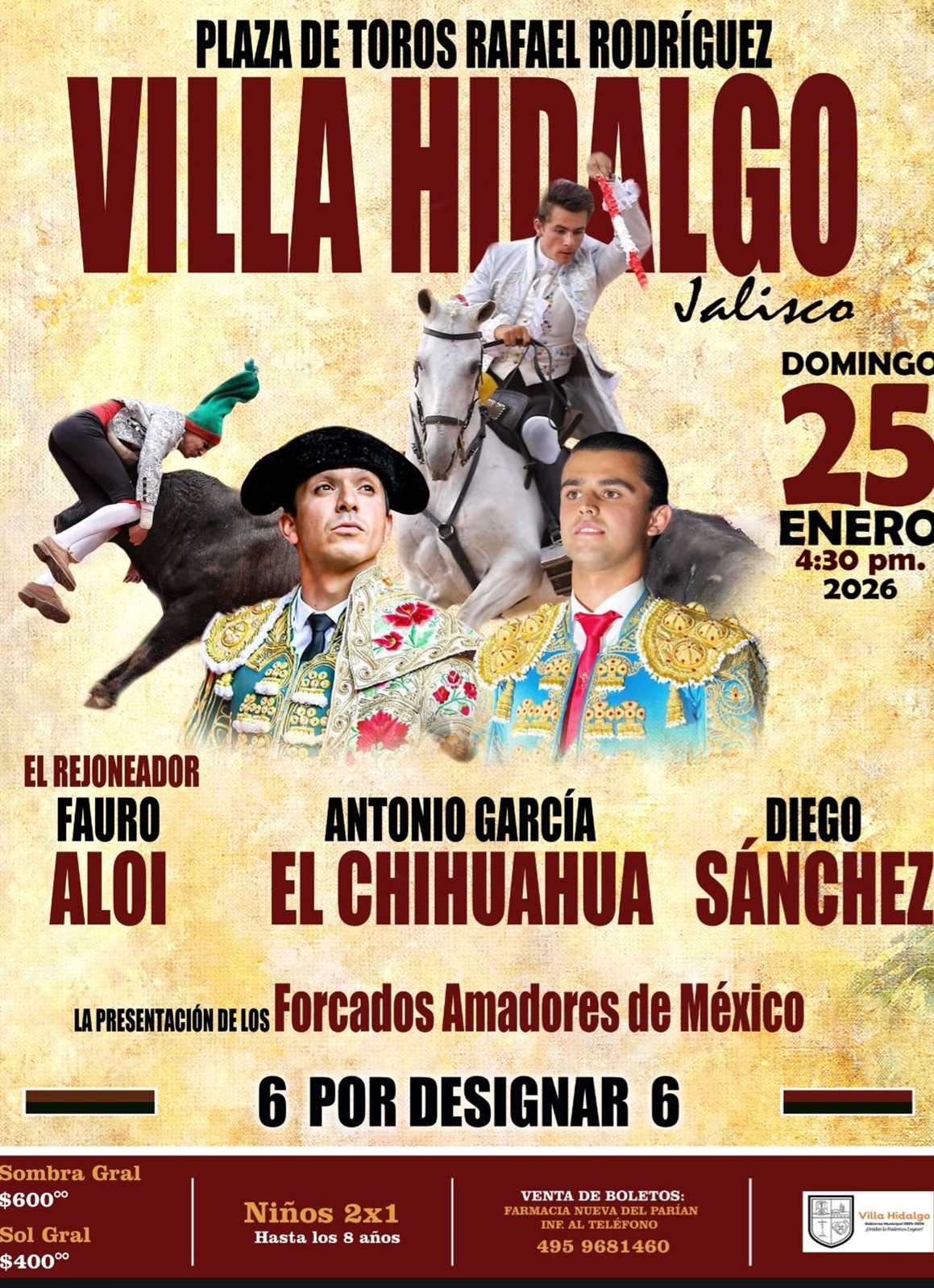 La mañana de este miércoles 26 de noviembre de 2025, en las instalaciones de conocido restaurante de la zona norte de la ciudad de Aguascalientes, se llevó a cabo la presentación oficial de lo que será la feria jalisciense de Villa Hidalgo 2026, la cuna de la industria textil, a celebrarse del sábado 17 al domingo 25 de enero y, que, contará, como es costumbre, con su corrida de toros, ahora, programada como cierre de estas fiestas en honor a la Virgen de Guadalupe, el domingo 25, a partir de las 16:30 horas, teniendo como escenario el coso “Rafael Rodríguez”.