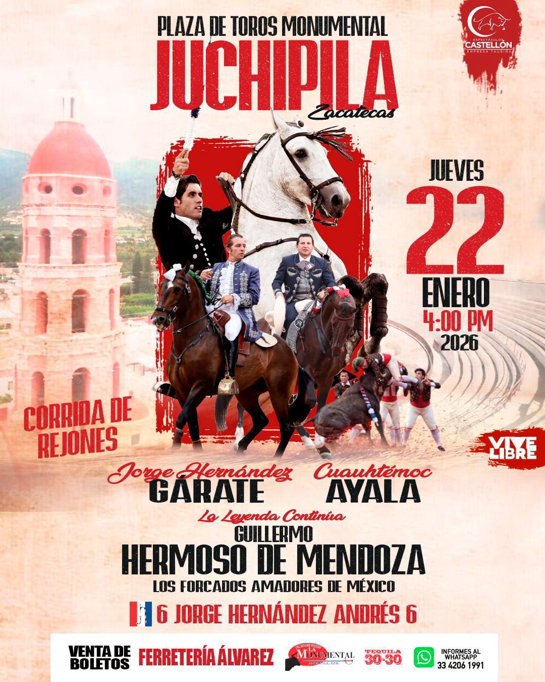 Se informa que, del sábado 10 al domingo 25 de enero de 2026, se llevará a cabo la tradicional Feria Regional de Juchipila, Zacatecas, en honor al santo patrono San Sebastián y, como ya es costumbre, tendrá actividad taurina a través del montaje de una corrida de toros para rejones.
