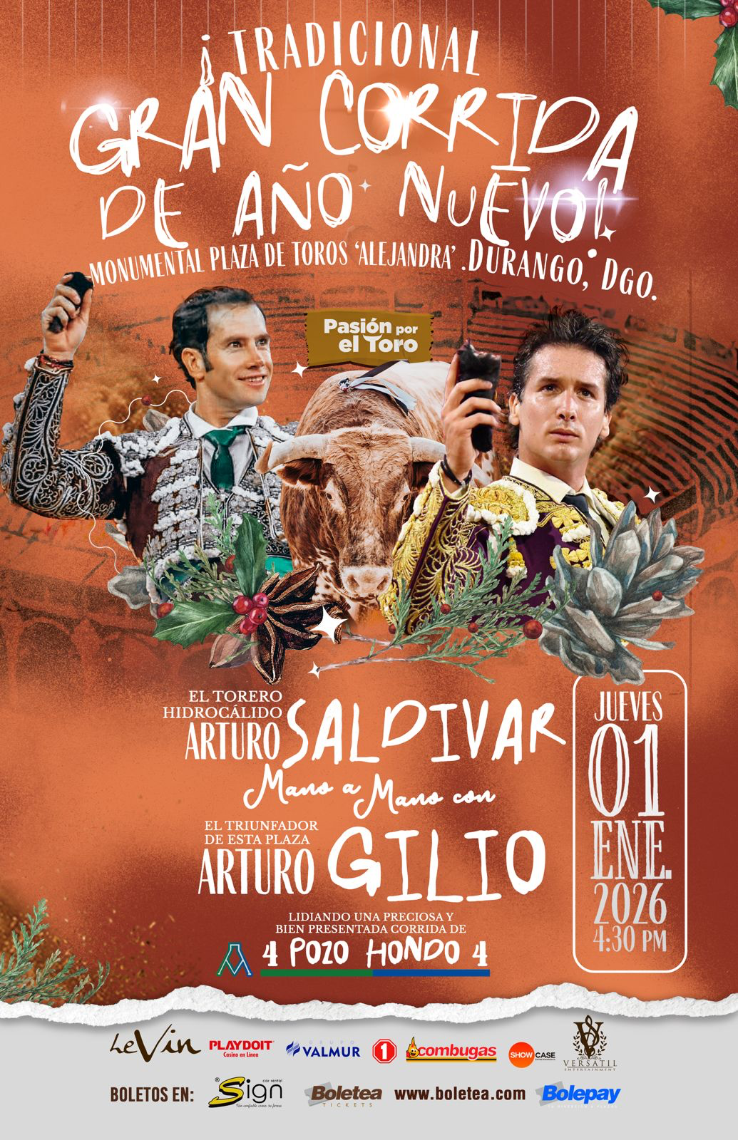 En la ciudad de Durango concretamente en la plaza de toros Alejandra se anuncia una corrida de toros con la participación de dos toreros triunfadores como lo son Arturo Saldívar y Arturo Gilio quien apenas el mes pasado firmara una gran faena que le valió el corte de dos orejas y rabo y salir a hombros.