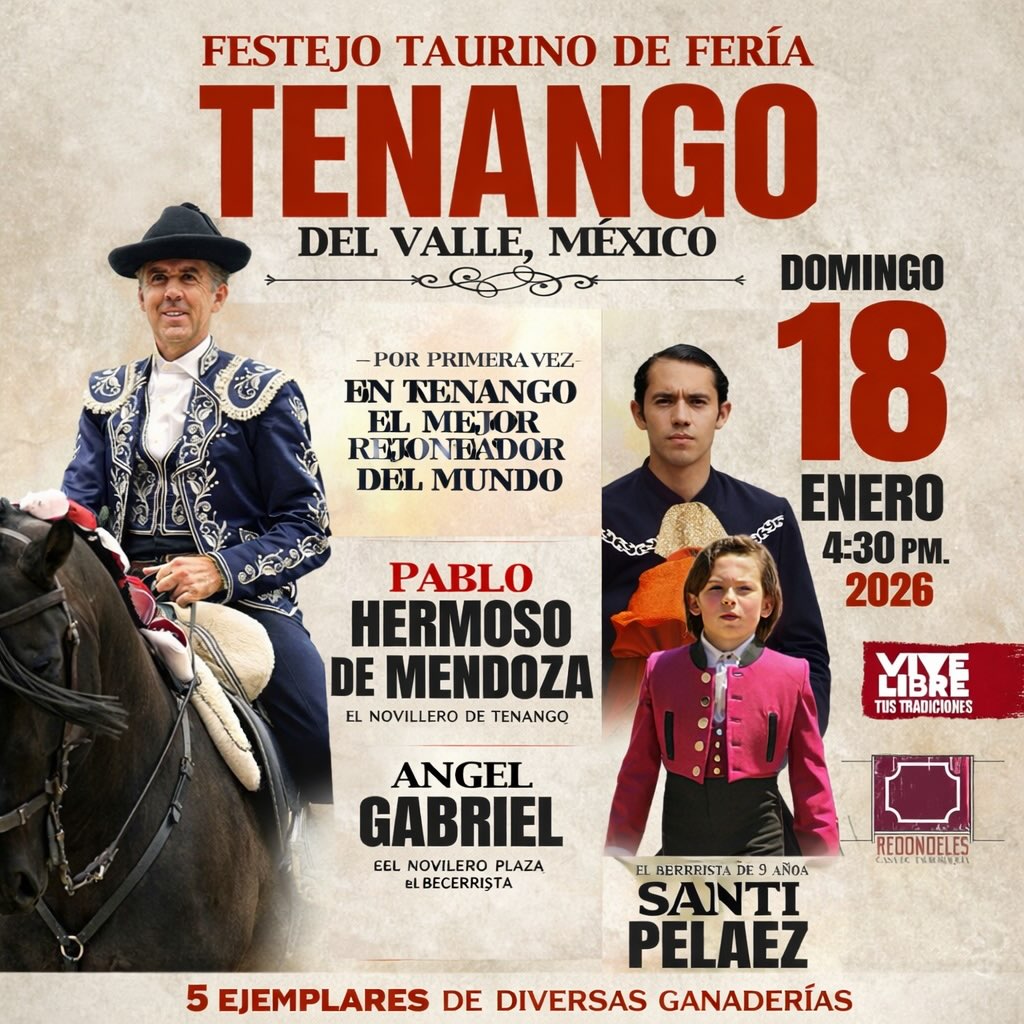 La empresa Redondeles – Casa de Tauromaquia ha dado a conocer el cartel del tradicional festejo de la Feria de Tenango del Valle. Estado de México que se llevará a cabo el domingo 18 de enero de 2026 dando inicio a las 4 de la tarde.