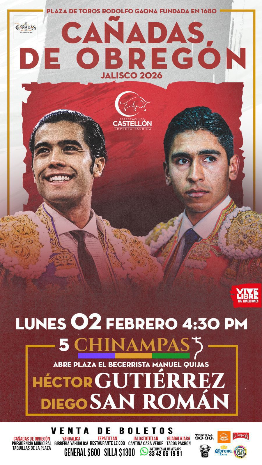 La empresa Castellón Espectáculos anuncia un acontecimiento para el próximo lunes 2 de febrero, en el marco de la festividad del Día de la Candelaria en la emblemática Plaza de Toros «Rodolfo Gaona» (fundada en 1680 y reconocida como el coso más antiguo de América) La cual abrirá sus puertas para un «Mano a Mano» inédito, en la que por primera vez, se verán do|s jóvenes toreros que hoy por hoy lideran el escalafón nacional y representan la renovación del toreo en México: Diego San Román y Héctor Gutiérrez.
