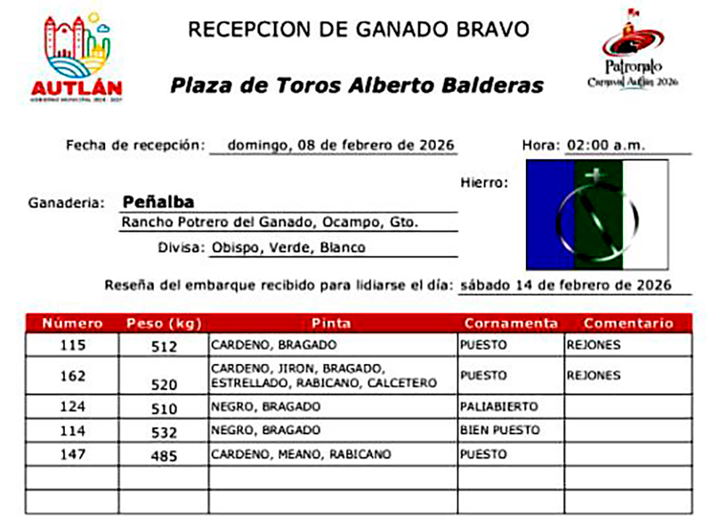 Ya se encuentran en los corrales de la plaza de la «Alberto Balderas” Los ejemplares de la ganadería de Peñalba los cuales fueron reseñados y aprobados por la autoridad de la plaza que encabeza el juez Roberto Vázquez Medina, para ser lidiados el próximo sábado 14 de febrero en el primer festejo del Carnaval de Autlán de la Grana por el rejoneador Guillermo Hermoso de Mendoza, y los diestros Ernesto Javier «Calita» y Luis David.