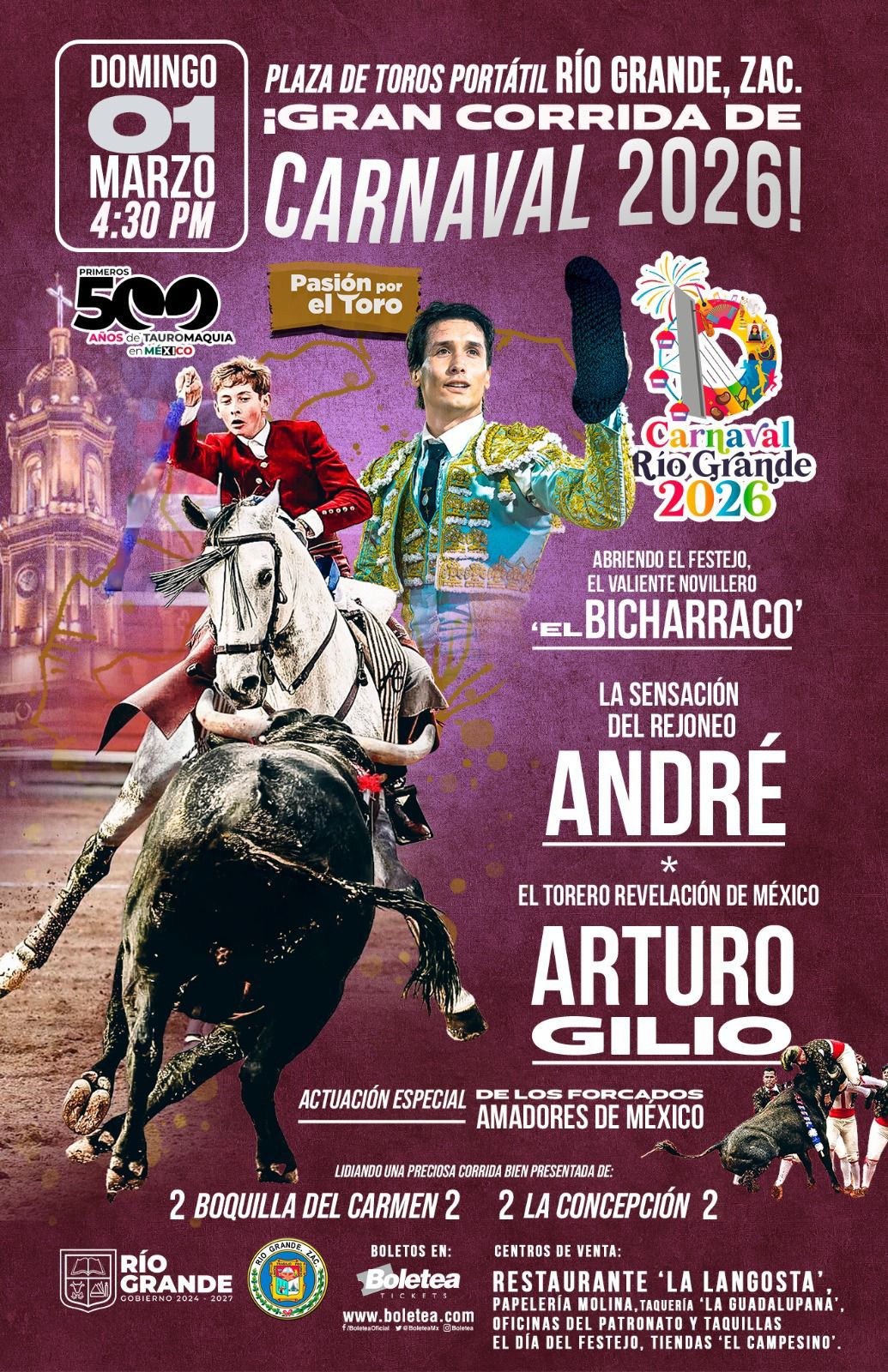 En el festejo están anunciados el rejoneador André, acompañado por los Forcados Amadores de México, así como el matador Arturo Gilio y el novillero Ricardo López “El Bicharraco”, quienes lidiarán dos toros de Boquilla del Carmen y dos de La Concepción.