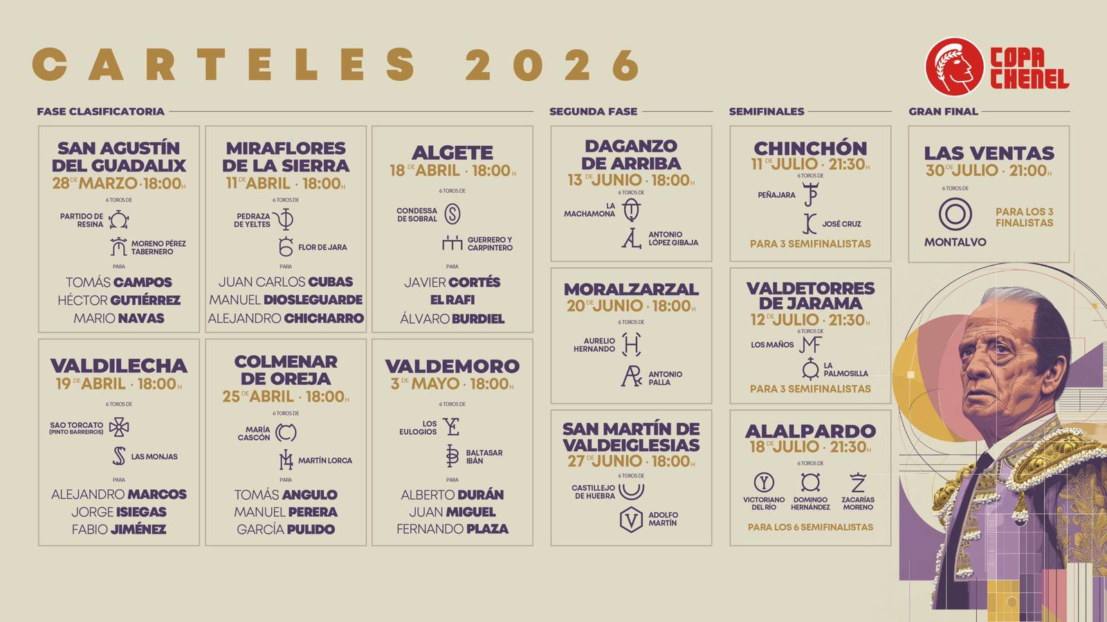 Además, el certamen que contará con dos nuevas plazas en la edición de 2026, Daganzo de Arriba y Las Ventas. El certamen estará compuesto por 13 festejos y contará con cuatro fases. La primera de ellas comenzará el 28 de marzo en San Agustín del Guadalix; el 11 de abril, la segunda corrida a celebrar en Miraflores de la Sierra; el sábado 18 de abril será el turno de Algete; fin de semana completo que se cerrará con la corrida del 19 de abril en Valdilecha; el 25 de abril, Colmenar de Oreja volverá a acoger el certamen; y el 3 de mayo, se cerrará la primera fase en Valdemoro, siendo estos los carteles que se hayan sorteado.