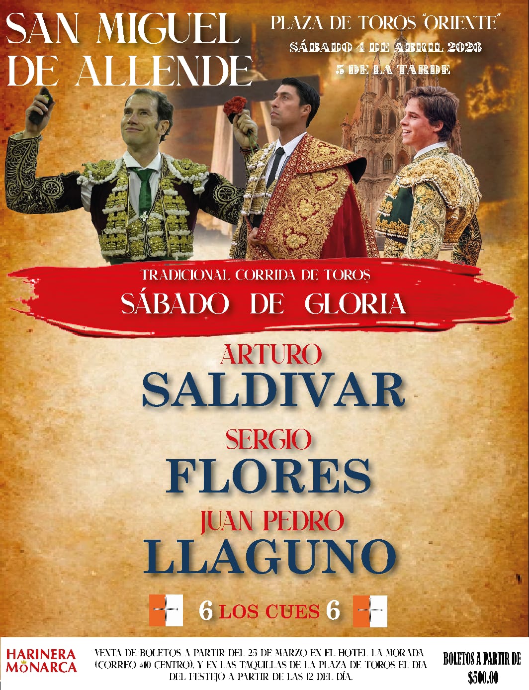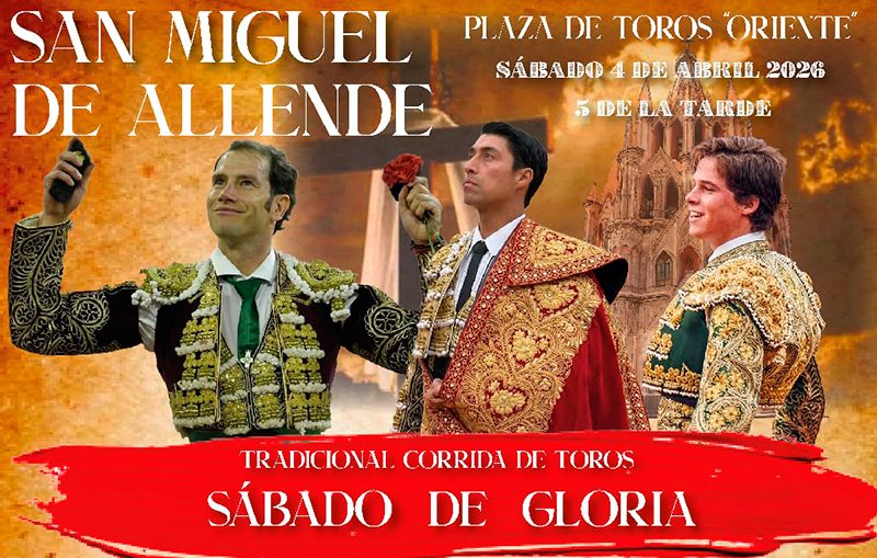 El sábado 4 de abril de 2026 se dará la tradicional corrida de toros de sábado de Gloria en la plaza de toros “Oriente” de San Miguel de Allende, Guanajuato. Se trata de un cartel interesante conformado por los diestros Arturo Saldívar, Sergio Flores y Juan Pedro LLaguno. En cuanto a la materia prima ganadera, se lidiarán ejemplares de Los Cues.