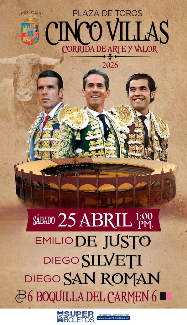 La Plaza de Toros Cinco Villas comprometida con la tauromaquia nacional y luego del rotundo éxito de la corrida del pasado 22 de febrero, anuncia la celebración de la “Gran Corrida de Arte y Valor”, que se llevará a cabo el sábado 25 de abril a la 1:00 p.m., en una tarde que reunirá a destacadas figuras del toreo y que promete grandes emociones para la afición.