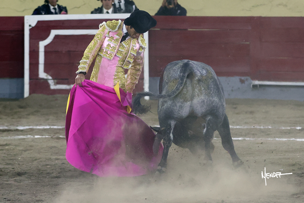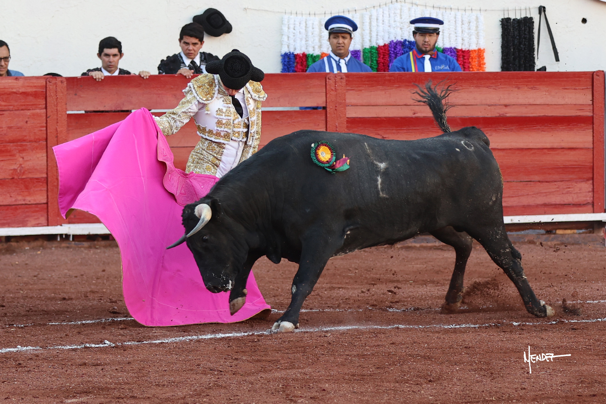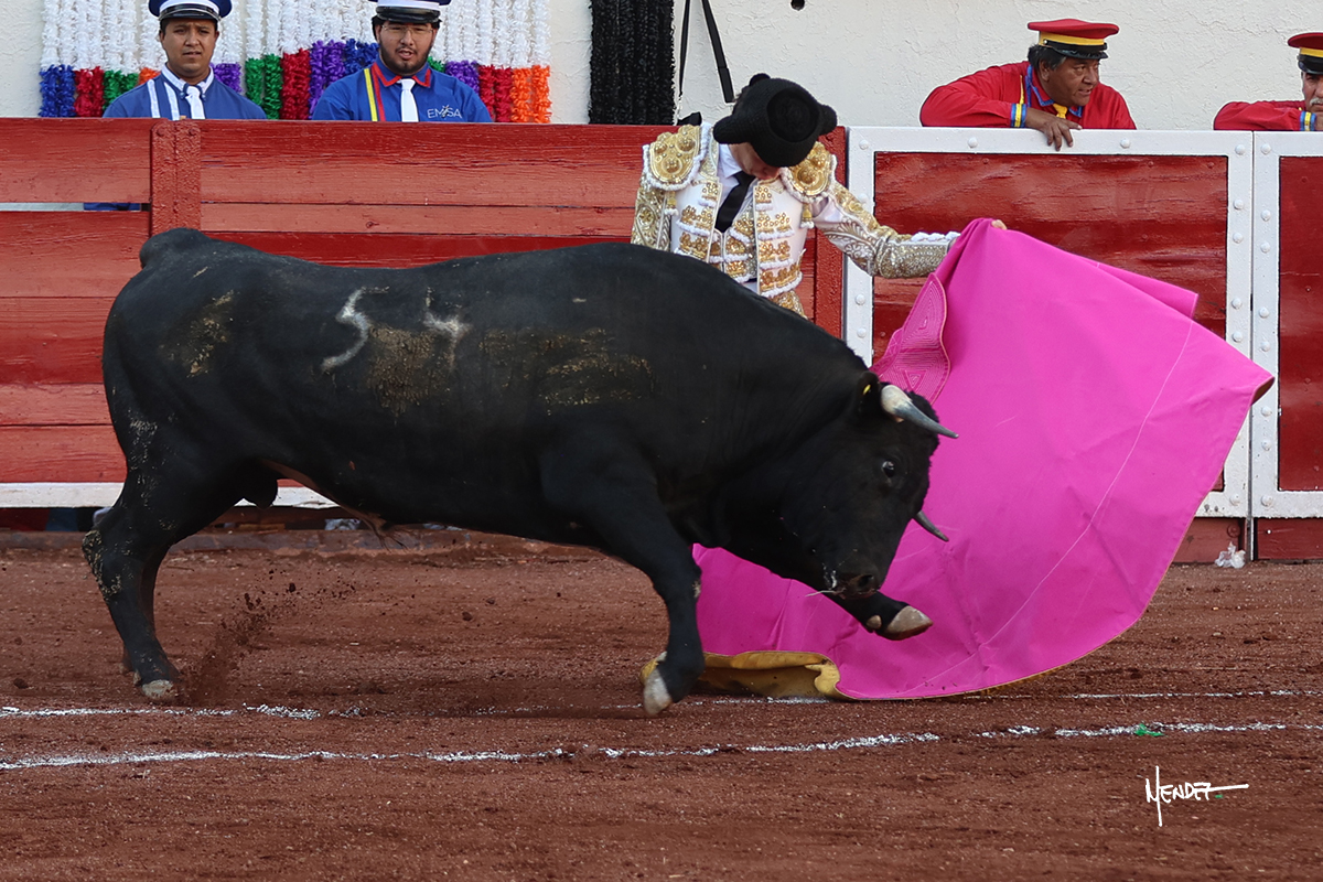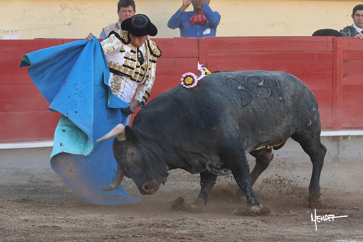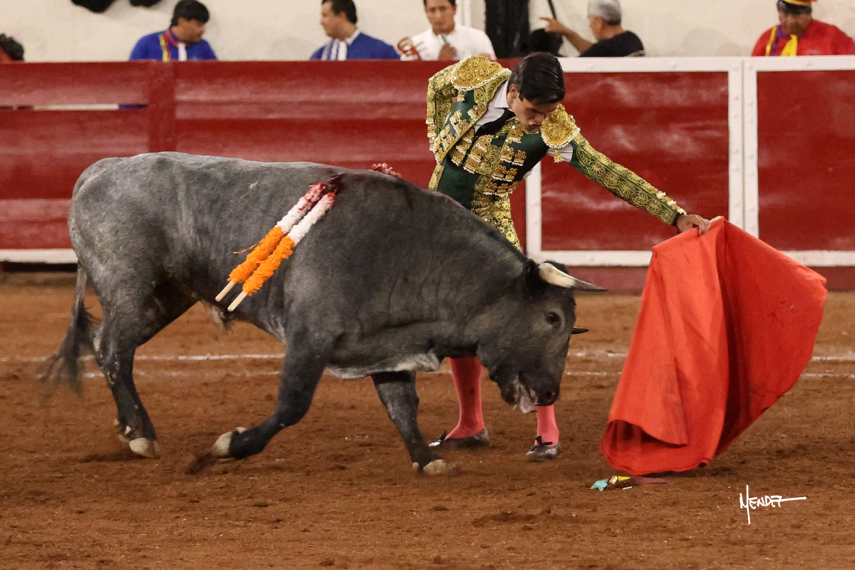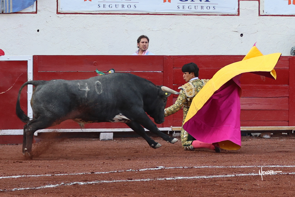 El Quitos saludó al primero de la tarde con una brega llevada, tratando de ganarle terreno hasta rematarlo por una media en el tercio. Comenzó la faena de muleta genuflexo, pasándolo por abajo para después sacarlo más allá del tercio y empezar a llevarlo sobre el pitón izquierdo. Le bajó la mano, le dio tiempo y trató de llevarlo con suavidad. Lo desarmó, así que recompuso y volvió a la cara de un animal incierto, que no humillaba y que no obedecía en exceso. Pasaba, pero buscaba y miraba. Le estaba avisando, pero siguió insistiendo, de nuevo al natural aprovechando la implique de los vuelos, pero sin evitar que le buscara. Se metió en tablas y el animal ya no pasaba. No tuvo acierto con los aceros, teniendo que descabellar.