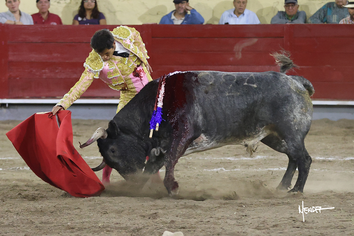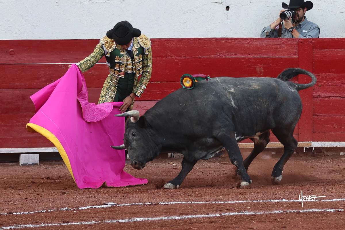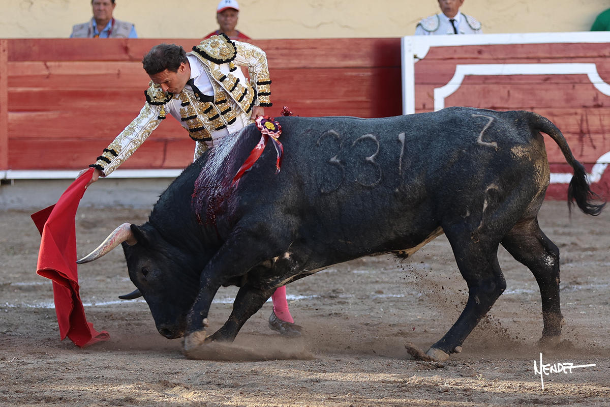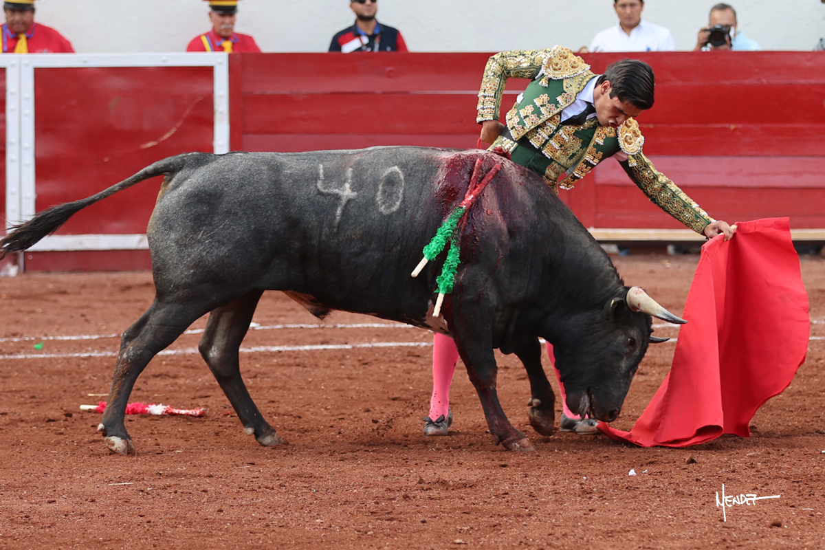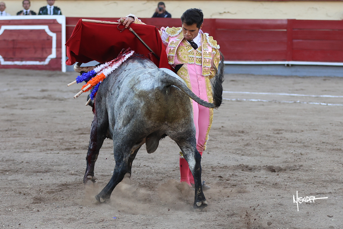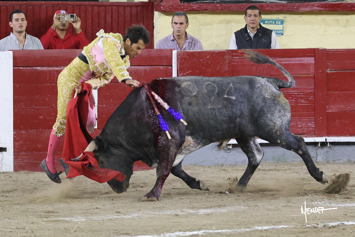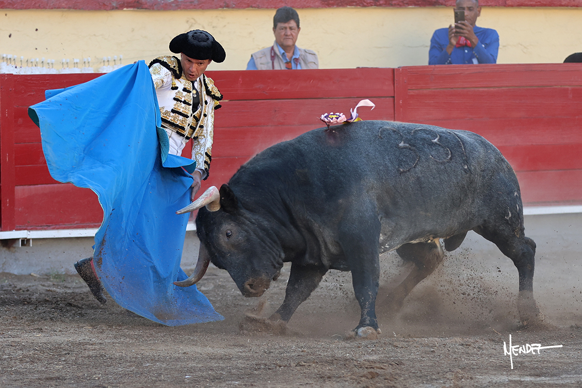 El Quitos saludó al primero de la tarde con una brega llevada, tratando de ganarle terreno hasta rematarlo por una media en el tercio. Comenzó la faena de muleta genuflexo, pasándolo por abajo para después sacarlo más allá del tercio y empezar a llevarlo sobre el pitón izquierdo. Le bajó la mano, le dio tiempo y trató de llevarlo con suavidad. Lo desarmó, así que recompuso y volvió a la cara de un animal incierto, que no humillaba y que no obedecía en exceso. Pasaba, pero buscaba y miraba. Le estaba avisando, pero siguió insistiendo, de nuevo al natural aprovechando la implique de los vuelos, pero sin evitar que le buscara. Se metió en tablas y el animal ya no pasaba. No tuvo acierto con los aceros, teniendo que descabellar.