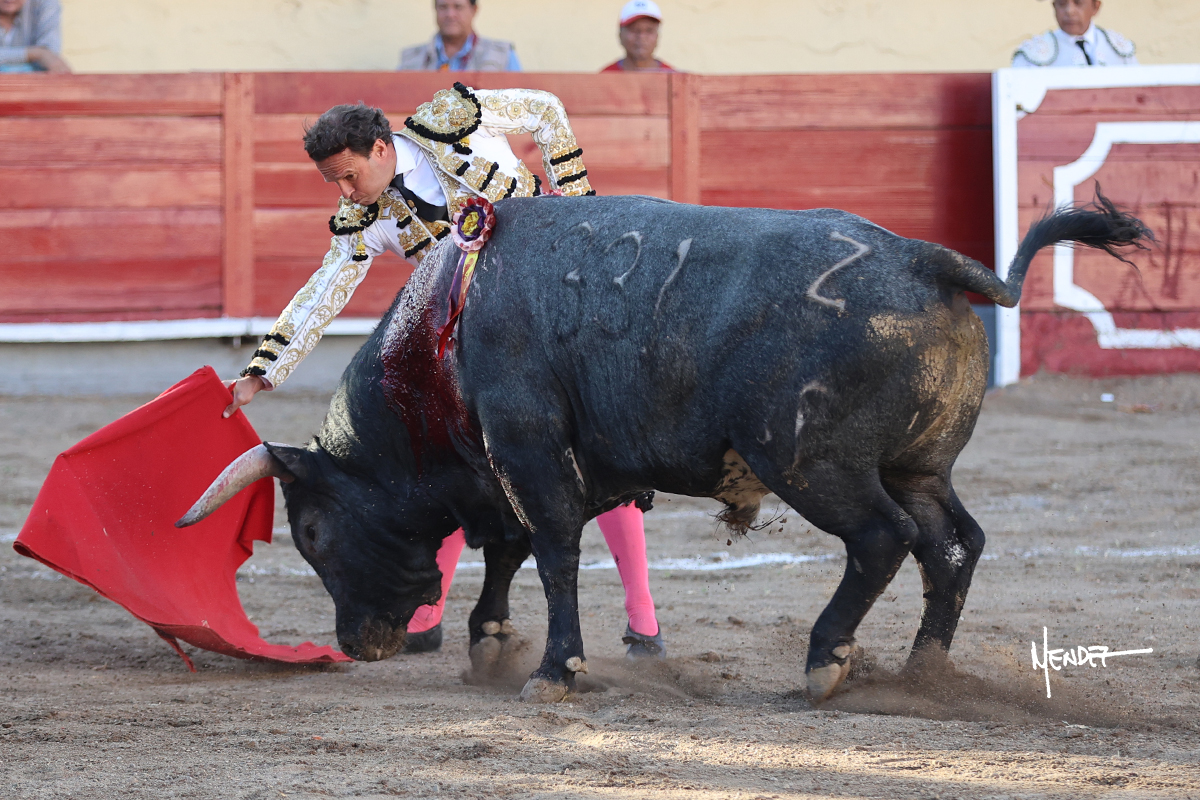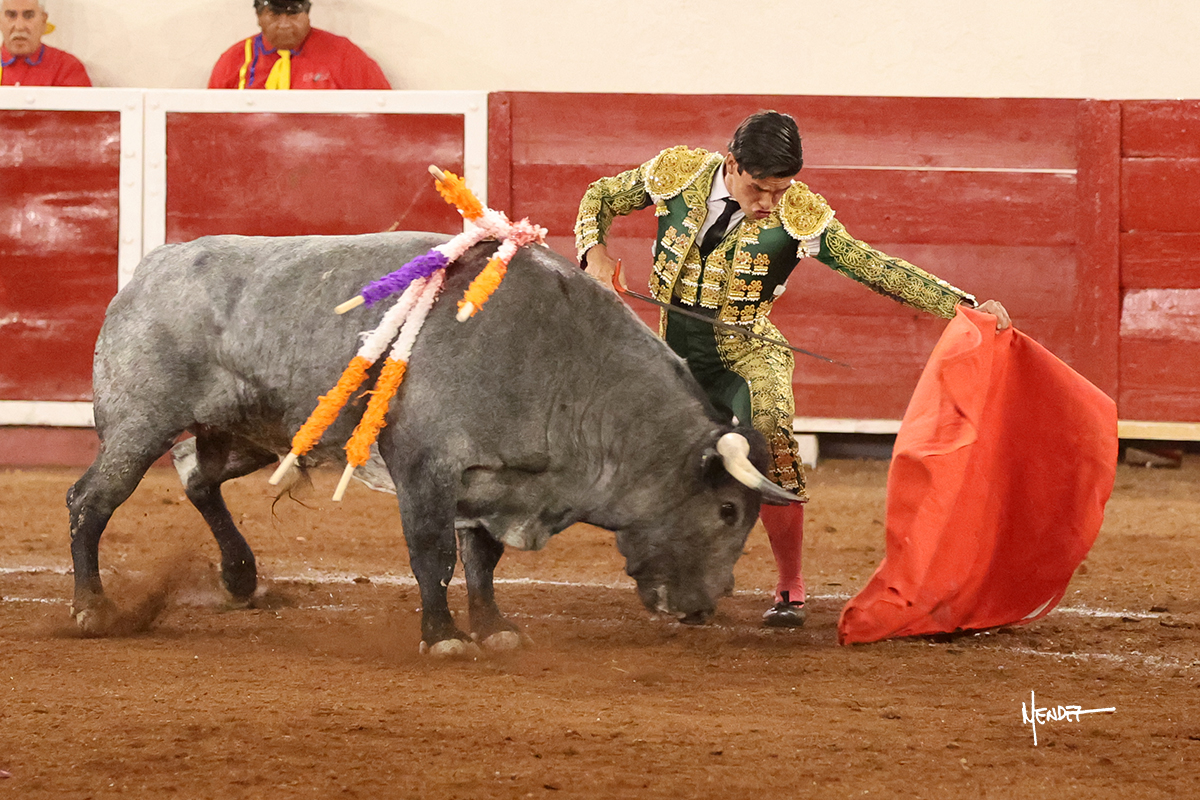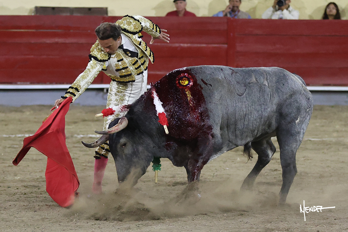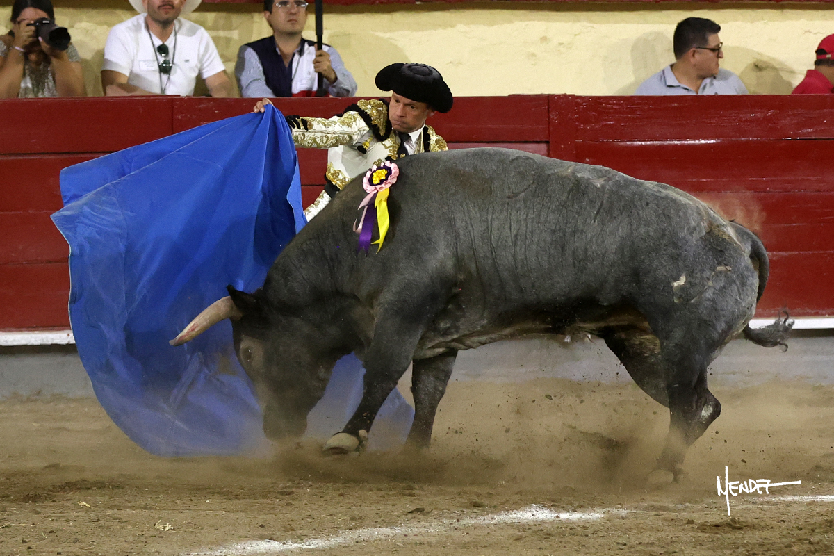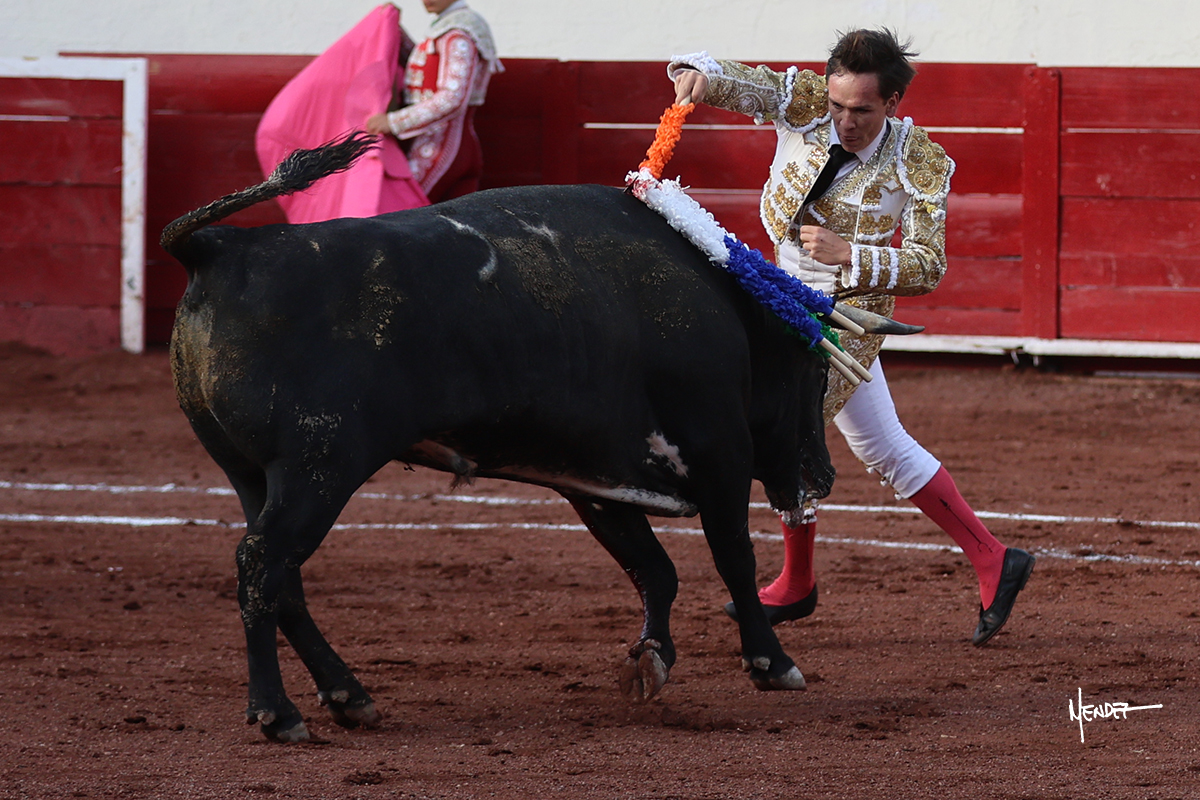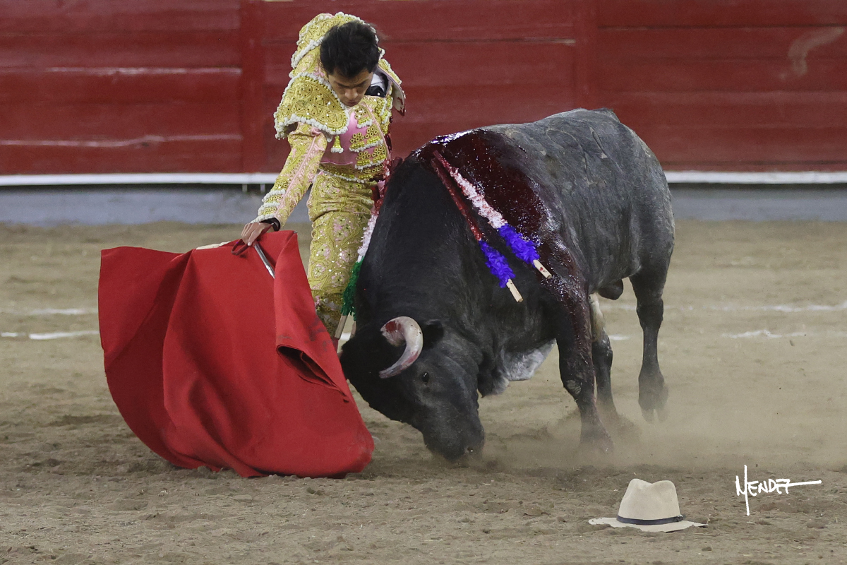 El Quitos saludó al primero de la tarde con una brega llevada, tratando de ganarle terreno hasta rematarlo por una media en el tercio. Comenzó la faena de muleta genuflexo, pasándolo por abajo para después sacarlo más allá del tercio y empezar a llevarlo sobre el pitón izquierdo. Le bajó la mano, le dio tiempo y trató de llevarlo con suavidad. Lo desarmó, así que recompuso y volvió a la cara de un animal incierto, que no humillaba y que no obedecía en exceso. Pasaba, pero buscaba y miraba. Le estaba avisando, pero siguió insistiendo, de nuevo al natural aprovechando la implique de los vuelos, pero sin evitar que le buscara. Se metió en tablas y el animal ya no pasaba. No tuvo acierto con los aceros, teniendo que descabellar.