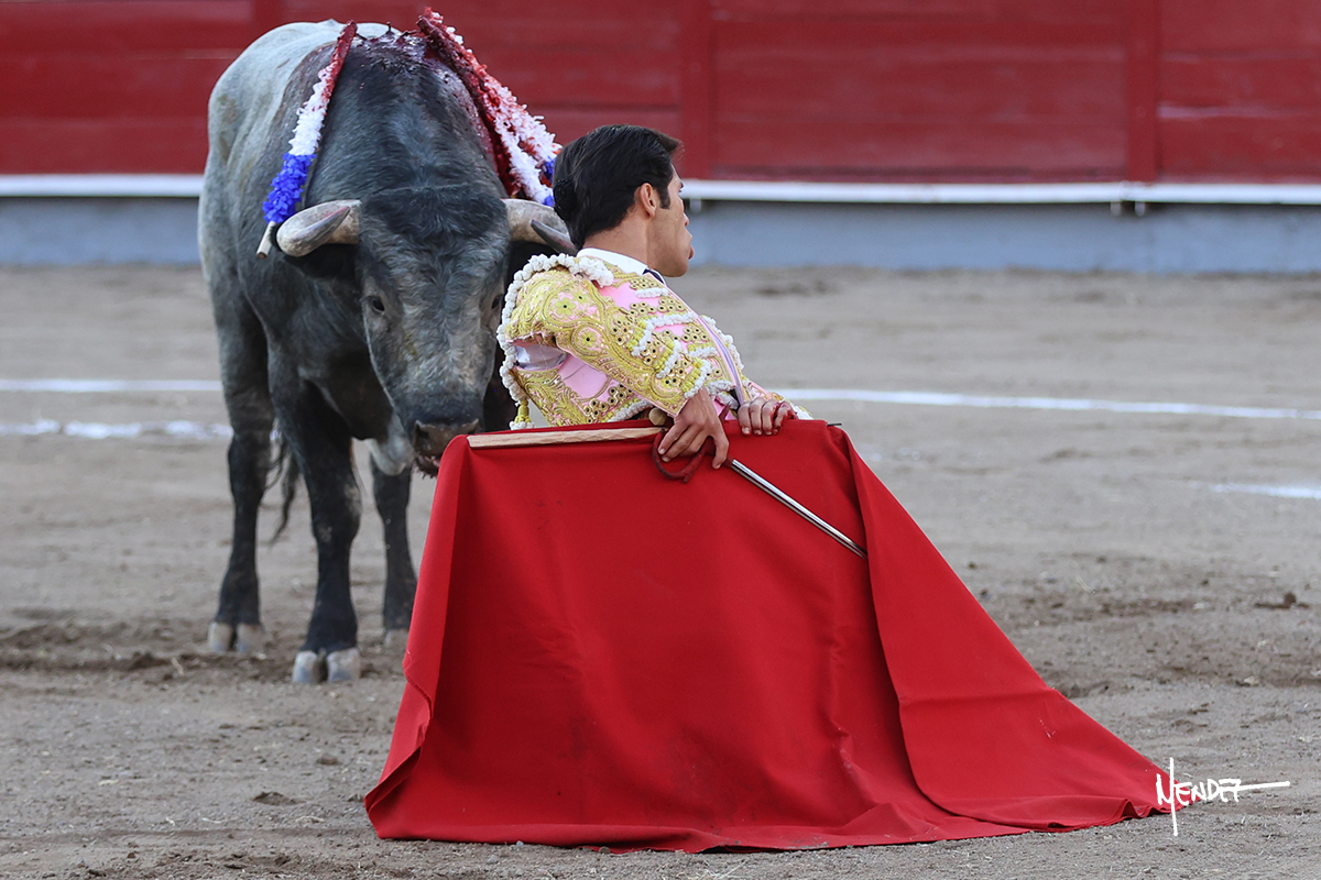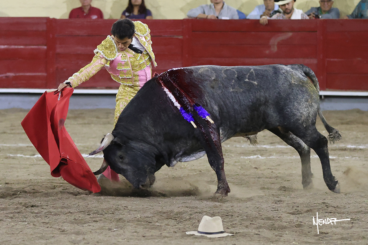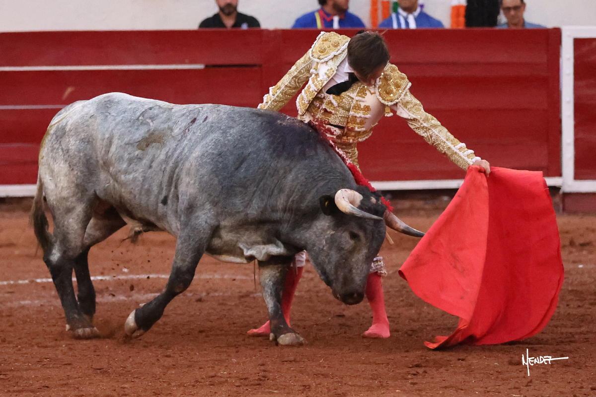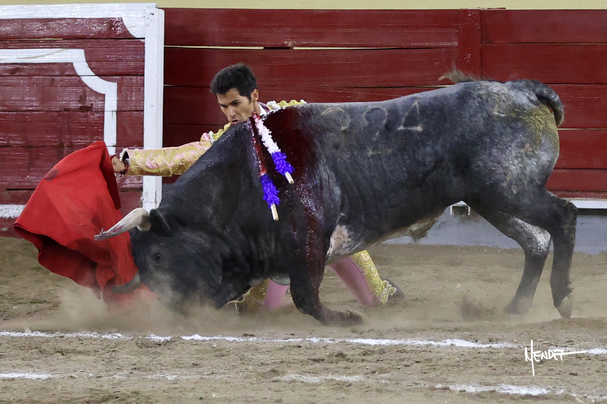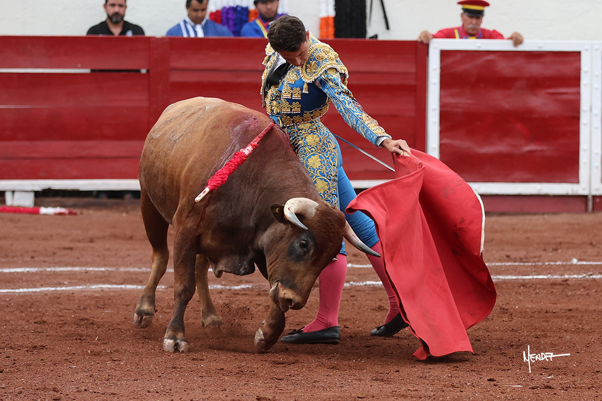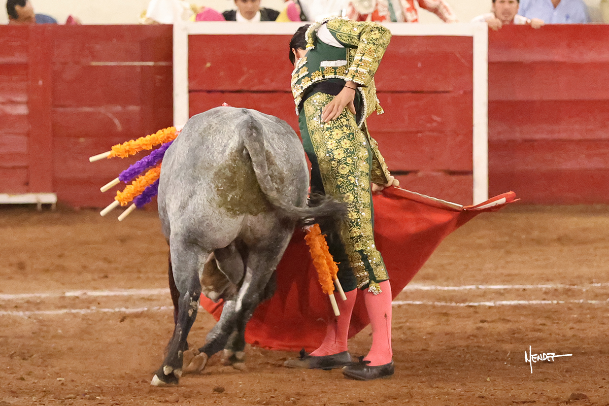 El Quitos saludó al primero de la tarde con una brega llevada, tratando de ganarle terreno hasta rematarlo por una media en el tercio. Comenzó la faena de muleta genuflexo, pasándolo por abajo para después sacarlo más allá del tercio y empezar a llevarlo sobre el pitón izquierdo. Le bajó la mano, le dio tiempo y trató de llevarlo con suavidad. Lo desarmó, así que recompuso y volvió a la cara de un animal incierto, que no humillaba y que no obedecía en exceso. Pasaba, pero buscaba y miraba. Le estaba avisando, pero siguió insistiendo, de nuevo al natural aprovechando la implique de los vuelos, pero sin evitar que le buscara. Se metió en tablas y el animal ya no pasaba. No tuvo acierto con los aceros, teniendo que descabellar.