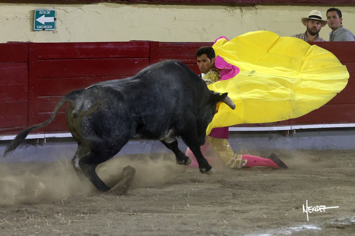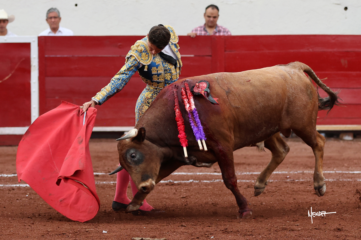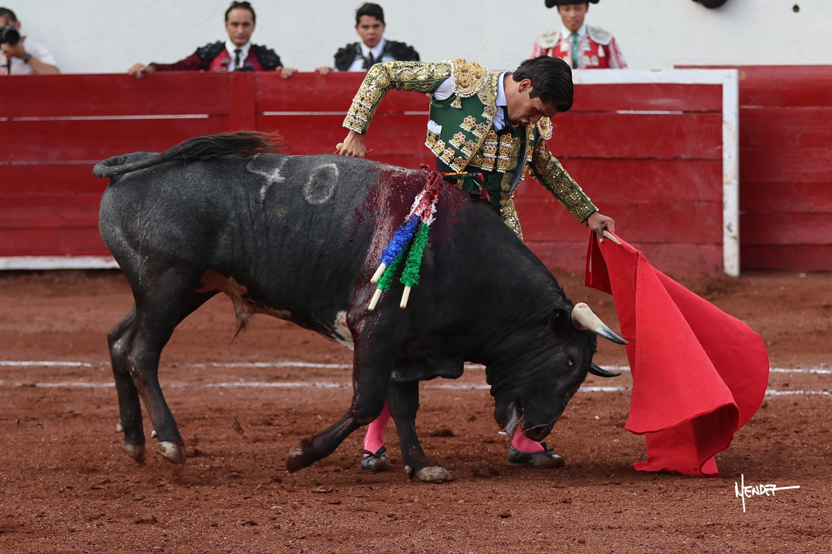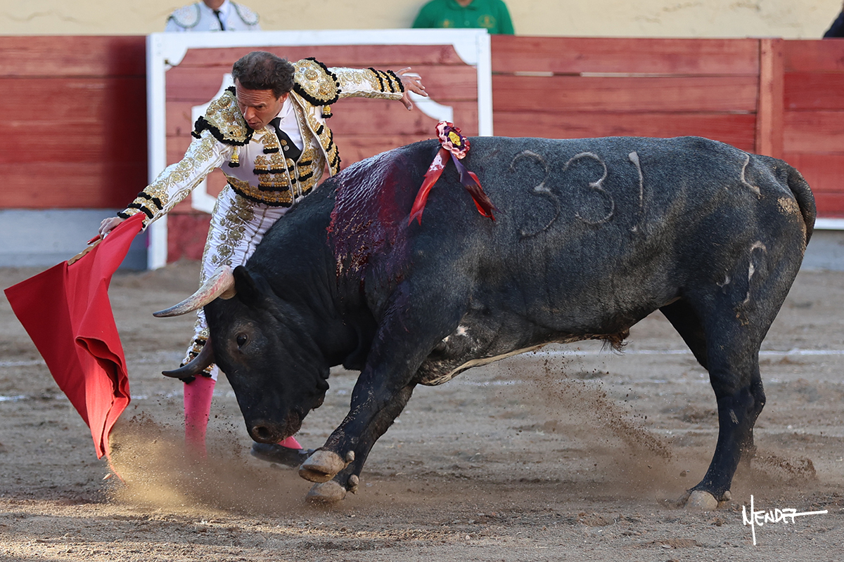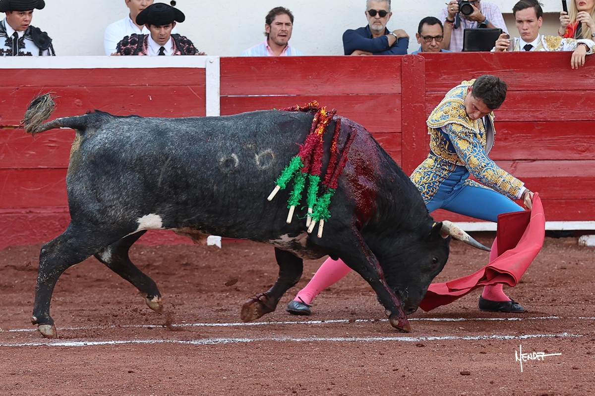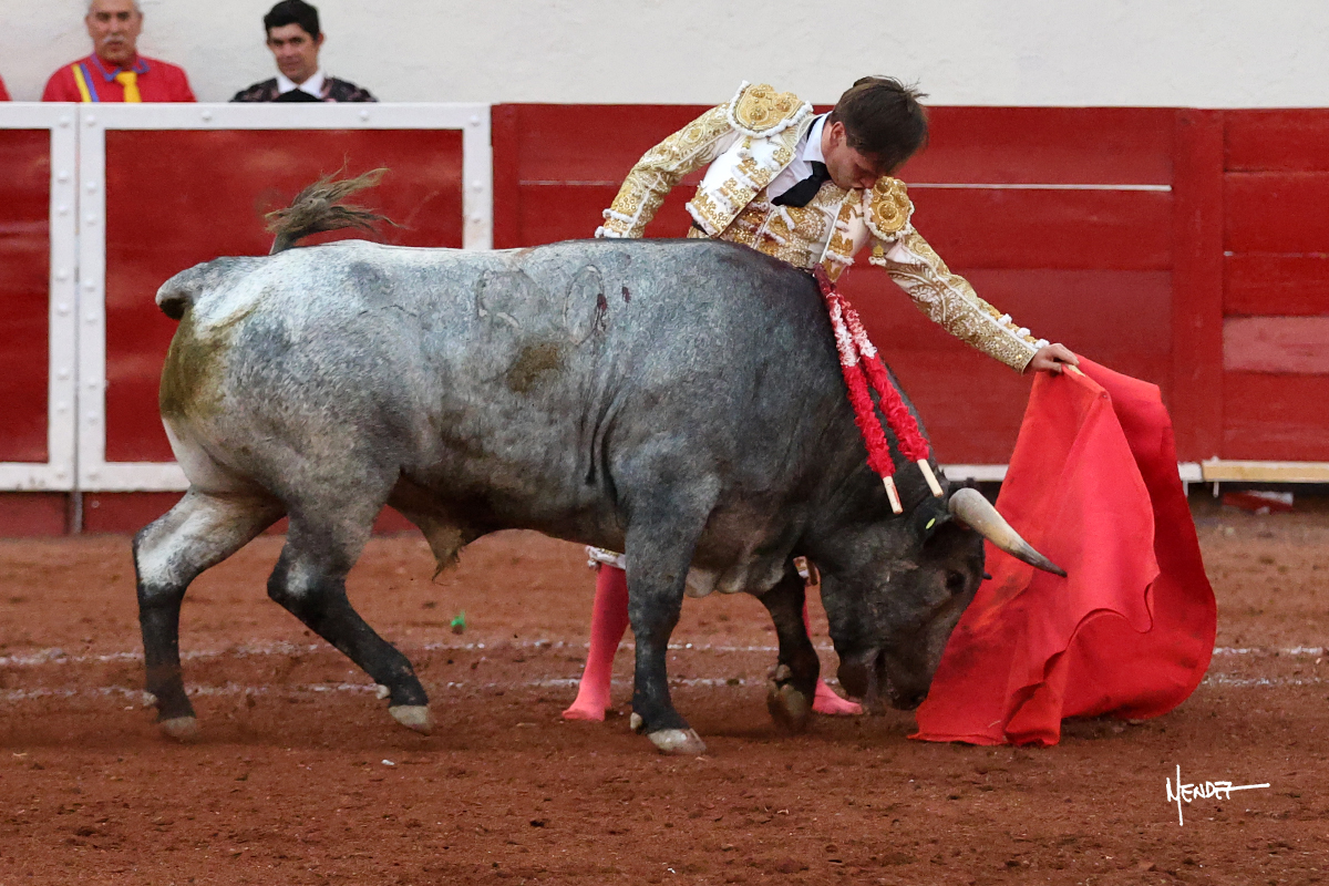 El Quitos saludó al primero de la tarde con una brega llevada, tratando de ganarle terreno hasta rematarlo por una media en el tercio. Comenzó la faena de muleta genuflexo, pasándolo por abajo para después sacarlo más allá del tercio y empezar a llevarlo sobre el pitón izquierdo. Le bajó la mano, le dio tiempo y trató de llevarlo con suavidad. Lo desarmó, así que recompuso y volvió a la cara de un animal incierto, que no humillaba y que no obedecía en exceso. Pasaba, pero buscaba y miraba. Le estaba avisando, pero siguió insistiendo, de nuevo al natural aprovechando la implique de los vuelos, pero sin evitar que le buscara. Se metió en tablas y el animal ya no pasaba. No tuvo acierto con los aceros, teniendo que descabellar.