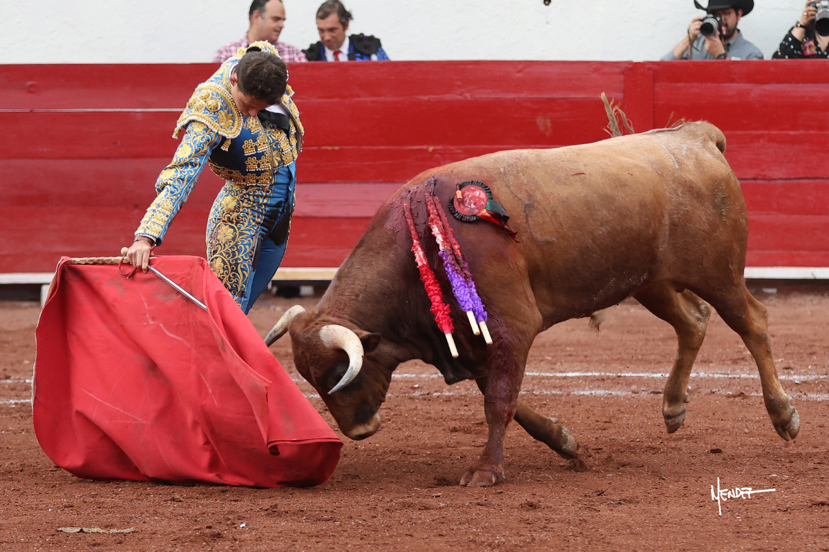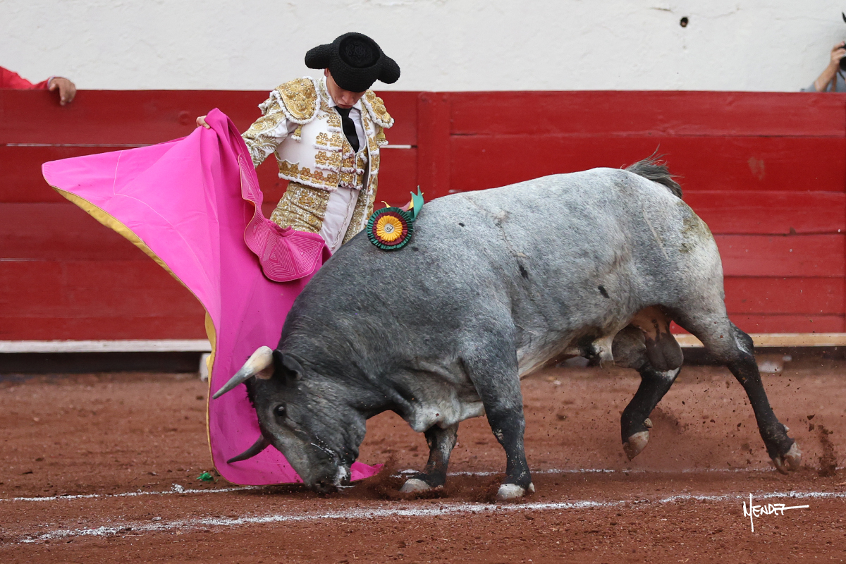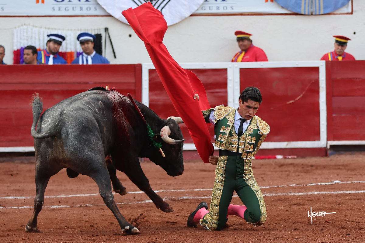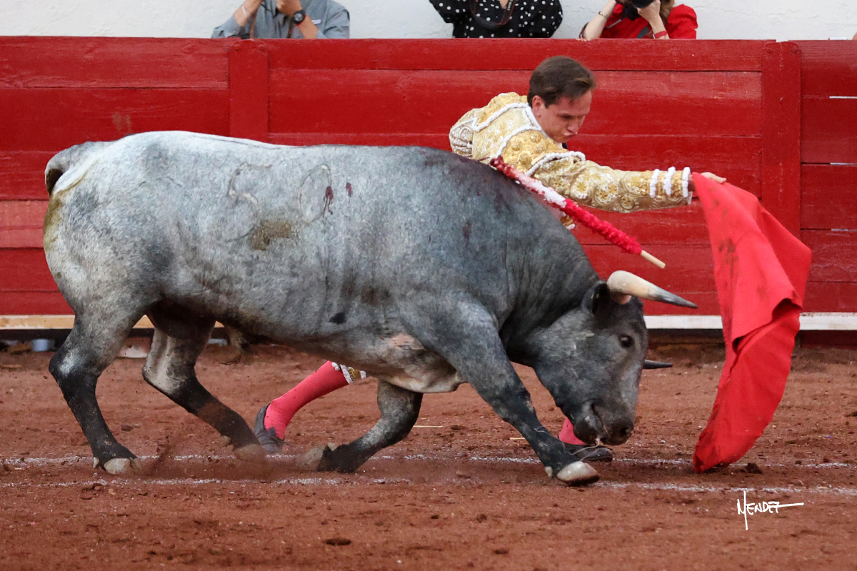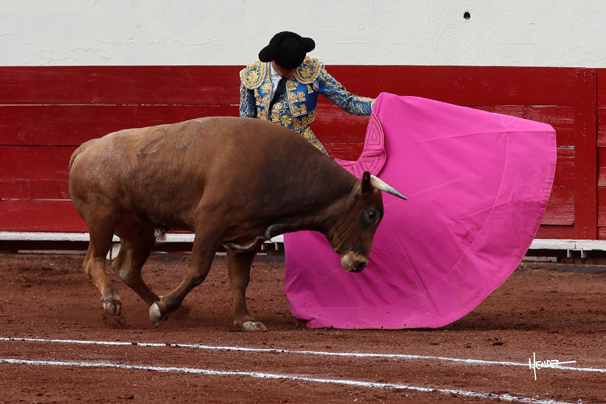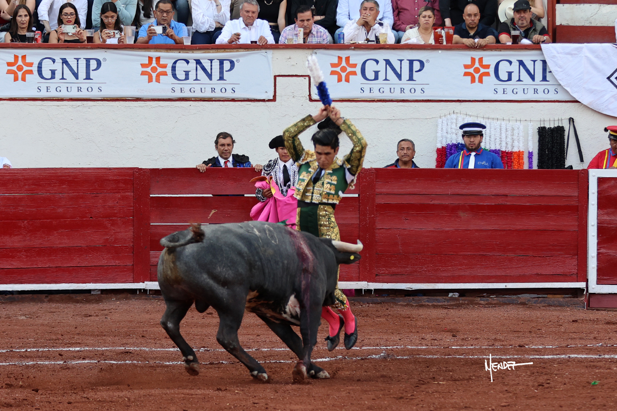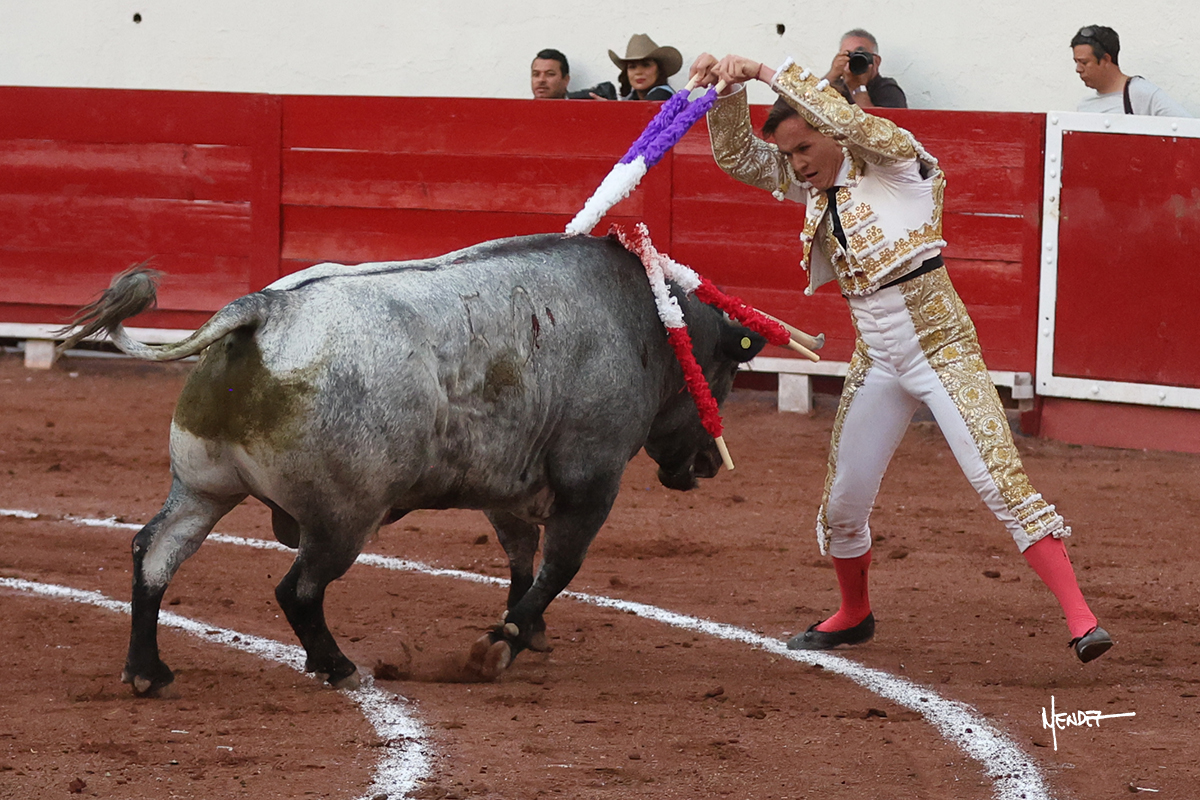El Quitos saludó al primero de la tarde con una brega llevada, tratando de ganarle terreno hasta rematarlo por una media en el tercio. Comenzó la faena de muleta genuflexo, pasándolo por abajo para después sacarlo más allá del tercio y empezar a llevarlo sobre el pitón izquierdo. Le bajó la mano, le dio tiempo y trató de llevarlo con suavidad. Lo desarmó, así que recompuso y volvió a la cara de un animal incierto, que no humillaba y que no obedecía en exceso. Pasaba, pero buscaba y miraba. Le estaba avisando, pero siguió insistiendo, de nuevo al natural aprovechando la implique de los vuelos, pero sin evitar que le buscara. Se metió en tablas y el animal ya no pasaba. No tuvo acierto con los aceros, teniendo que descabellar.