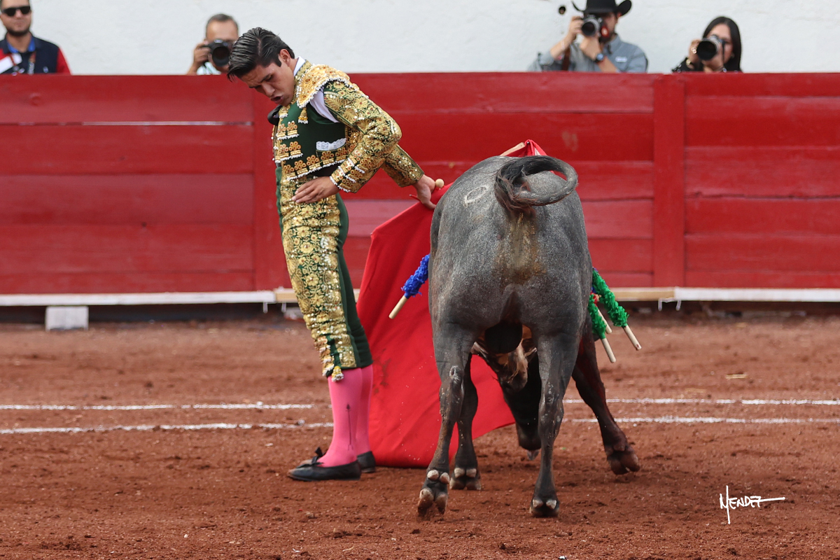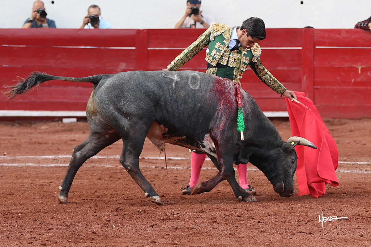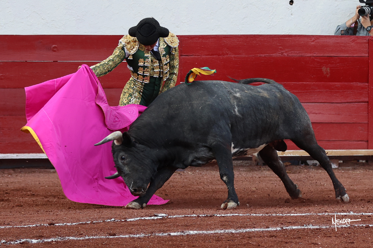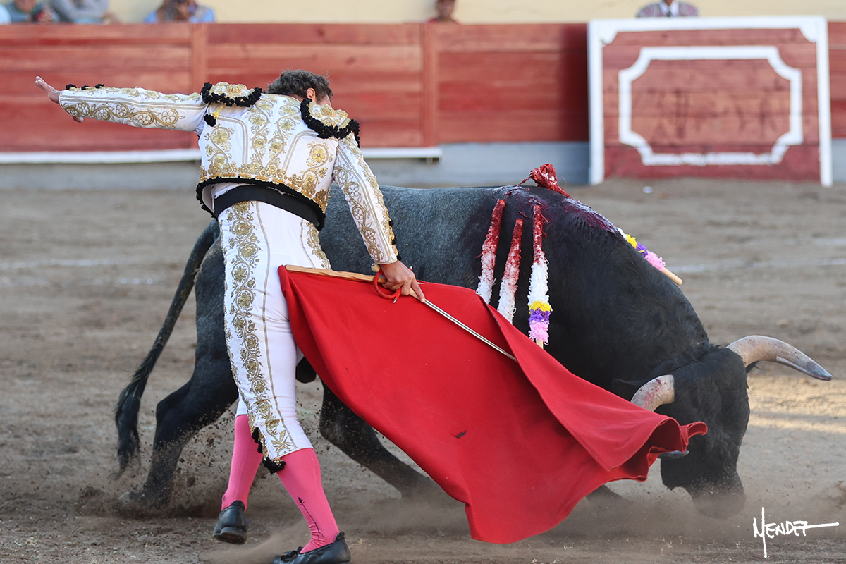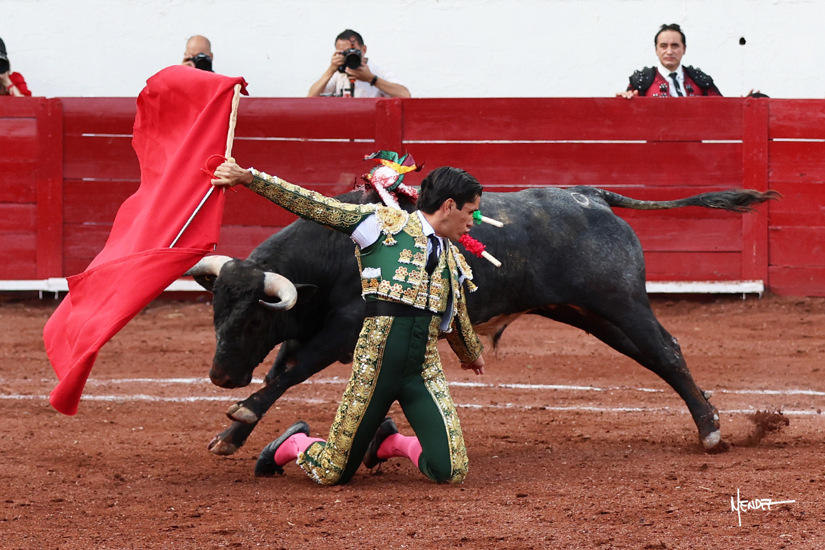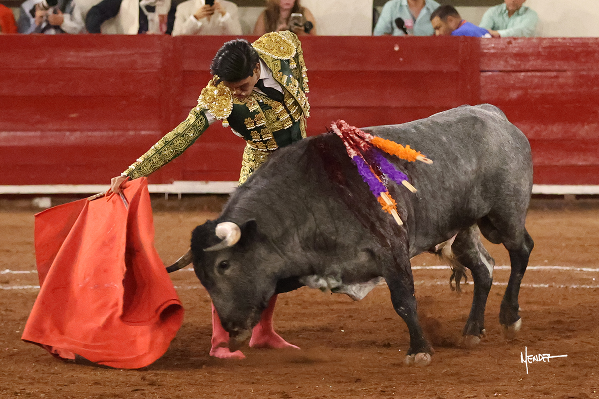 El Quitos saludó al primero de la tarde con una brega llevada, tratando de ganarle terreno hasta rematarlo por una media en el tercio. Comenzó la faena de muleta genuflexo, pasándolo por abajo para después sacarlo más allá del tercio y empezar a llevarlo sobre el pitón izquierdo. Le bajó la mano, le dio tiempo y trató de llevarlo con suavidad. Lo desarmó, así que recompuso y volvió a la cara de un animal incierto, que no humillaba y que no obedecía en exceso. Pasaba, pero buscaba y miraba. Le estaba avisando, pero siguió insistiendo, de nuevo al natural aprovechando la implique de los vuelos, pero sin evitar que le buscara. Se metió en tablas y el animal ya no pasaba. No tuvo acierto con los aceros, teniendo que descabellar.
