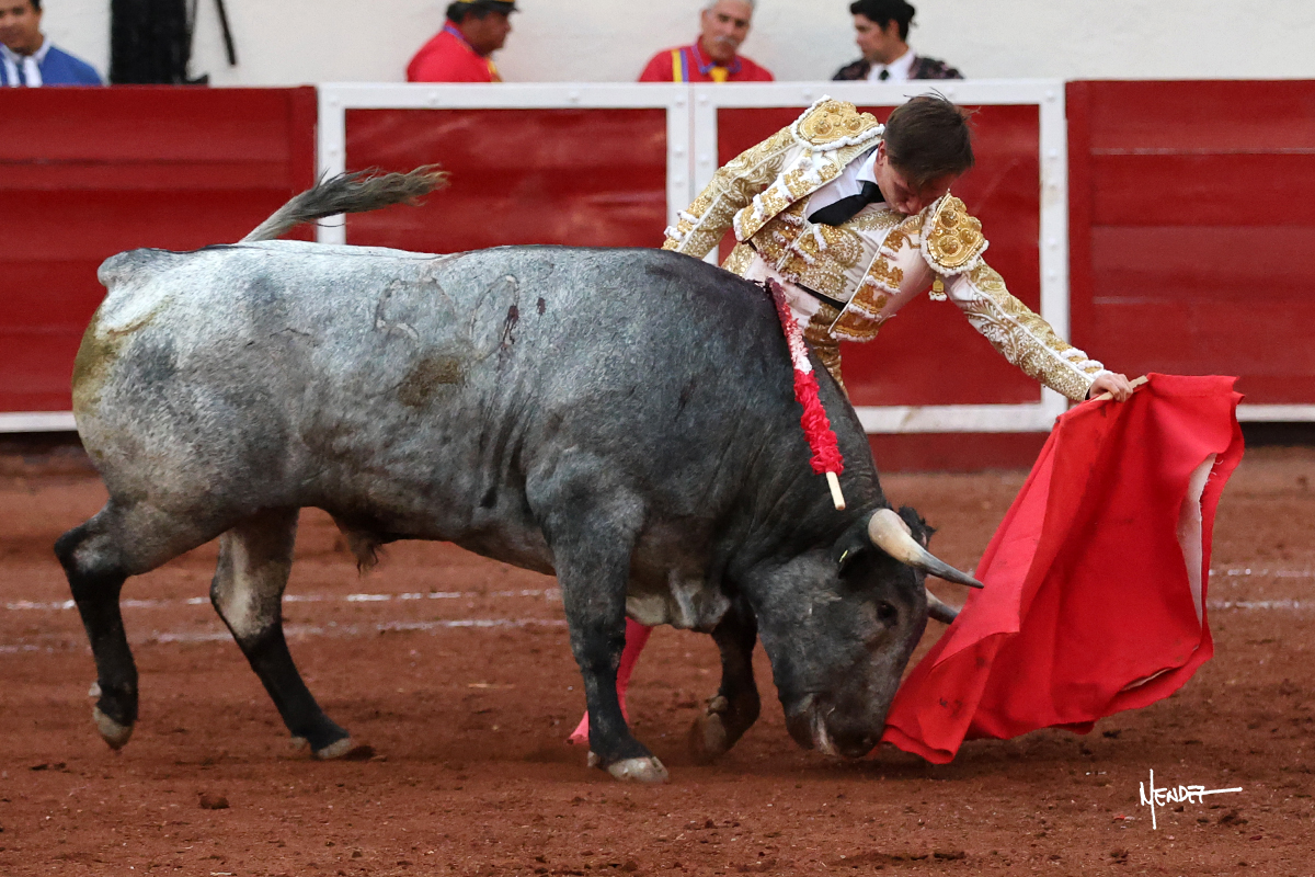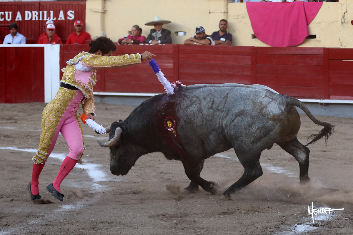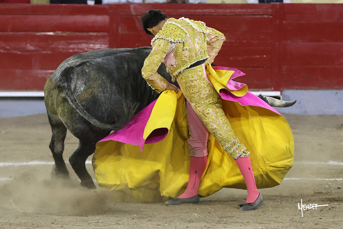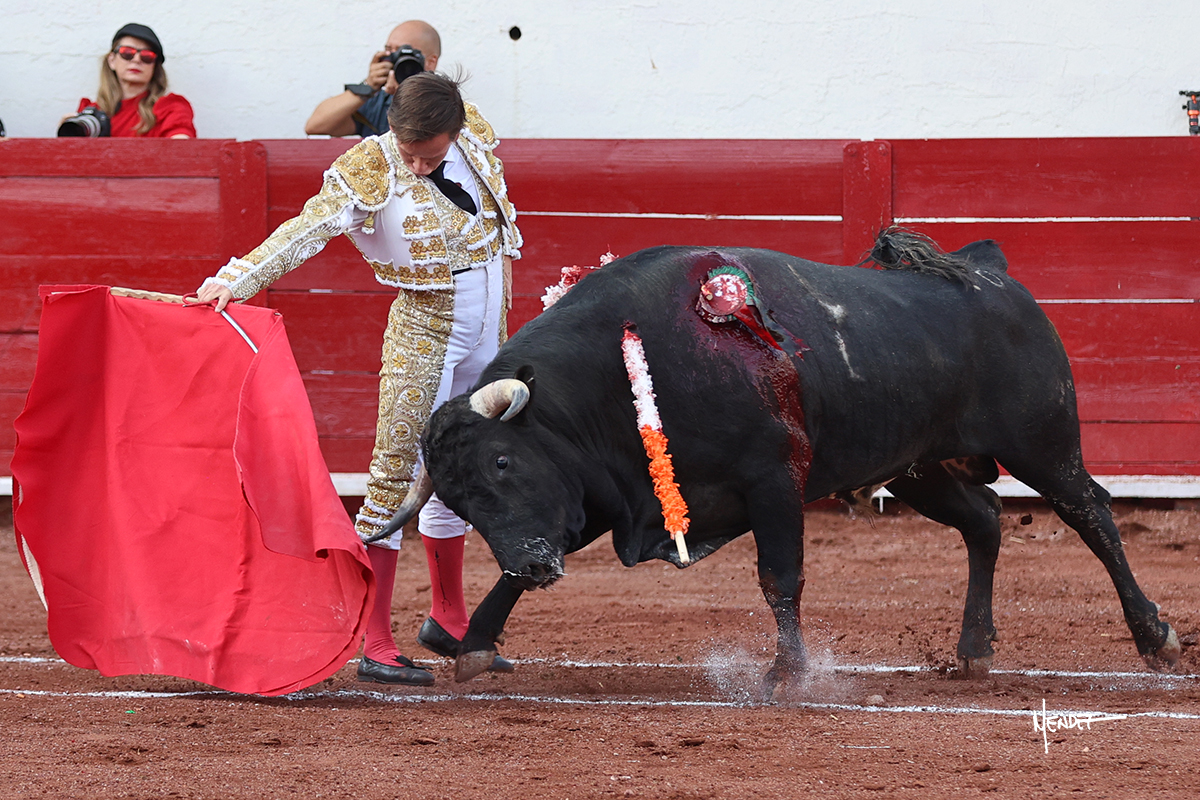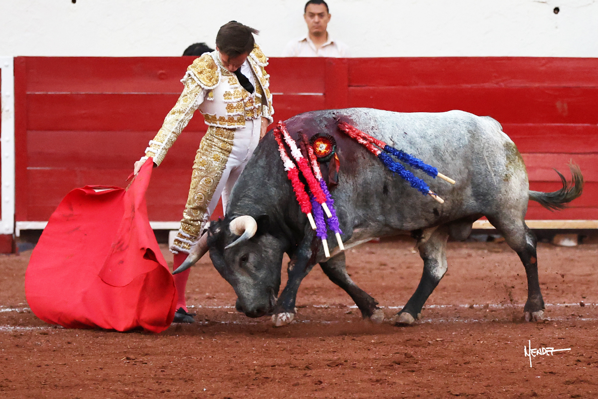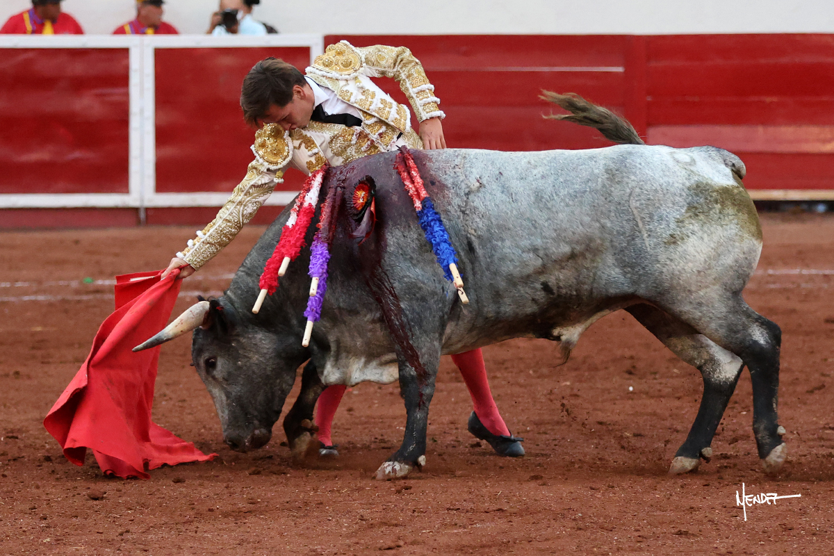 El Quitos saludó al primero de la tarde con una brega llevada, tratando de ganarle terreno hasta rematarlo por una media en el tercio. Comenzó la faena de muleta genuflexo, pasándolo por abajo para después sacarlo más allá del tercio y empezar a llevarlo sobre el pitón izquierdo. Le bajó la mano, le dio tiempo y trató de llevarlo con suavidad. Lo desarmó, así que recompuso y volvió a la cara de un animal incierto, que no humillaba y que no obedecía en exceso. Pasaba, pero buscaba y miraba. Le estaba avisando, pero siguió insistiendo, de nuevo al natural aprovechando la implique de los vuelos, pero sin evitar que le buscara. Se metió en tablas y el animal ya no pasaba. No tuvo acierto con los aceros, teniendo que descabellar.