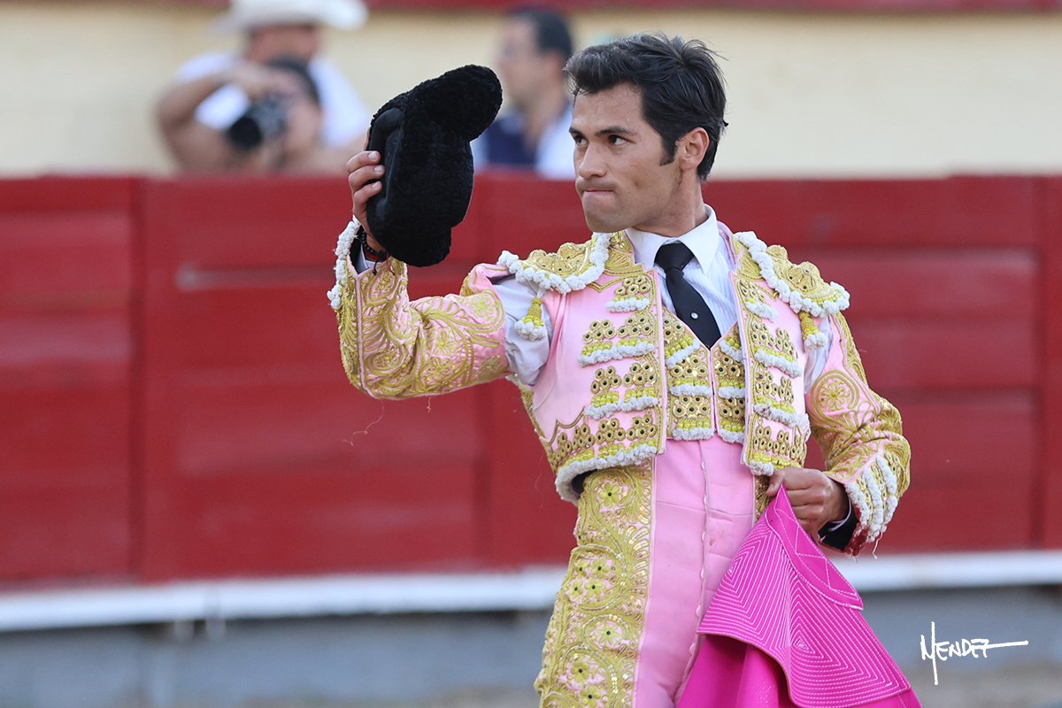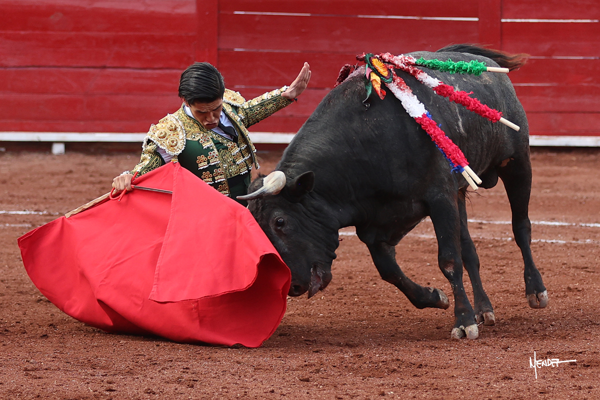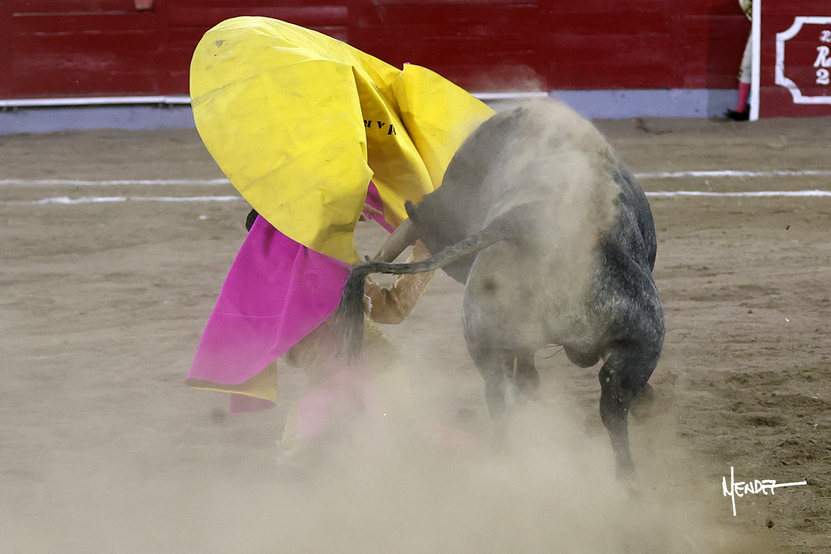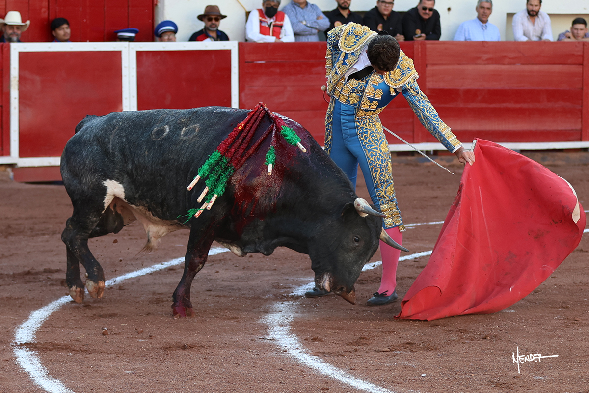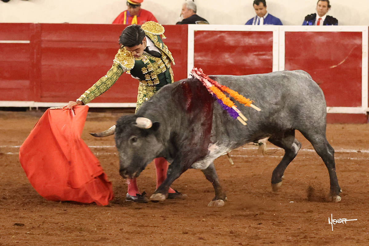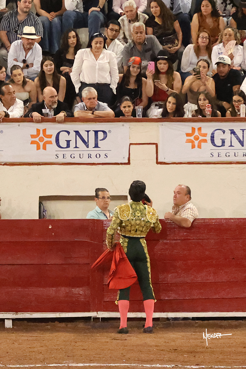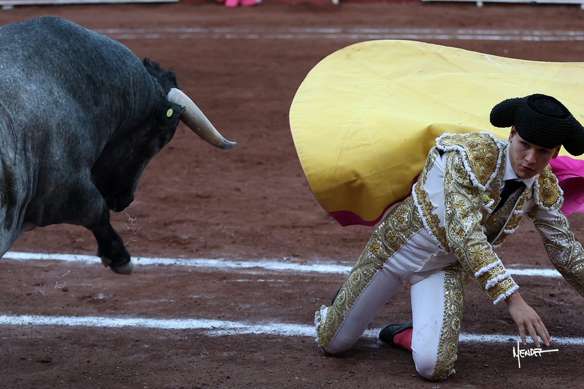 El Quitos saludó al primero de la tarde con una brega llevada, tratando de ganarle terreno hasta rematarlo por una media en el tercio. Comenzó la faena de muleta genuflexo, pasándolo por abajo para después sacarlo más allá del tercio y empezar a llevarlo sobre el pitón izquierdo. Le bajó la mano, le dio tiempo y trató de llevarlo con suavidad. Lo desarmó, así que recompuso y volvió a la cara de un animal incierto, que no humillaba y que no obedecía en exceso. Pasaba, pero buscaba y miraba. Le estaba avisando, pero siguió insistiendo, de nuevo al natural aprovechando la implique de los vuelos, pero sin evitar que le buscara. Se metió en tablas y el animal ya no pasaba. No tuvo acierto con los aceros, teniendo que descabellar.