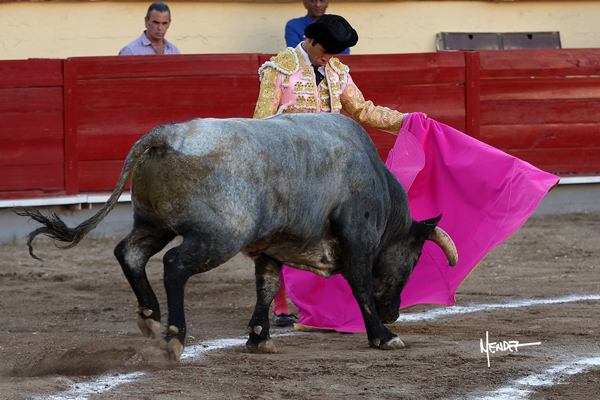 El Quitos saludó al cuarto de la tarde, llevándolo en su capote. Brindó al matador de toros Mario Navas y comenzó su faena de muleta llevándolo por ambos pitones, sacándolo del tercio. Continuó sobre el pitón derecho en aquellos terrenos, uno a uno, sin evitar que perdiera las manos. Tenía que pasarlo con suavidad a aquel ejemplar de La Playa, que no resultó nada sencillo. Tenía sus teclas, pero le dio tiempo y sitio para cambiar al pitón izquierdo, pero se le quedaba corto y no lograba encontrar el ritmo ni el acople en aquella faena pausada que no conectó con los tendidos. Por el derecho logró robarle algún que otro muletazo, dejando pinceladas que saborearon en el tendido.