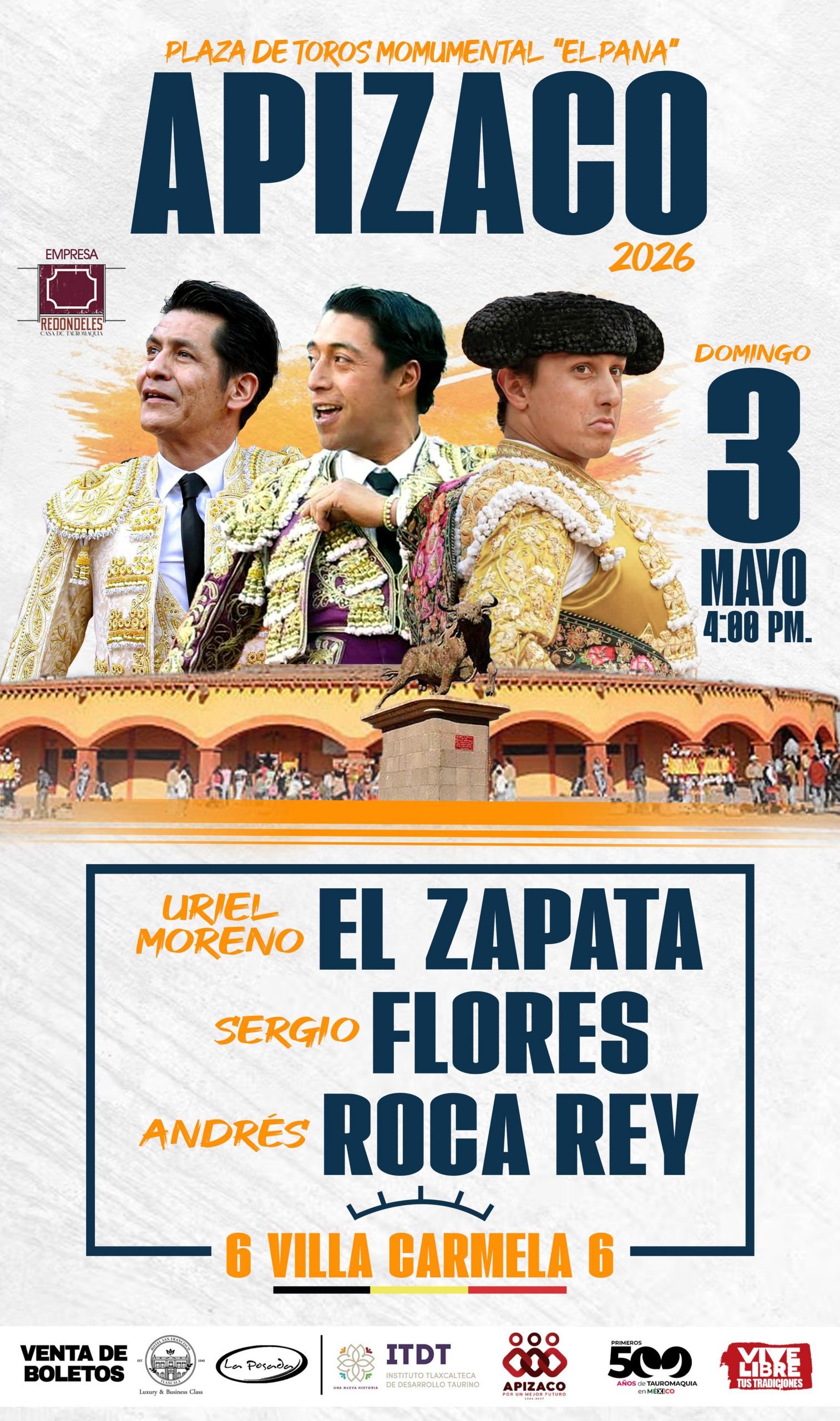 La empresa Redondeles Casa de Tauromaquia ha dado a conocer el cartel de una corrida extraordinaria para el el próximo domingo 3 de mayo en la plaza de toros Rodolfo Rodríguez “El Pana” de Apizaco Tlaxcala, con la presencia de la figura internacional, el peruano Andrés Roca Rey, quien regresa a este coso compartiendo el cartel con los tlaxcaltecas Uriel Moreno “El Zapata” y con Sergio Flores. En cuanto a la materia prima ganadera, se lidiarán ejemplares de la prestigiada ganadería de Villa Carmela.