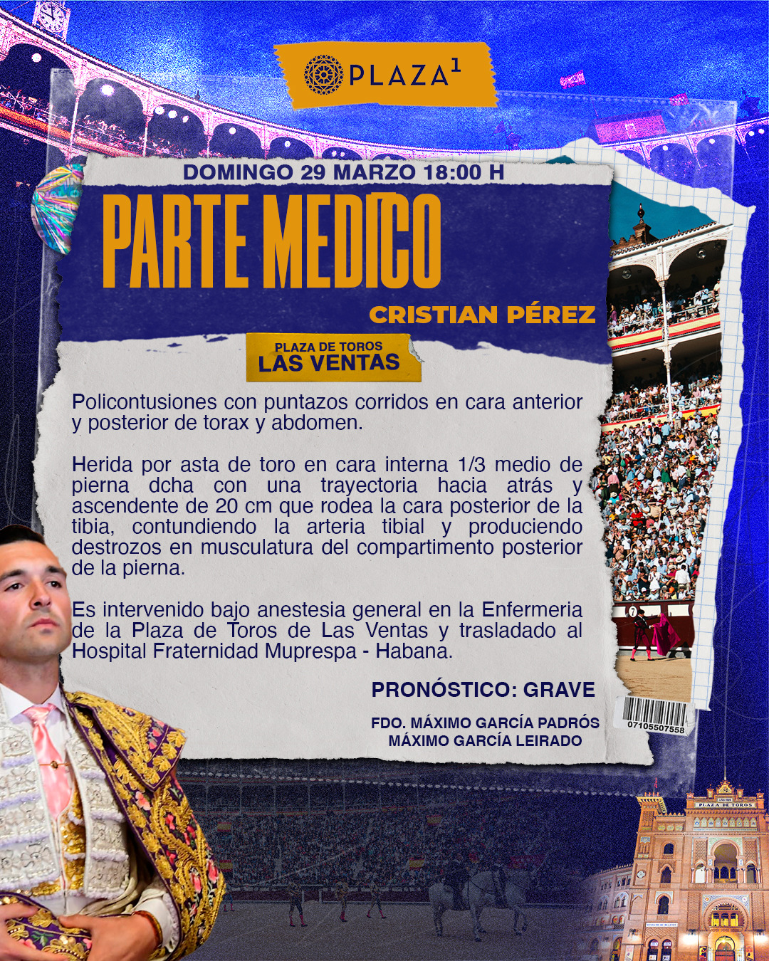 Finalmente, Pérez agradece a Dios que la cogida no tuviera consecuencias más graves y se muestra consciente de la suerte que tuvo: “He vuelto a nacer y Dios me lo ha puesto en el día que debía”. Este fue el parte médico emitido en la plaza:
