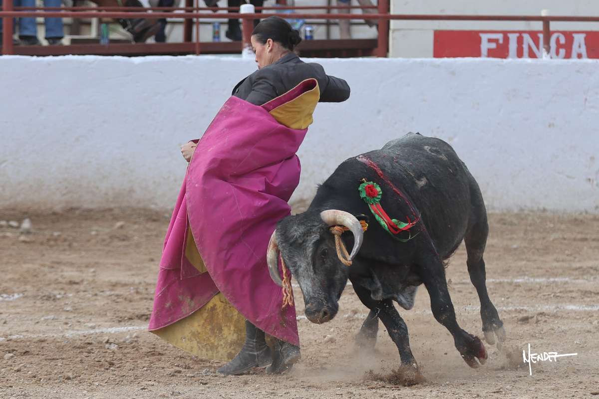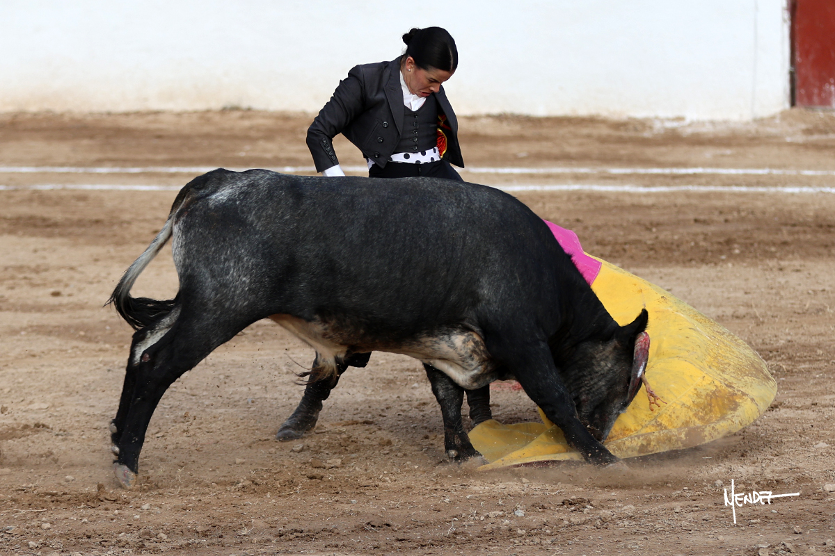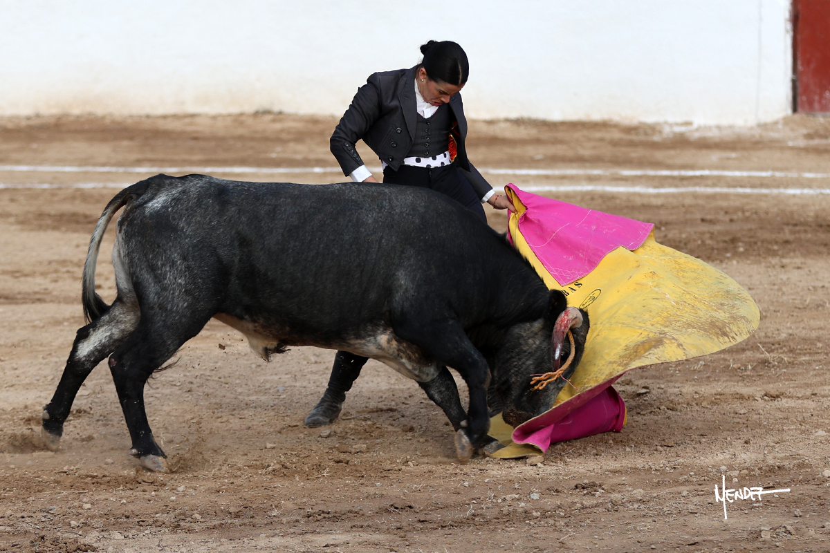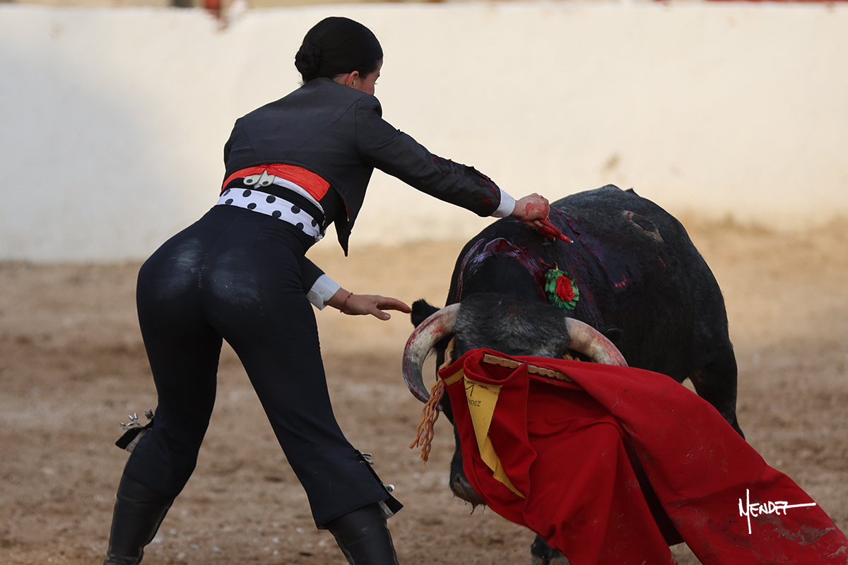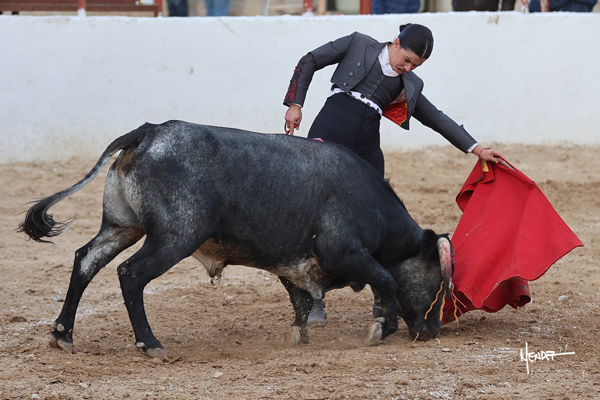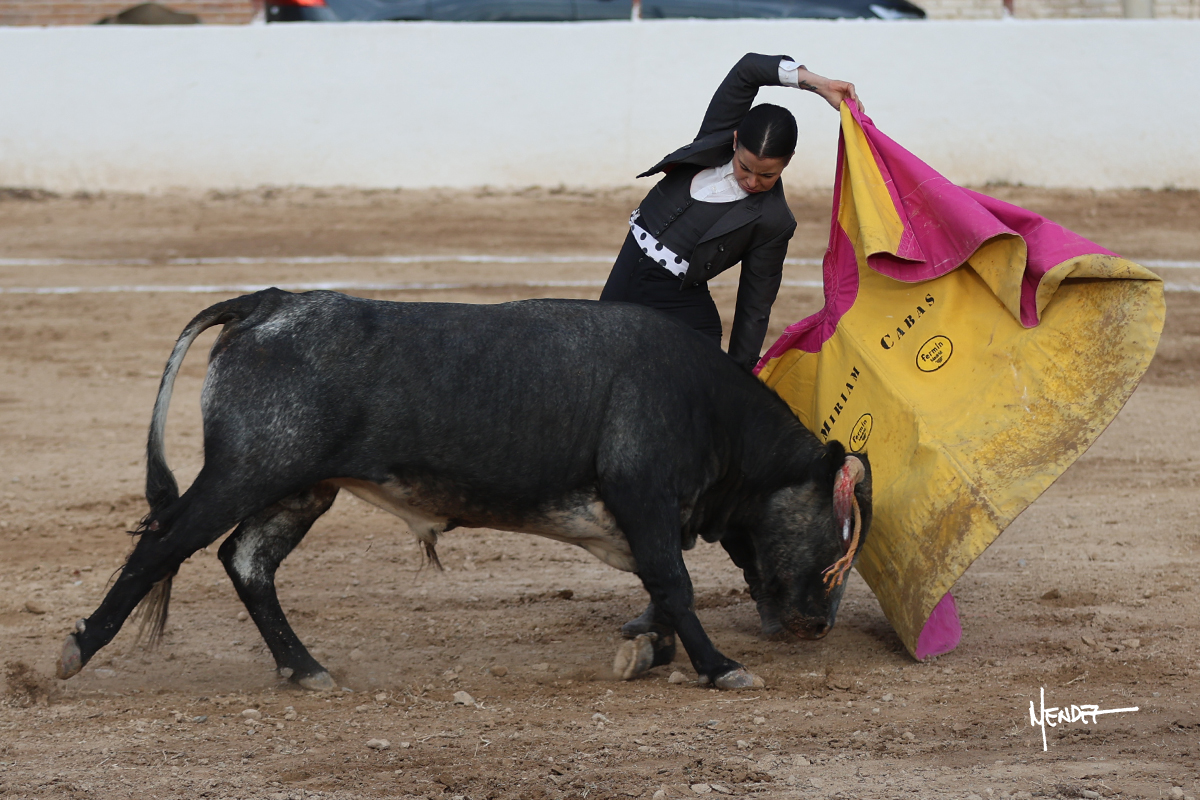 Míriam Cabas se lo echó la cadera en un saludo dotado de gusto y mucha torería, pero sobre todo de determinación ante el animal. Empezó su faena de muleta por abajo, ganándole terreno rápidamente para llevárselo a los medios. Le buscó el sitio y la altura para llevarlo sobre el derecho. Lo toreó también al natural, uno a uno, luchando contra el viento y la embestida de un animal con celo, repitiendo con ritmo. Se encajó y se lo envolvió sobre el izquierdo, con profundidad y largura, uno a uno. Configuró una faena completa.