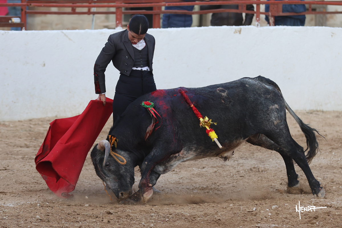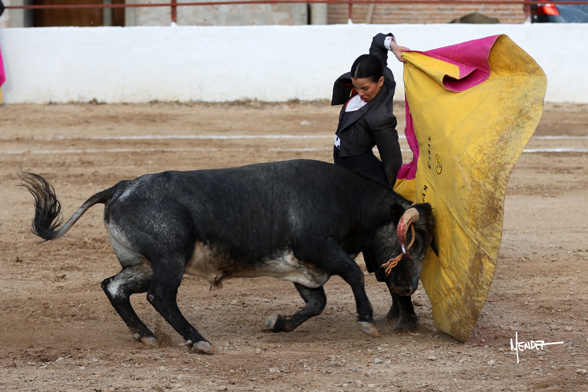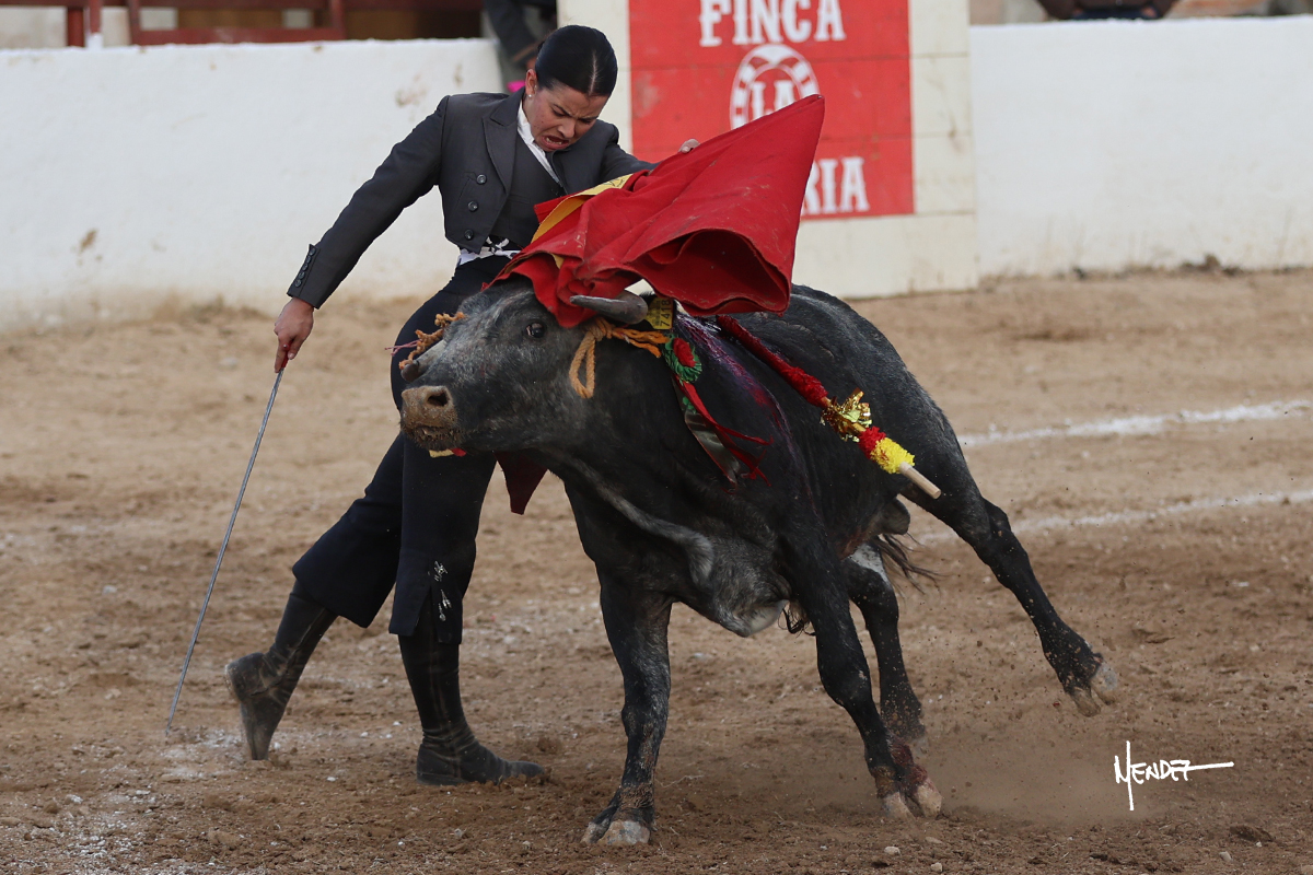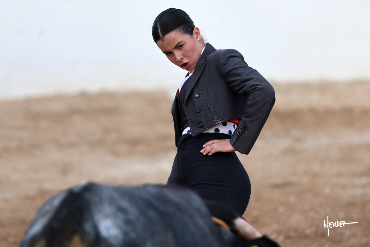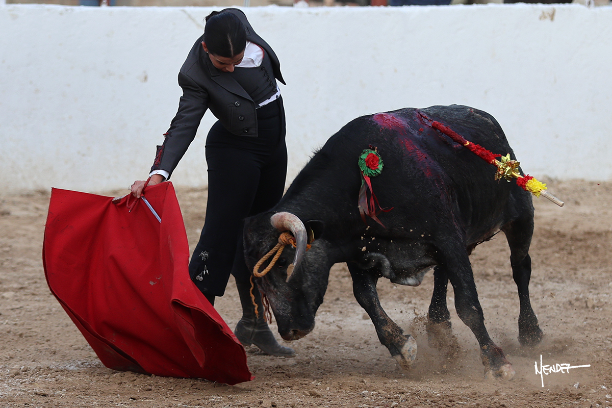 Míriam Cabas se lo echó la cadera en un saludo dotado de gusto y mucha torería, pero sobre todo de determinación ante el animal. Empezó su faena de muleta por abajo, ganándole terreno rápidamente para llevárselo a los medios. Le buscó el sitio y la altura para llevarlo sobre el derecho. Lo toreó también al natural, uno a uno, luchando contra el viento y la embestida de un animal con celo, repitiendo con ritmo. Se encajó y se lo envolvió sobre el izquierdo, con profundidad y largura, uno a uno. Configuró una faena completa.