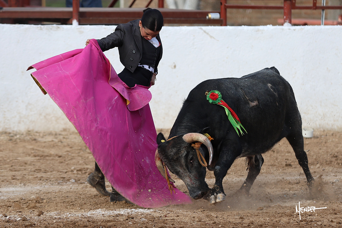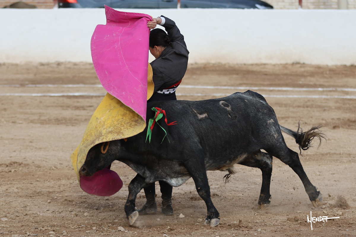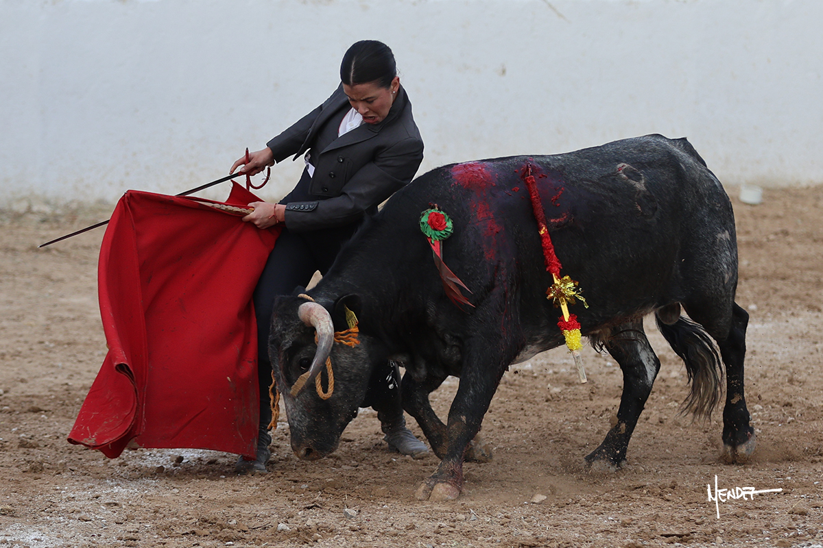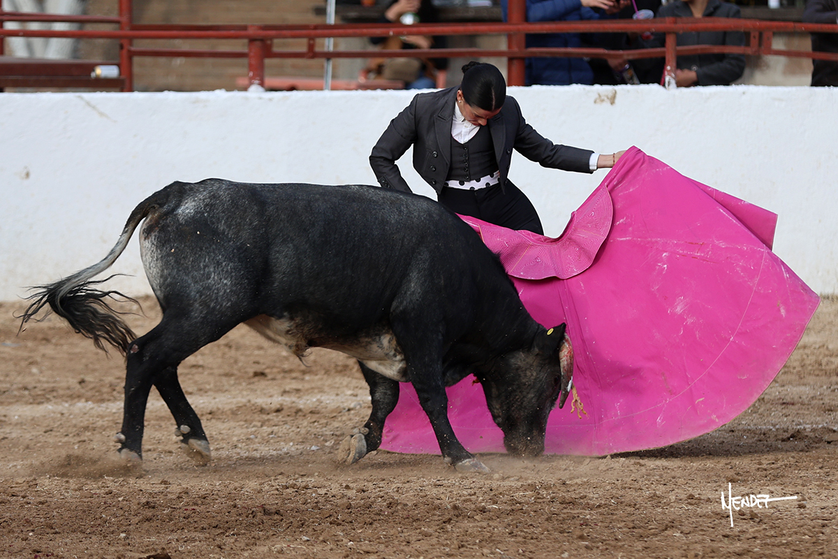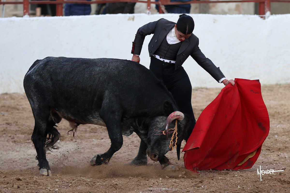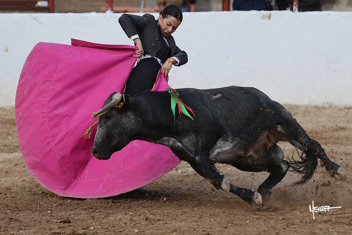 Míriam Cabas se lo echó la cadera en un saludo dotado de gusto y mucha torería, pero sobre todo de determinación ante el animal. Empezó su faena de muleta por abajo, ganándole terreno rápidamente para llevárselo a los medios. Le buscó el sitio y la altura para llevarlo sobre el derecho. Lo toreó también al natural, uno a uno, luchando contra el viento y la embestida de un animal con celo, repitiendo con ritmo. Se encajó y se lo envolvió sobre el izquierdo, con profundidad y largura, uno a uno. Configuró una faena completa.