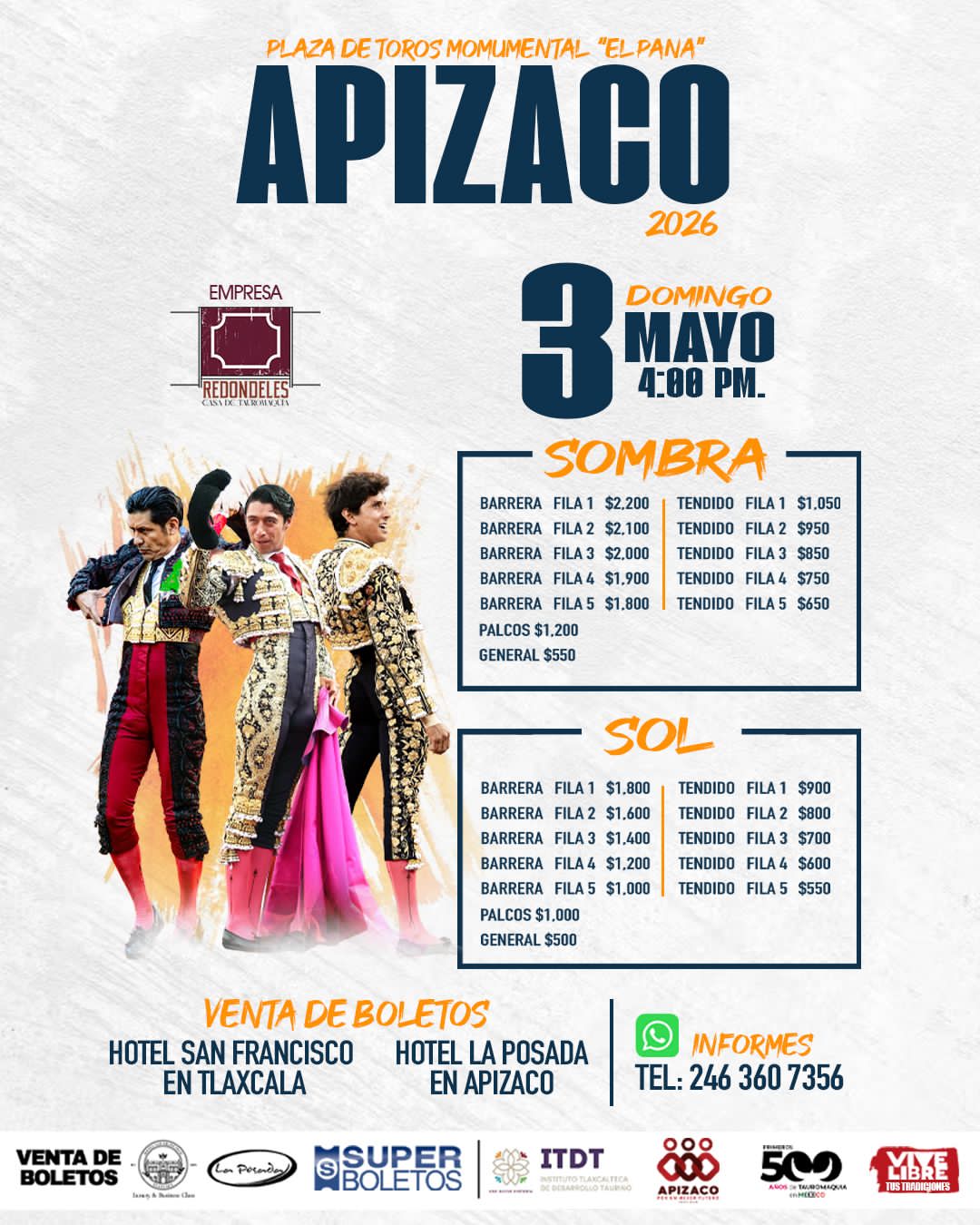 La empresa Redondeles-Casa de Tauromaquia comenzó la venta de boletos para la corrida del próximo 3 de mayo en Apizaco, donde harán el paseíllo Uriel Moreno «El Zapata», Sergio Flores y Andrés Roca Rey, para lidiar un encierro de Villa Carmela. Los boletos desde 500 pesos estarán a la venta a través de la plataforma electrónica Superboletos.com y en los hoteles San Francisco, de Tlaxcala y La Posada, en Apizaco, respectivamente, mientras que en las taquillas de la plaza estarán a la venta el día de la corrida, que comenzará a partir de las 16:00 horas.