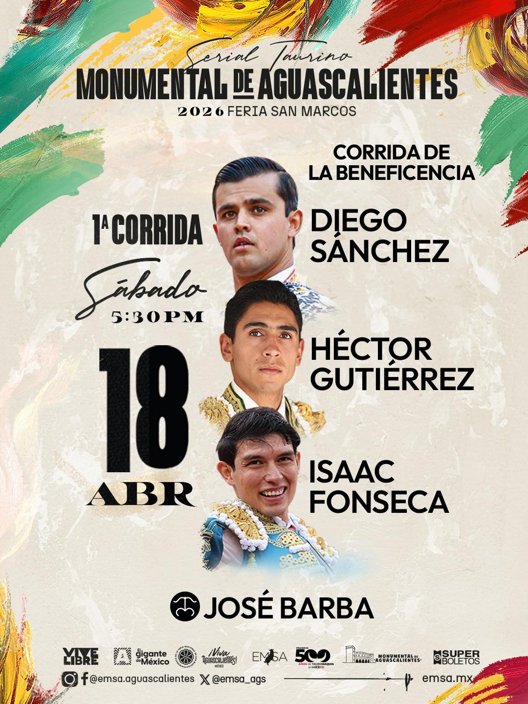 Los toros de la ganadería de José Barba ya fueron reseñados por las autoridades y todo está listo para la primera corrida de la Feria de San Marcos, para ser lidiados este sábado 18 de abril en la Monumental de Aguascalientes, corrida que será a beneficio de la Academia Taurina Municipal Alfonso Ramírez «El Calesero», en la que están anunciados Diego Sánchez, Héctor Gutiérrez e Isaac Fonseca, a partir de las 17:30 horas.