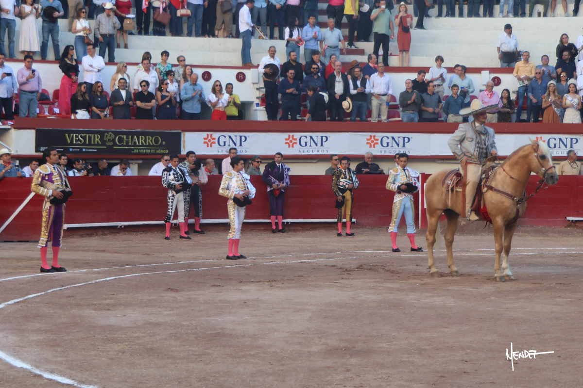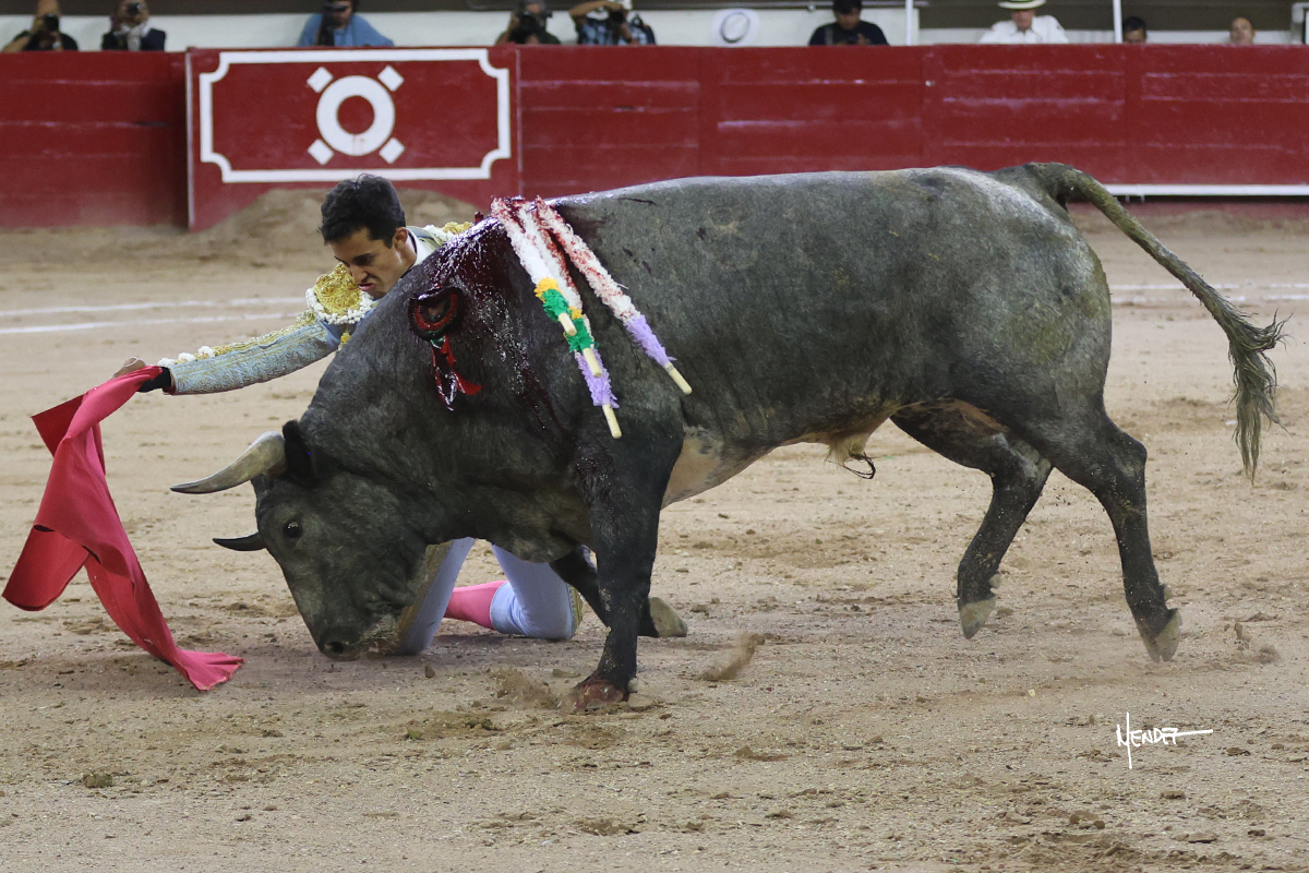 Leo Valadez bregó al cuarto, poco a poco lo fue encelando hasta poder encelarse con el hasta sacarlo más allá del tercio. Se fue a los medios para desarrollar su correspondiente quite. Él mismo banderilleó al cuarto, dejando un par esperándolo en el estribo para después ponerlo al violín. Brindó a Fernando Ocho y comenzó su faena de muleta en los medios, de rodillas, toreándolo sin probaturas, para después levantarse y rematar aquel emocionante inicio. Le dio tiempo y sitio para después continuar en aquellos terrenos sobre el pitón derecho de un animal que atendió con prontitud y que metía la cara abajo, aunque metiéndose por dentro en alguna que otra ocasión. El animal se prestaba al toreo largo y profundo, mostrando celo en sus embestidas, dándole ritmo, ligazón y emoción a las series. Se adornó dándole tiempo antes de comenzar a llevarlo sobre el izquierdo, dándole salida, cruzándose para después envolvérselo. Aunque cada vez se quedaba más corto, el animal iba totalmente embebido en la muleta, mostrando nobleza y entrega ante las demandas del diestro. Culminó con unas manoletinas de rodillas y una estocada al segundo intento.
