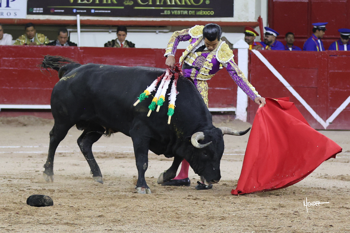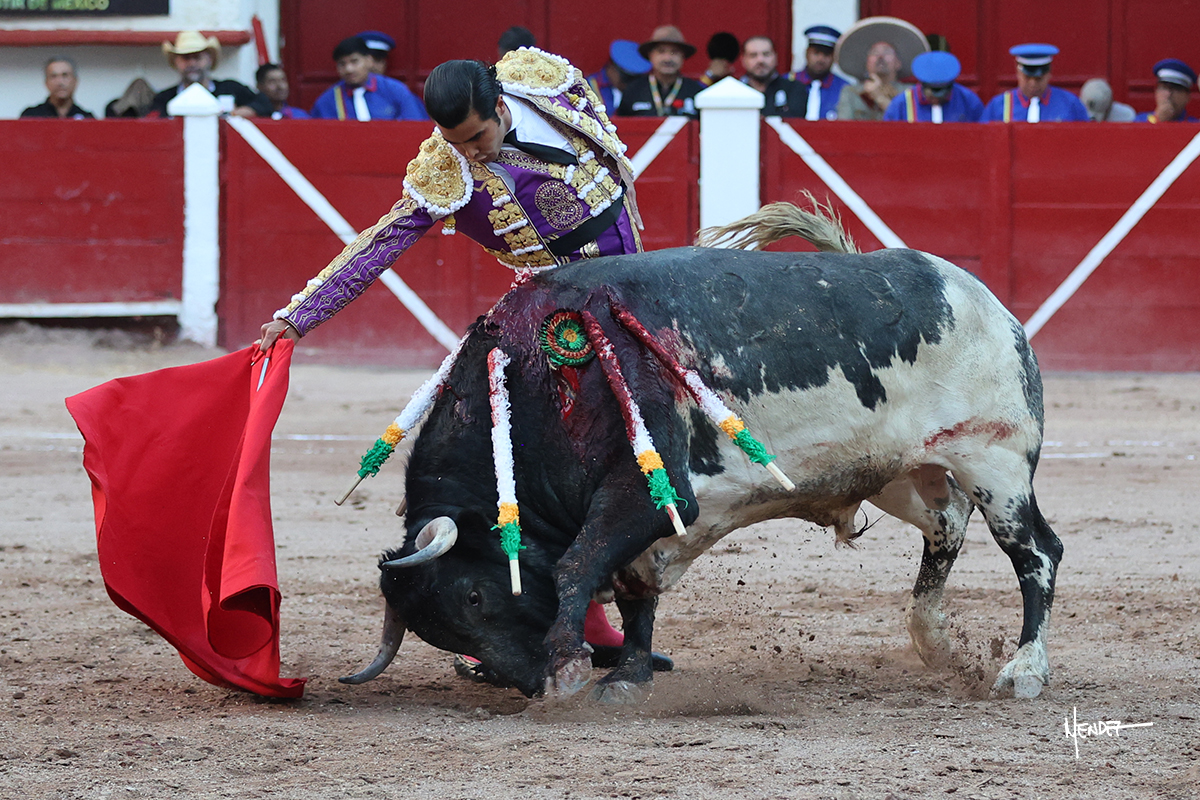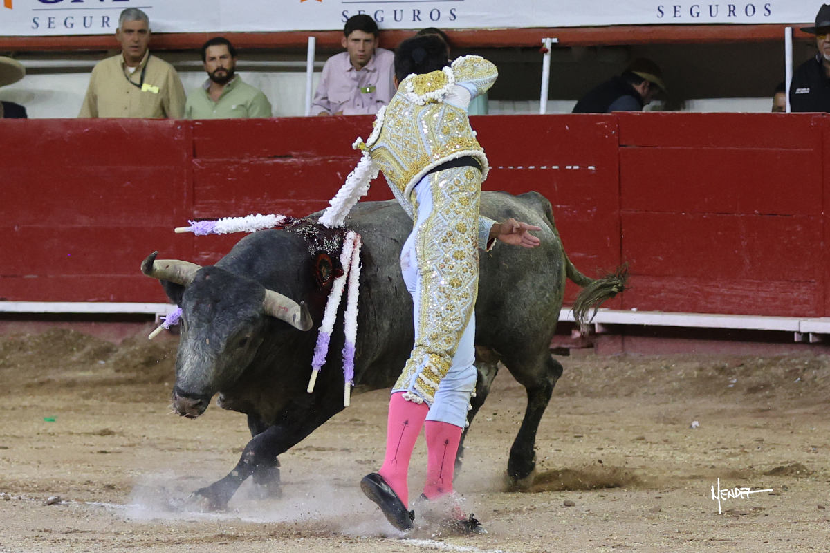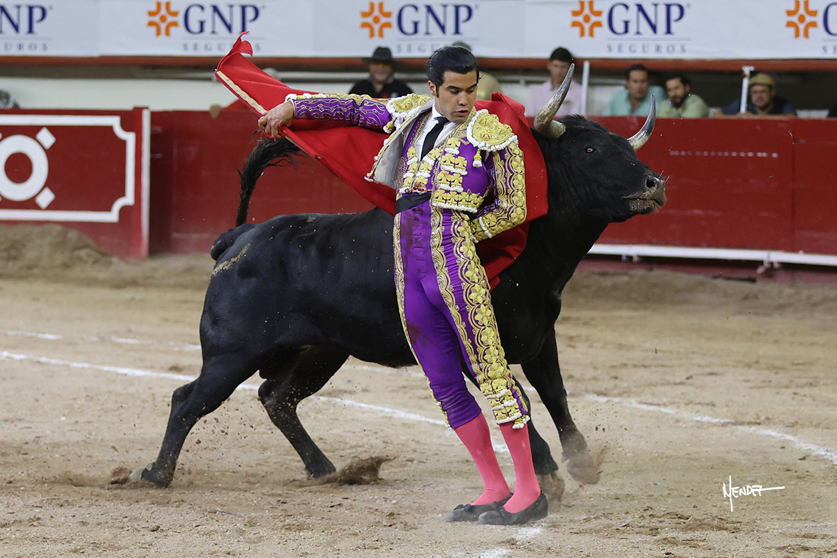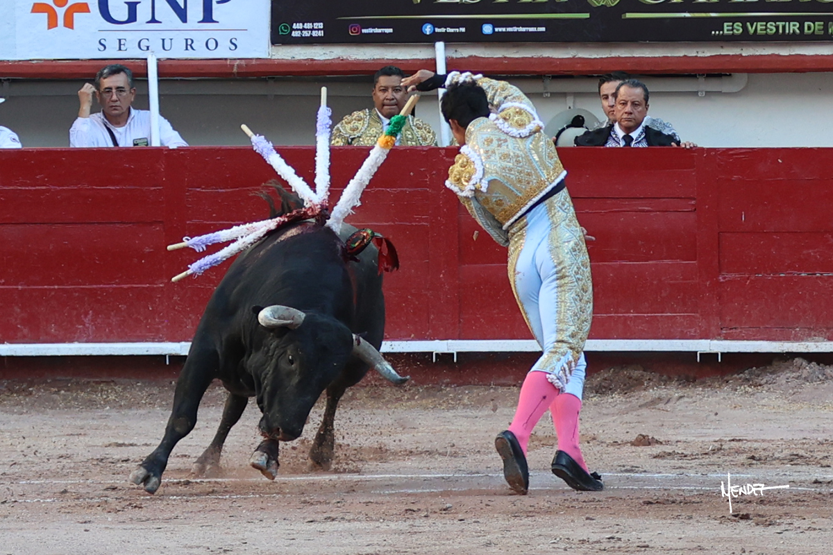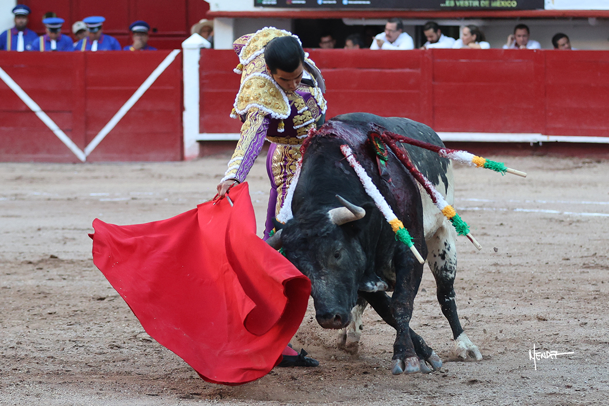 Leo Valadez se fue directo a recibir a portagayola al primero de la tarde. Después siguió con un farol desde los mismos medios, continuó por verónicas y chicuelinas hasta rematarlo con una larga cordobesa. Utilizó su turno de quites para lucirse con variedad y torería, sobre todo por tafalleras. Además, protagonizó el tercio de banderillas, poniéndolas con acierto y determinación. El único de faena fue toda una declaración de intenciones con la muleta a la espalda. Lo cambió de terrenos y en los medios siguió sobre el derecho, llevándolo largo a media altura, teniendo que insistirle con mucha voz para fijarlo y meterlo. Se tragaba los dos primeros muletazos. El animal se vino a menos, pero las embestidas que le robó Valadez calaron con fuerzo en los tendidos. Continuó al natural, uno a uno, en una faena muy meritoria, en la que estuvo por encima de las circunstancias, acortando las distancias para hacérselo tragar. Se lo alcanzó a envolver y culminó con unas manoletinas muy ajustadas. Se tiró con todo, pero el animal no dobló, así que tuvo que descabellar.