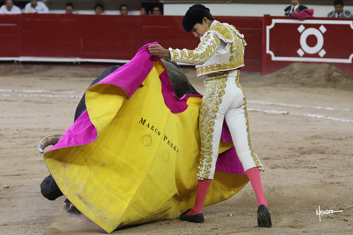 Marco Pérez saludó al sexto de rodillas junto a las tablas, esperando a que el animal entrara en su capote. Después lo lanceó a la verónica mientras le ganaba terreno y lo llevaba a los medios, donde lo remató con una media. Comenzó su faeno moviéndolo, cambiándole los terrenos para sacarlo con habilidad a los medios. Se decidió por el pitón derecho, en un tira y afloja constante por las distancias y la altura. Lo pasaba, pero el de Begoña era complejo, por lo que paró y recompuso sobre el derecho, tratando de darle ritmo. El animal se le quedaba muy parado, muy encima, por lo que deslucía el muletazo por mucho que lo intentara Marco, que trató de adornarse y buscar las teclas a aquel complejo sexto. Lo intentó por el izquierdo, pero seguía sin pasar.